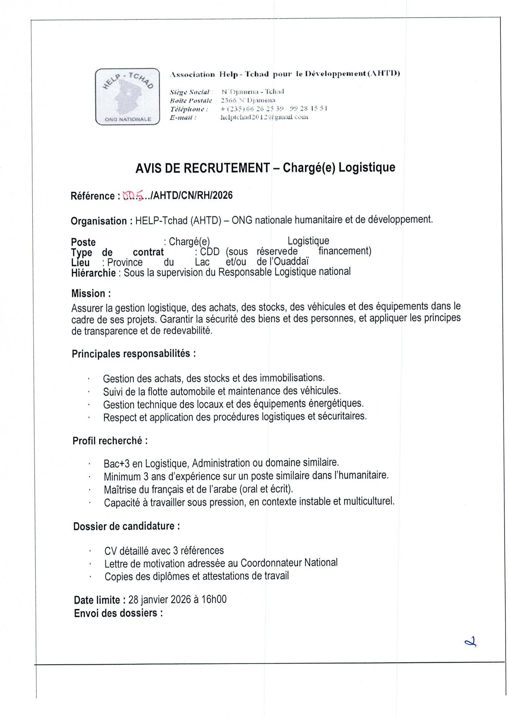 L’Association Help-Tchad pour le Développement (AHTD) recrute un Chargé Logistique (H/F), Province du Lac, Ouaddaï, Tchad Jan 20, 2026 L’Association Help-Tchad pour le Développement (AHTD) recrute un Chargé Logistique (H/F), Province du Lac, Ouaddaï, Tchad Share on FacebookTweetFollow usSaveLe Conseil Norvégien pour les Réfugiés recrute un(e) HR & Administration Manager, N’Djamena, TchadDans le cadre du projet RAPAR, la CARITAS Suisse lance un avis d’appel d’offres pour le recrutement d’un prestataire de services financiers pour la distribution du cash aux ménages vulnérables du département du Batha-Est et Assinet, TchadCatholic Relief Services recrute pour le poste de Deputy Chief of Party-Programming/Chef de Bureau, Farchana, TchadAppel à candidatures pour les bourses Erasmus Mundus EMLE, Europe