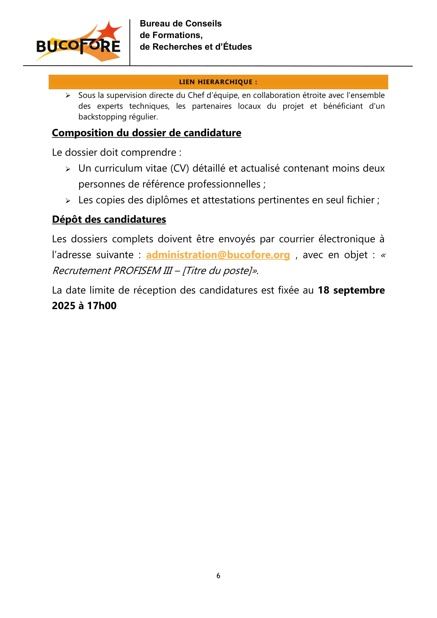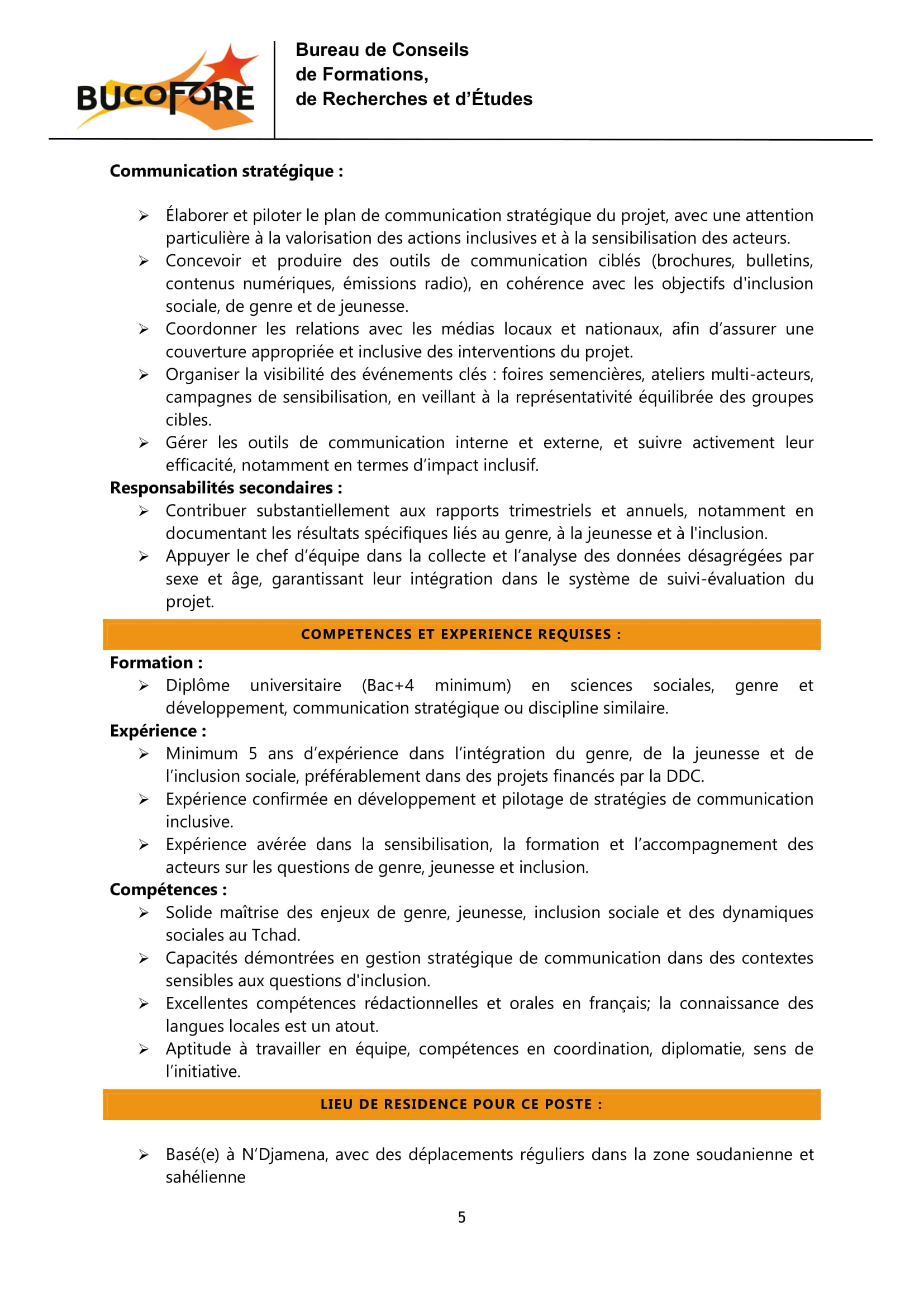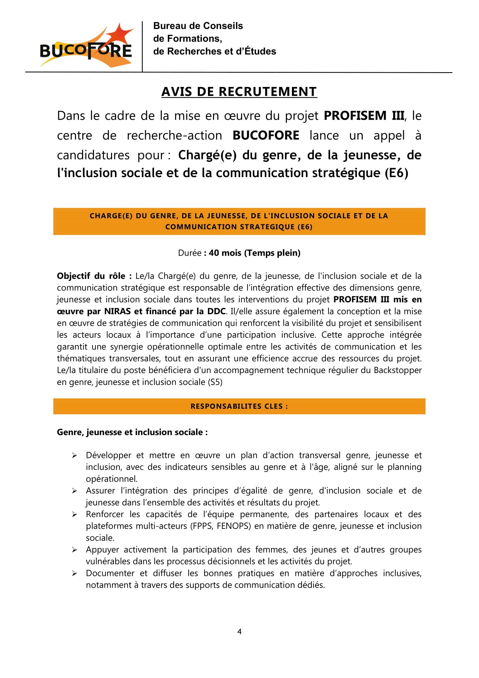 Le Bureau de Conseils de Formation, de Recherches et d’Etudes (BUCOFORE) recrute un(e) chargé(e) du genre, de la jeunesse, de l’inclusion sociale et de la communication stratégique (E6), N’Djamena, Tchad