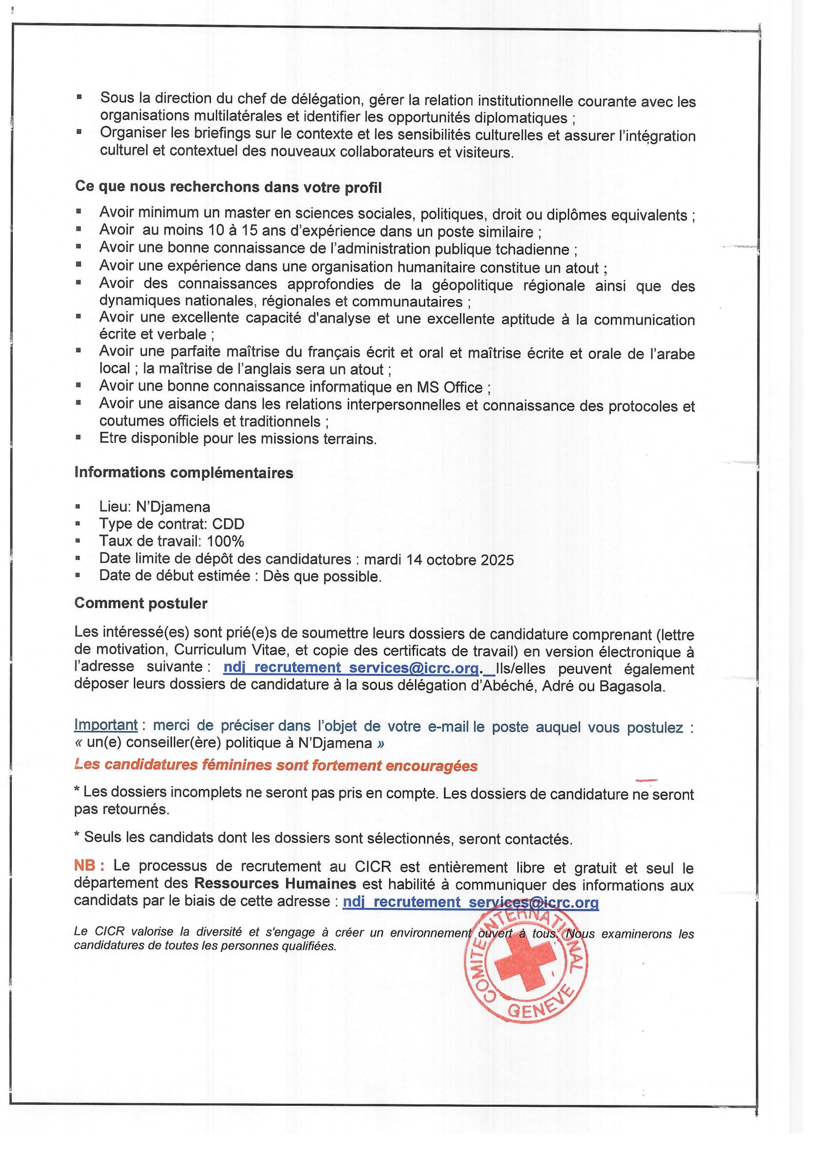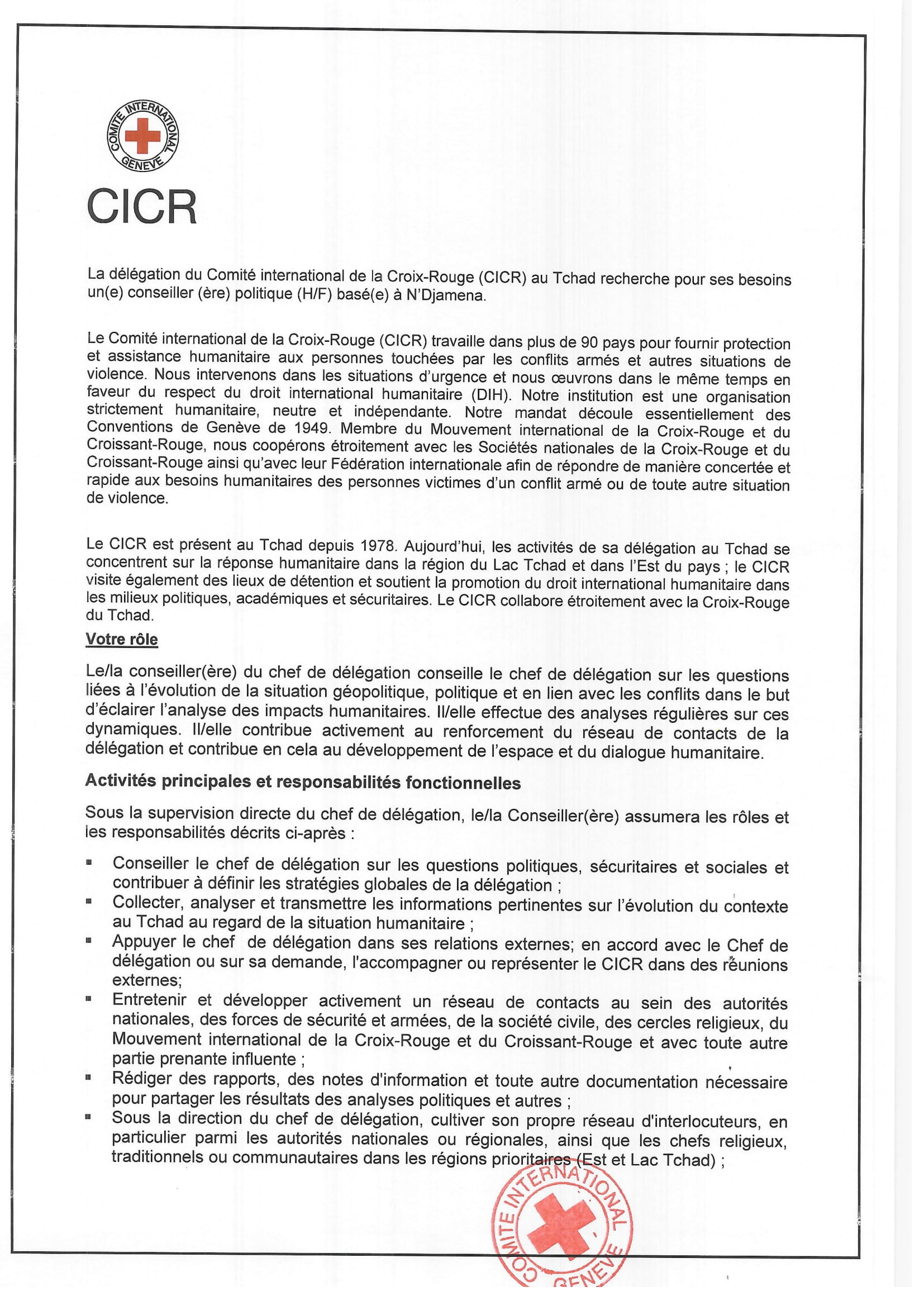 Le Comité International de la Croix-Rouge (CICR) cherche pour ses besoins un conseiller politique (H/F), N’Djamena, Tchad Oct 2, 2025 Le Comité International de la Croix-Rouge (CICR) cherche pour ses besoins un conseiller politique (H/F), N’Djamena, Tchad Share on FacebookTweetFollow usSaveMSF recrute un superviseur sage-femme, Aboutengue, TchadLa CARITAS SUISSE lance un avis d’appel d’offre restreinte achat des matériels aratoires au profit de 750 producteurs maraichers, Grande Sido, Monts de Lam, Nya-Pendé, de Barh Sara et la Moula, TchadL’association NOE lance un avis d’appel d’offre pour le recrutement d’un infirmier diplômé d’état (H/F), Parc de Noé, TchadLa FAO (Organisation des Nations Unies pour l’Alimentation et l’Agriculture) lance un appel à manifestation d’intérêt pour le Programme de Stages pour l’Afrique (RAF), Afrique