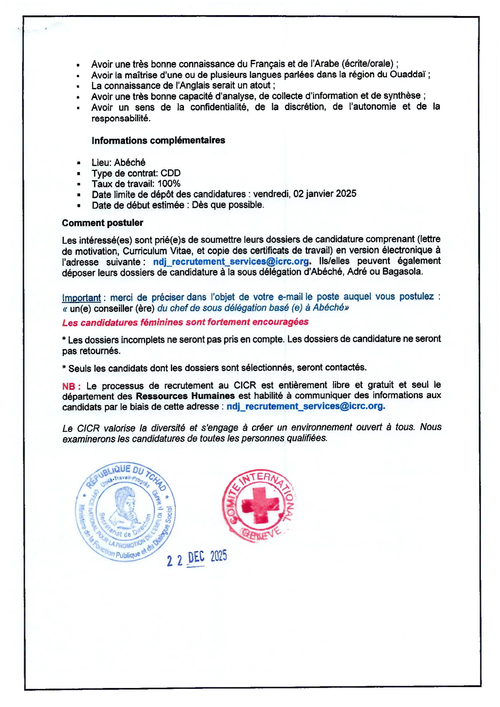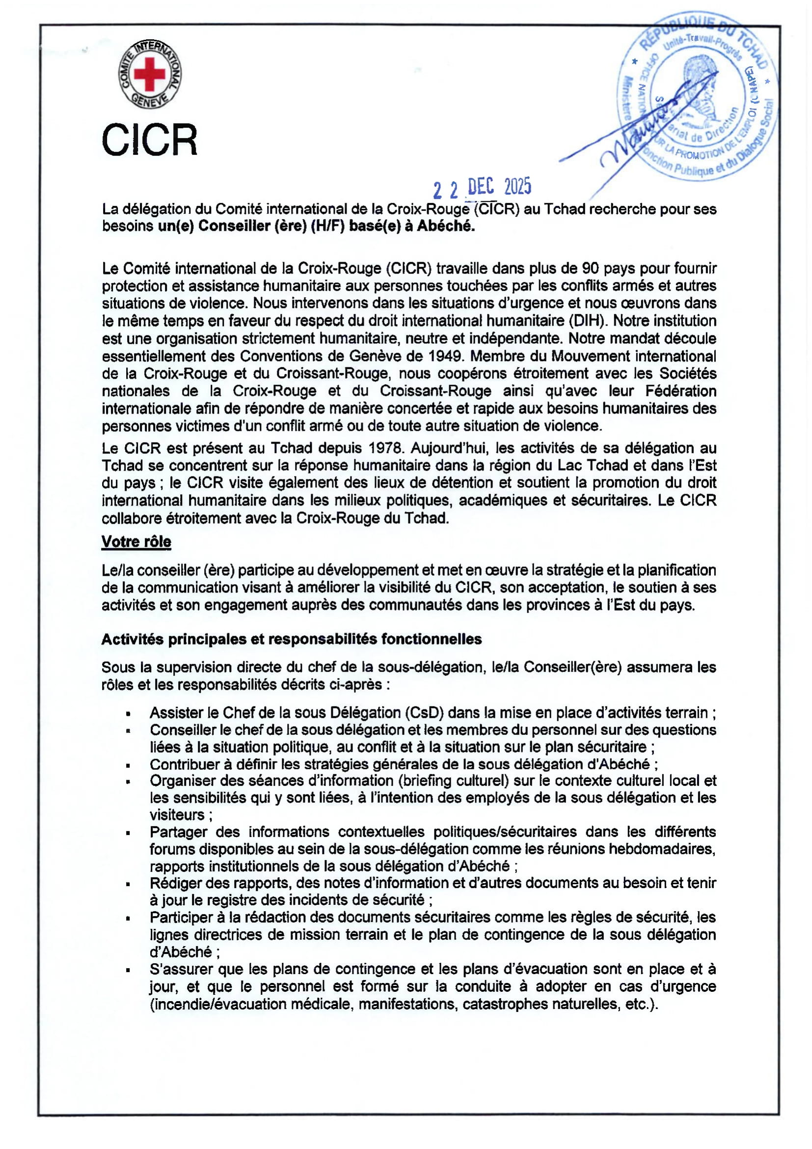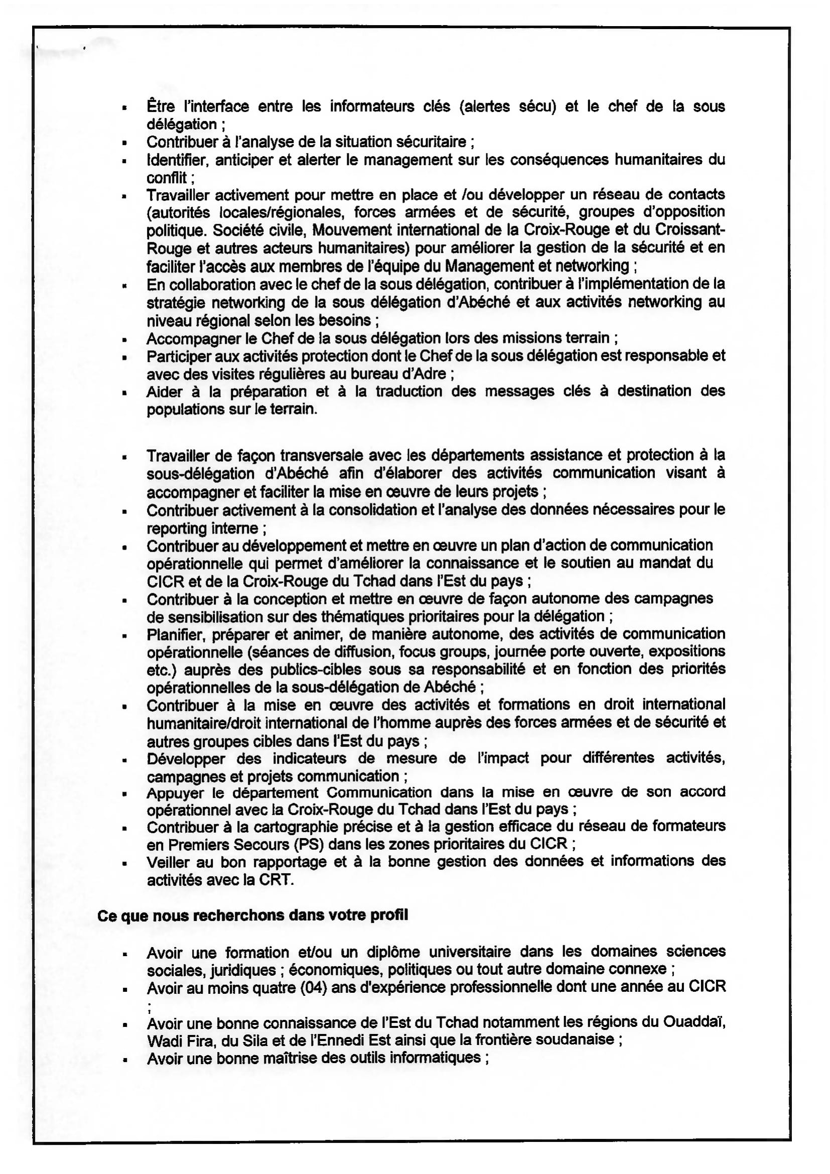 Le Comité International de la Croix-Rouge (CICR) recrute un conseiller (H/F), Abéché, Tchad Déc 22, 2025 Le Comité International de la Croix-Rouge (CICR) recrute un conseiller (H/F), Abéché, Tchad Share on FacebookTweetFollow usSaveGIZ recrute un conseiller(e) en gouvernance locale, Moundou, TchadCICR recrute deux comptables (H/F) basé(e)s à Adré/Bagasola, TchadUNICEF recrute un(e) Chargé(e) de programme Nutrition, Bol, TchadSolidaridad West Africa lance un avis de recrutement externe de Gestionnaire de centre de service rural Moundou ou Kelo, Tchad