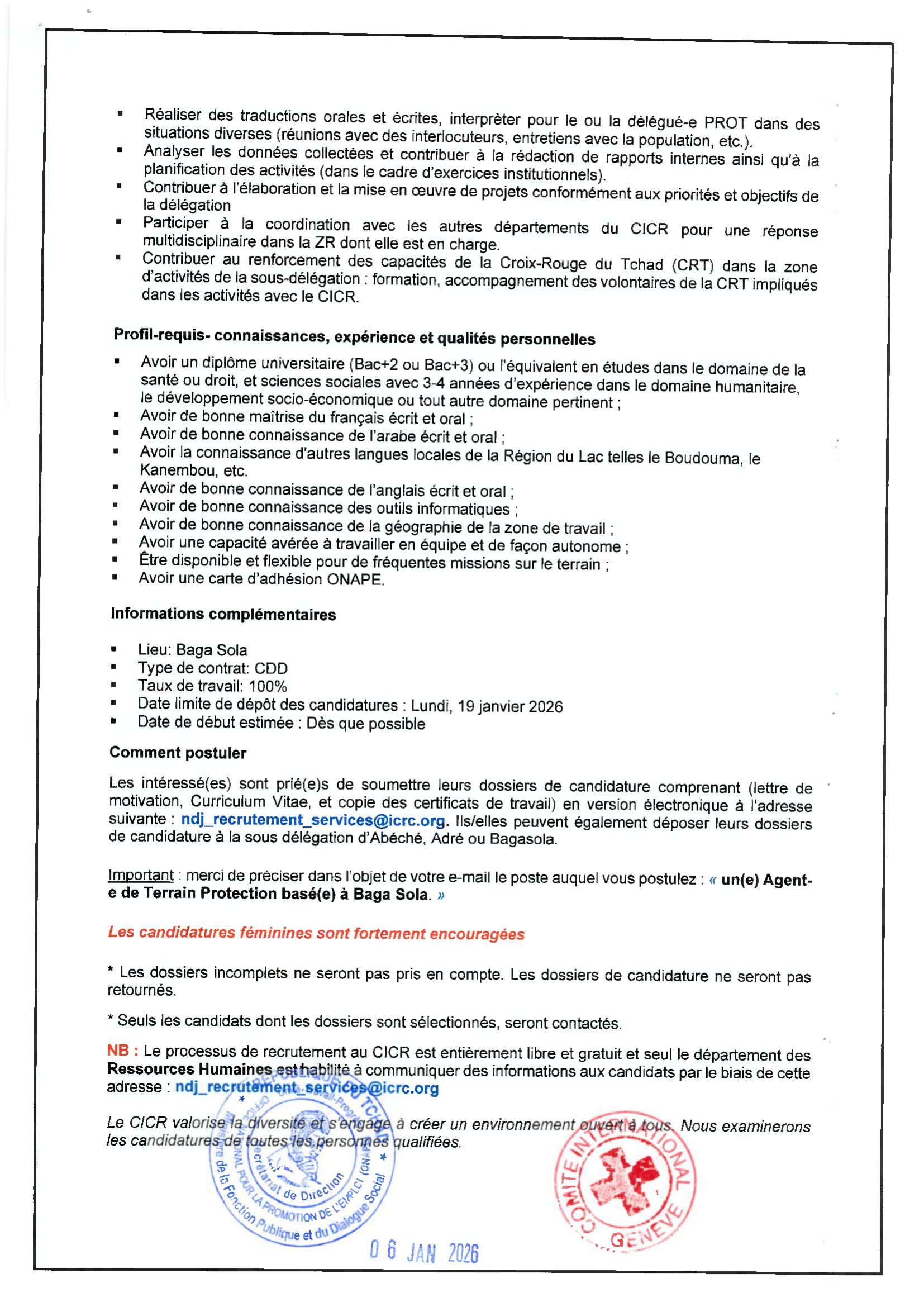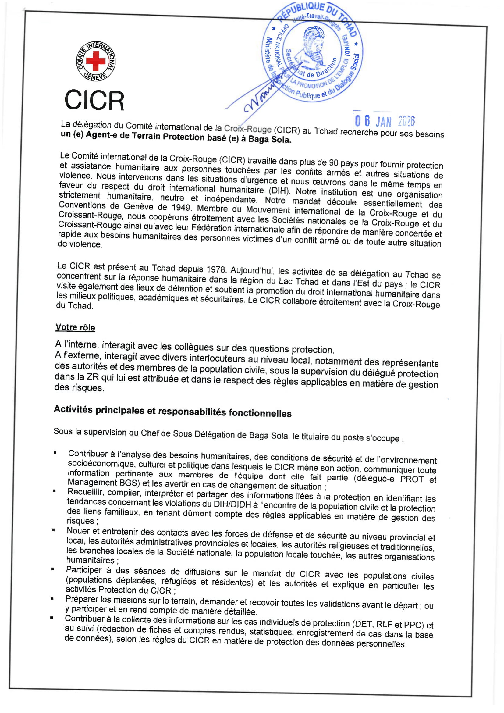 Le Comité International de la Croix-Rouge (CIRC) recrute un agent de Terrain Protection (H/F), Baga Sola, Tchad Jan 7, 2026 Le Comité International de la Croix-Rouge (CIRC) recrute un agent de Terrain Protection (H/F), Baga Sola, Tchad Share on FacebookTweetFollow usSaveGIZ recrute un conseiller(e) en gouvernance locale, Moundou, TchadCICR recrute deux comptables (H/F) basé(e)s à Adré/Bagasola, TchadUNICEF recrute un(e) Chargé(e) de programme Nutrition, Bol, TchadSolidaridad West Africa lance un avis de recrutement externe de Gestionnaire de centre de service rural Moundou ou Kelo, Tchad