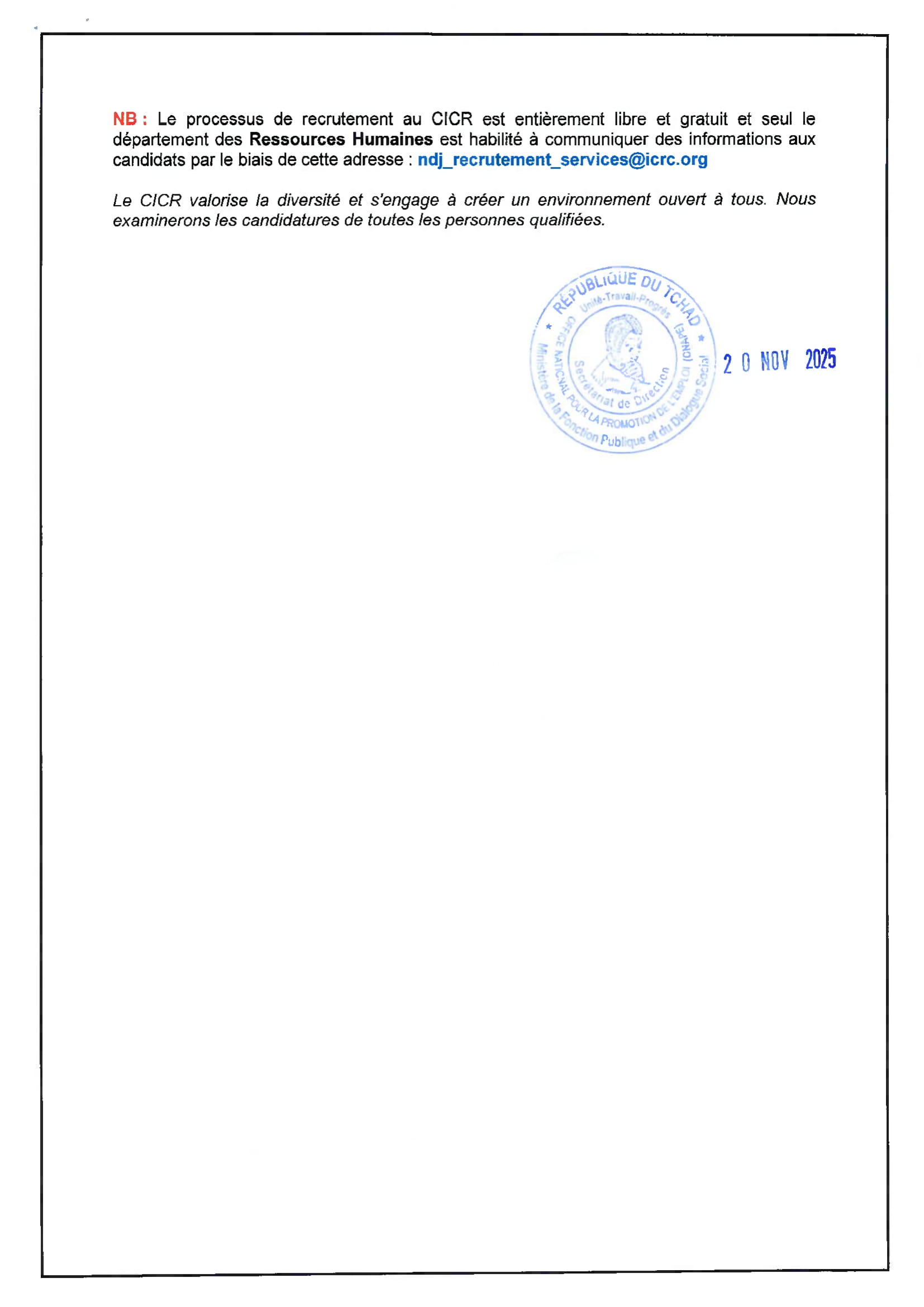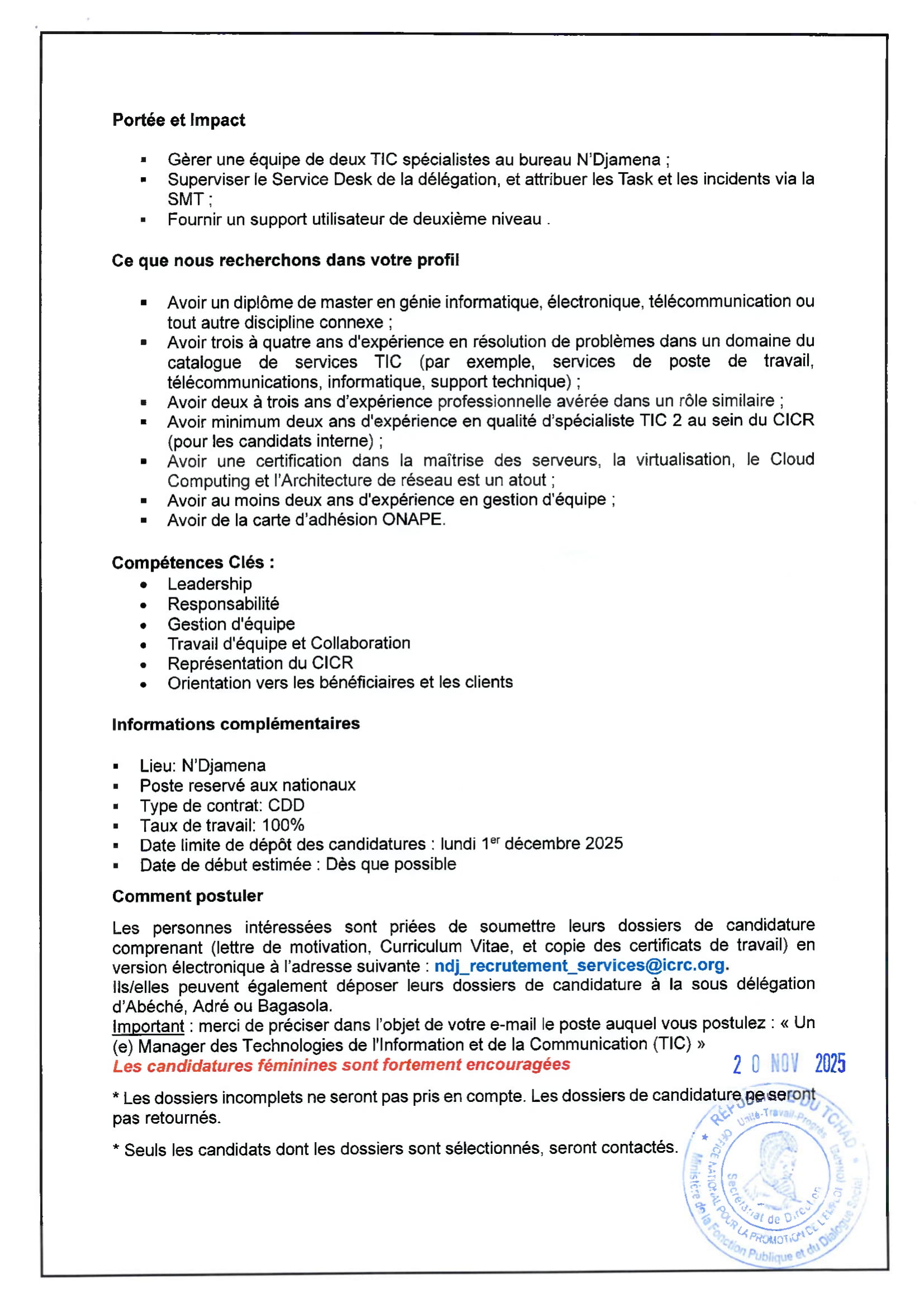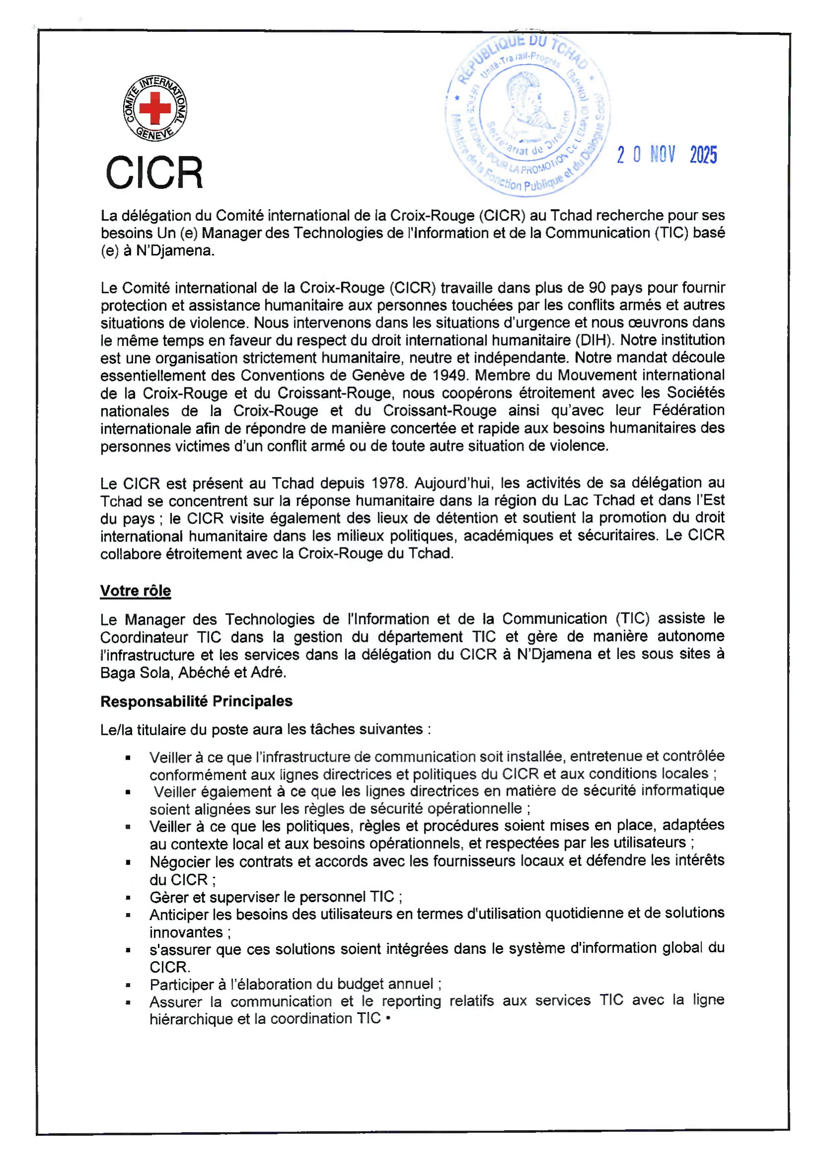 Le Comité International de la Croix-Rouge recrute un manager des technologies de l’information et de la communication, N’Djamena, Tchad Nov 20, 2025 Le Comité International de la Croix-Rouge recrute un manager des technologies de l’information et de la communication, N’Djamena, Tchad Share on FacebookTweetFollow usSaveLa Wildlife Conservation Society (WCS) lance un avis d’appel d’offres pour le recrutement d’un Consultant pour la réalisation d’une étude sur la taxation des éleveurs transhumants dans la zone de mise en œuvre du PAIRIAC, TchadAfrican Parks recrute pour le poste de responsable du développement communautaire, Parc National de Siniaka Minia, TchadCare recrute un stagiaire assistant projet feministes en action (H/F), Paris, FranceLe Conseil norvégien pour les réfugiés (NRC) recrute les Stagiaires au siège social, Norvège