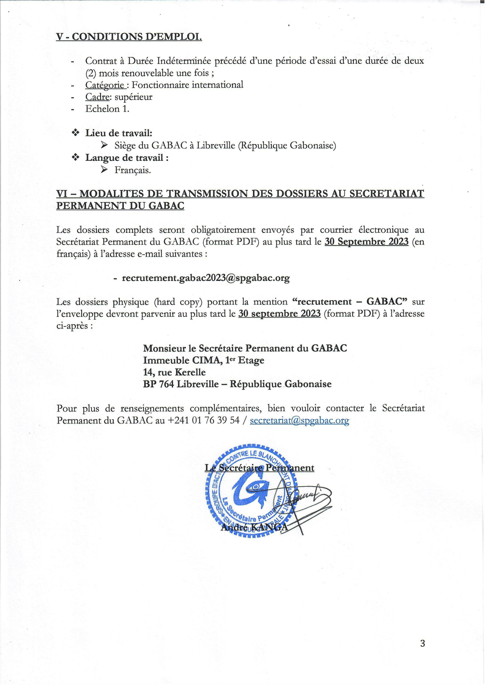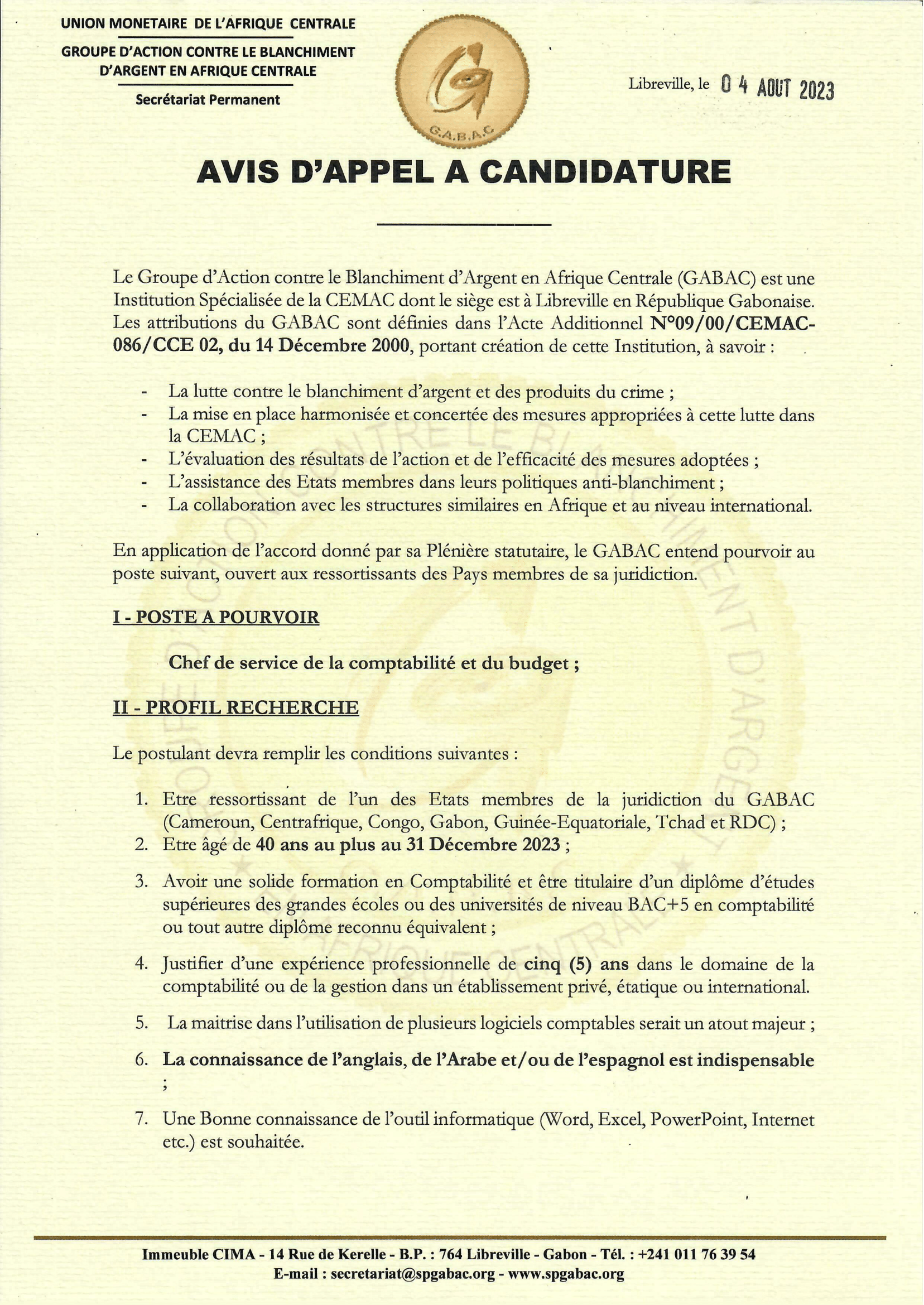 Le Groupe d’Action contre le Blanchiment d’Argent en Afrique Centrale (GABAC) lance un avis d’appel à candidature pour le poste de Chef de service de la comptabilité et du budget, Gabon