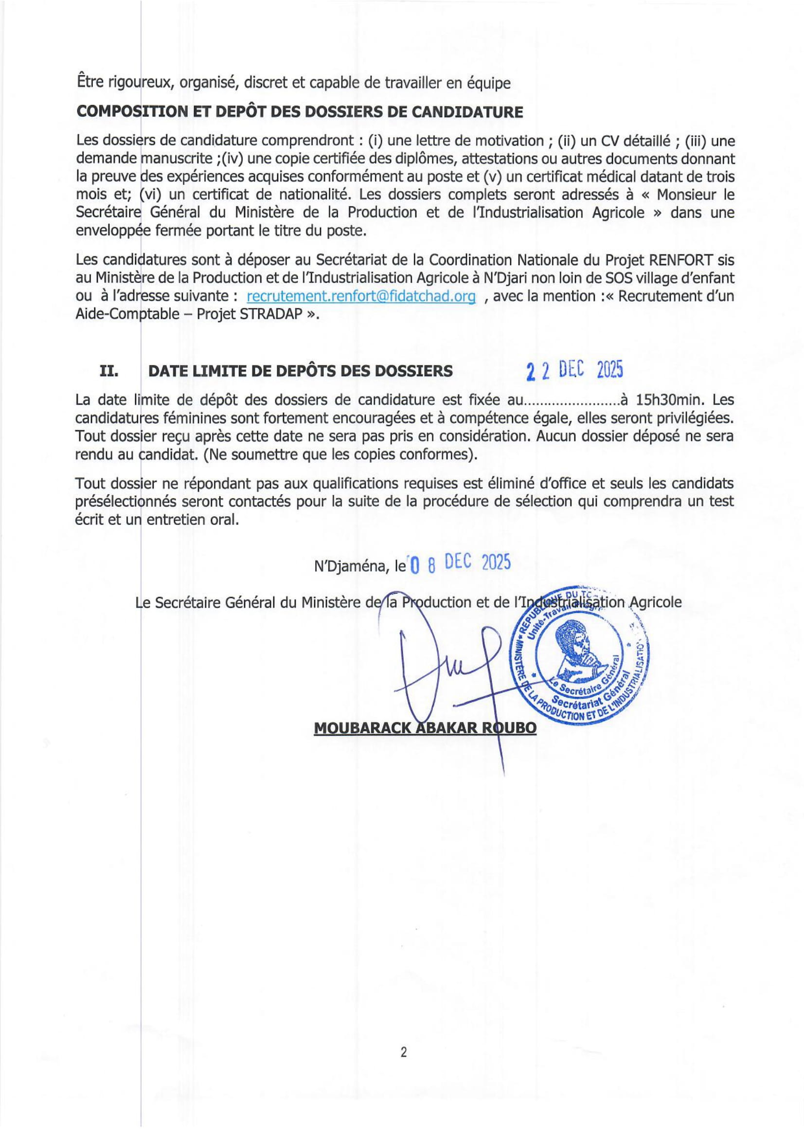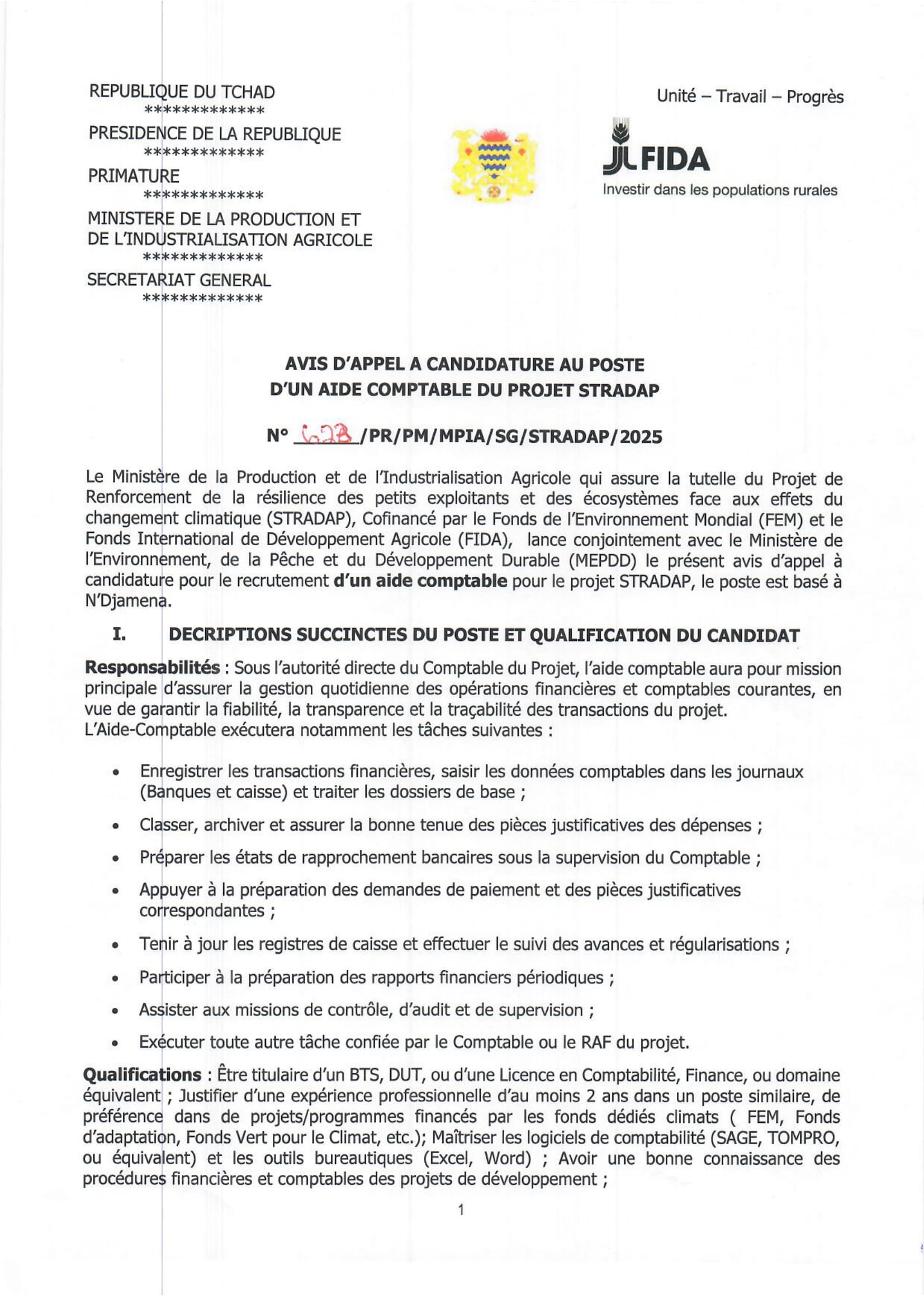Le Ministère de la Production et de l’Industrialisation Agricole lance un avis d’appel à candidature pour le recrutement d’un aide comptable pour le projet STRADAP, N’Djamena, Tchad