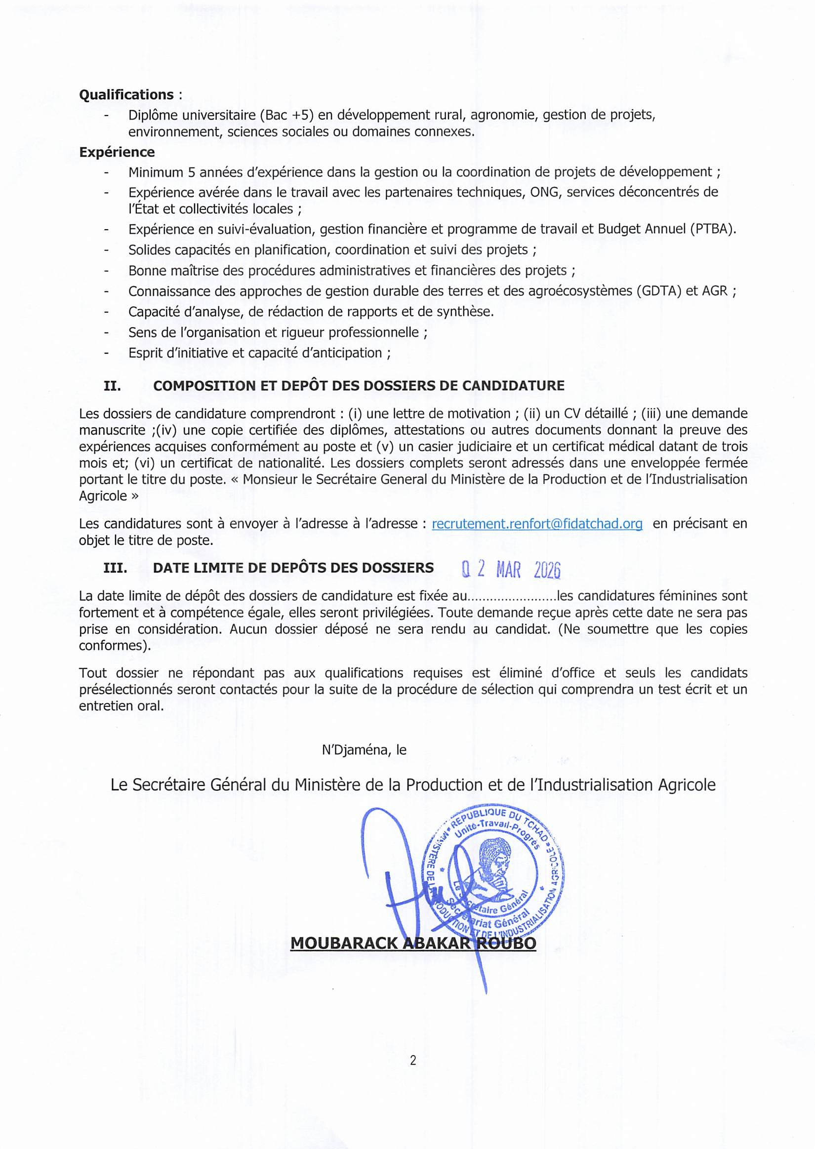 Le Ministère de la Production et de l’Industrialisation Agricole lance un avis d’appel à candidatures pour le poste de Chef d’Antenne du Projet RENFORT, Bol, Tchad
