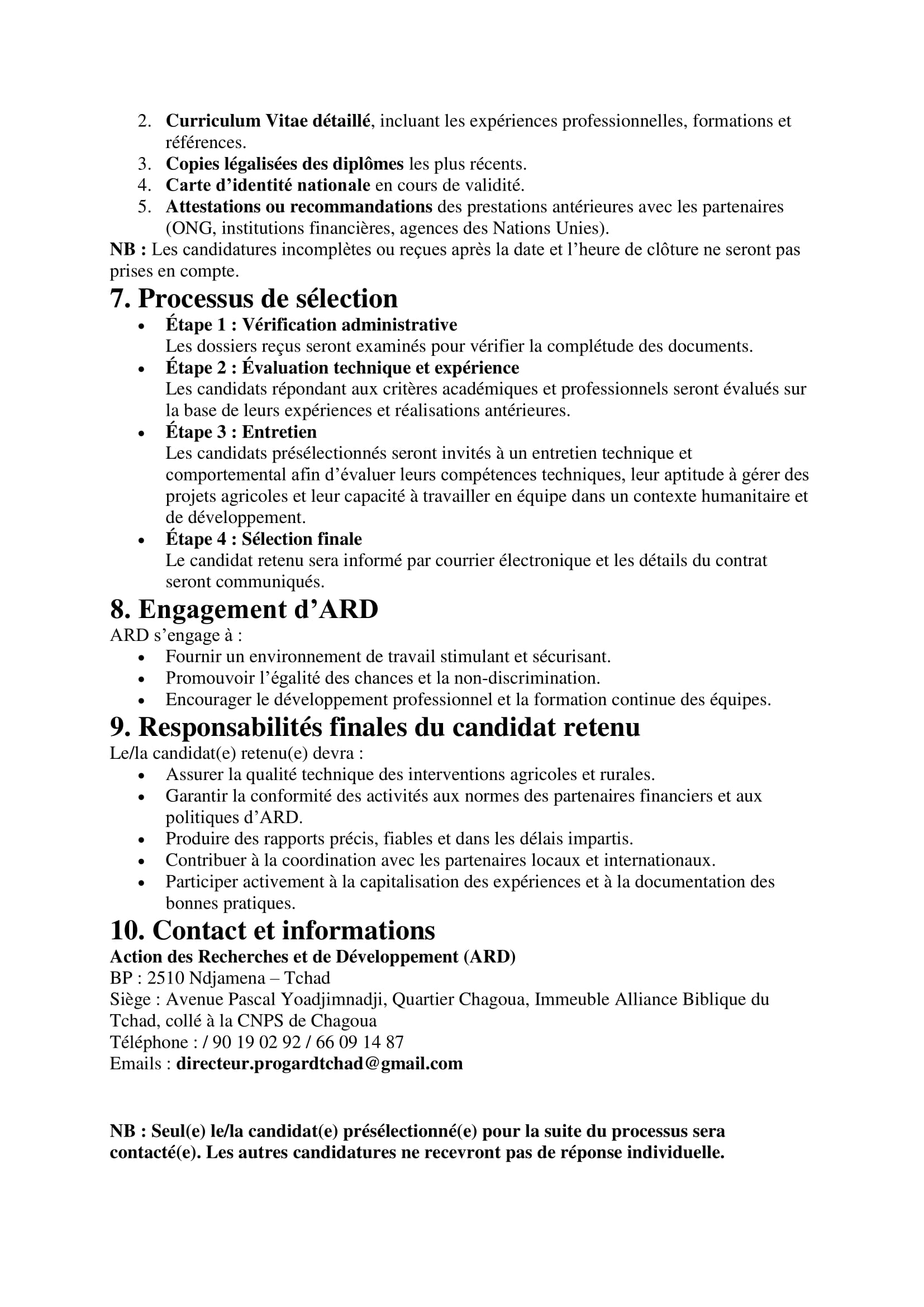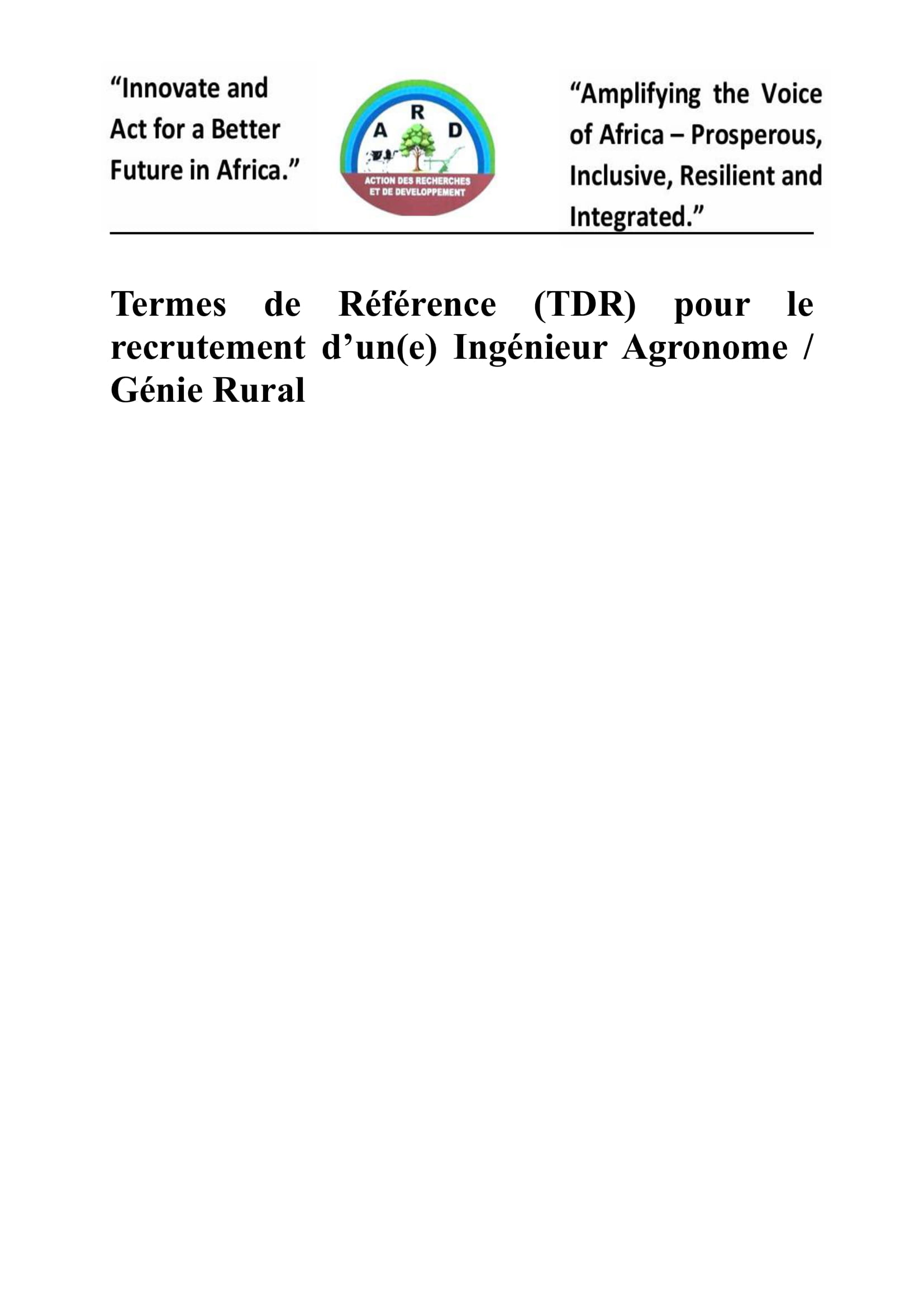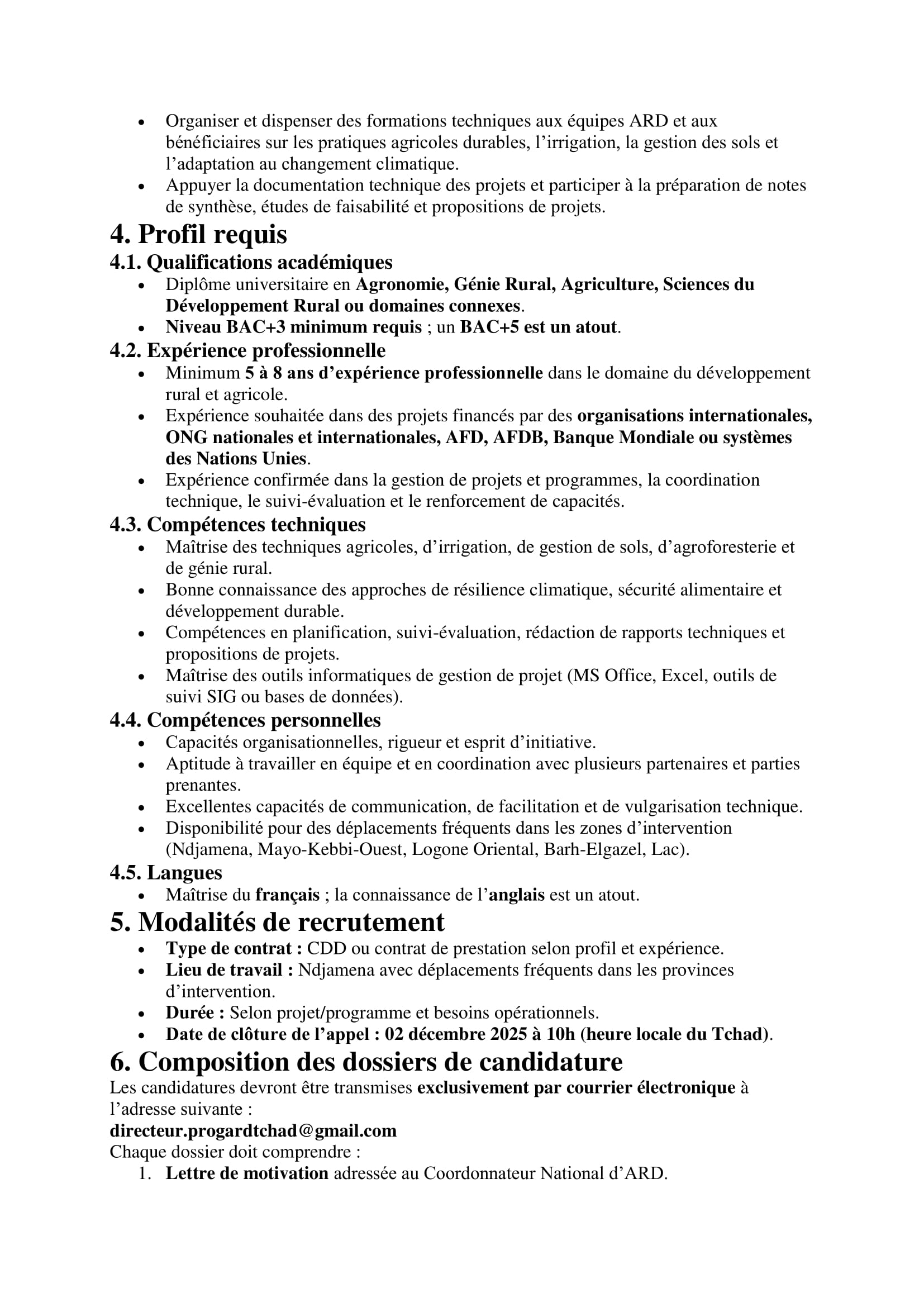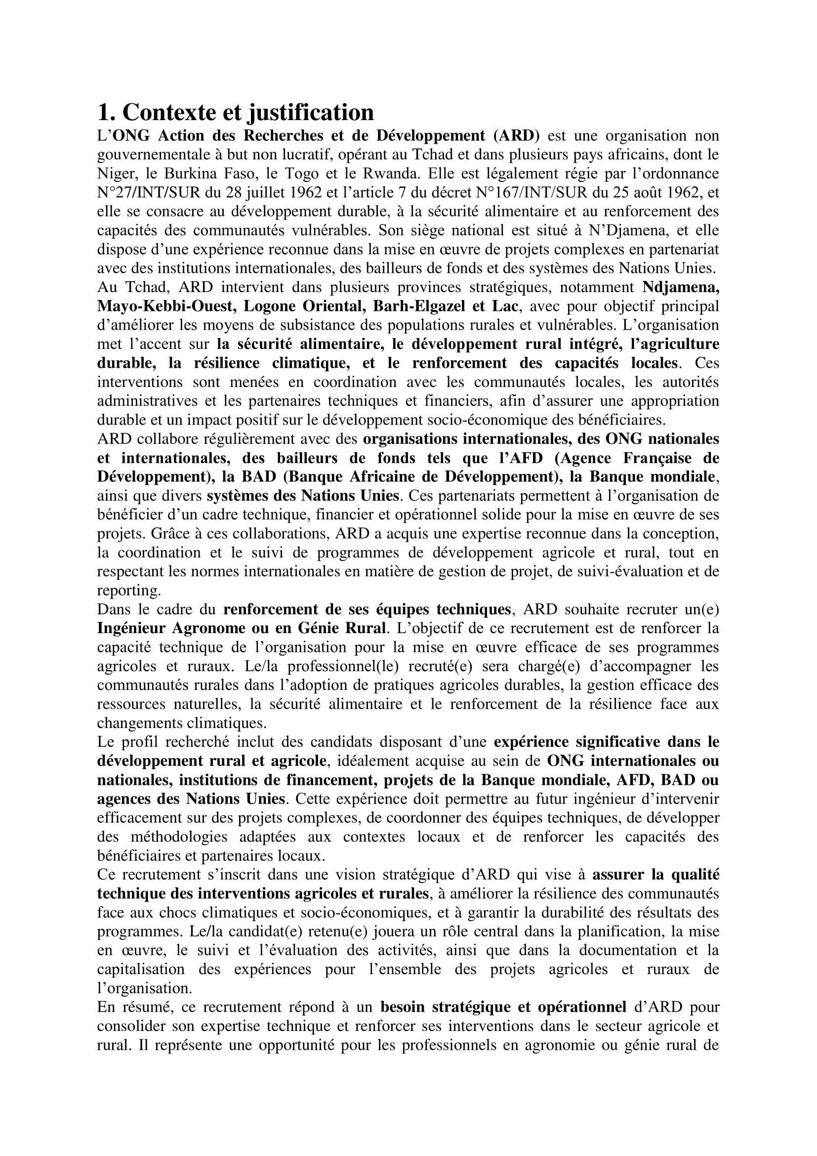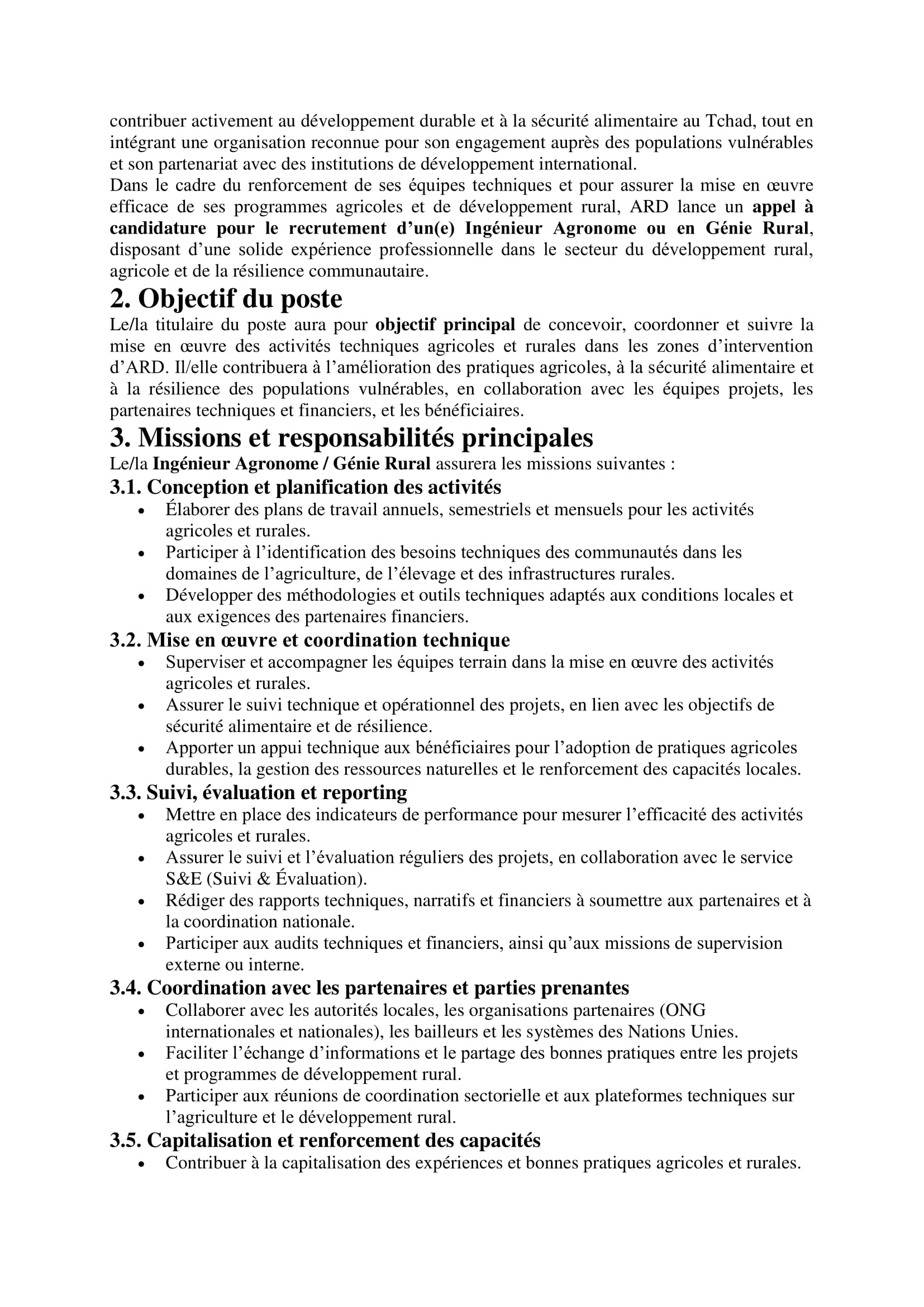 L’ONG Action des Recherches et Développement (ARD) recrute un ingénieur agronome, N’Djamena, Tchad Déc 2, 2025 L’ONG Action des Recherches et Développement (ARD) recrute un ingénieur agronome, N’Djamena, Tchad Share on FacebookTweetFollow usSave L’ONG Reporters sans frontières recrute un stagiaire en relations presse/communication (H/F),Paris, FranceUNICEF-TCHAD lance un avis d’appel d’offresLe Programme des Nations Unies pour les établissements humains (ONU-HABITAT) recherche un(e) Stagiaire en médias, Nairobi, KenyaLe Conseil danois pour les réfugiés recrute un spécialiste MHPSS, Adré, Tchad