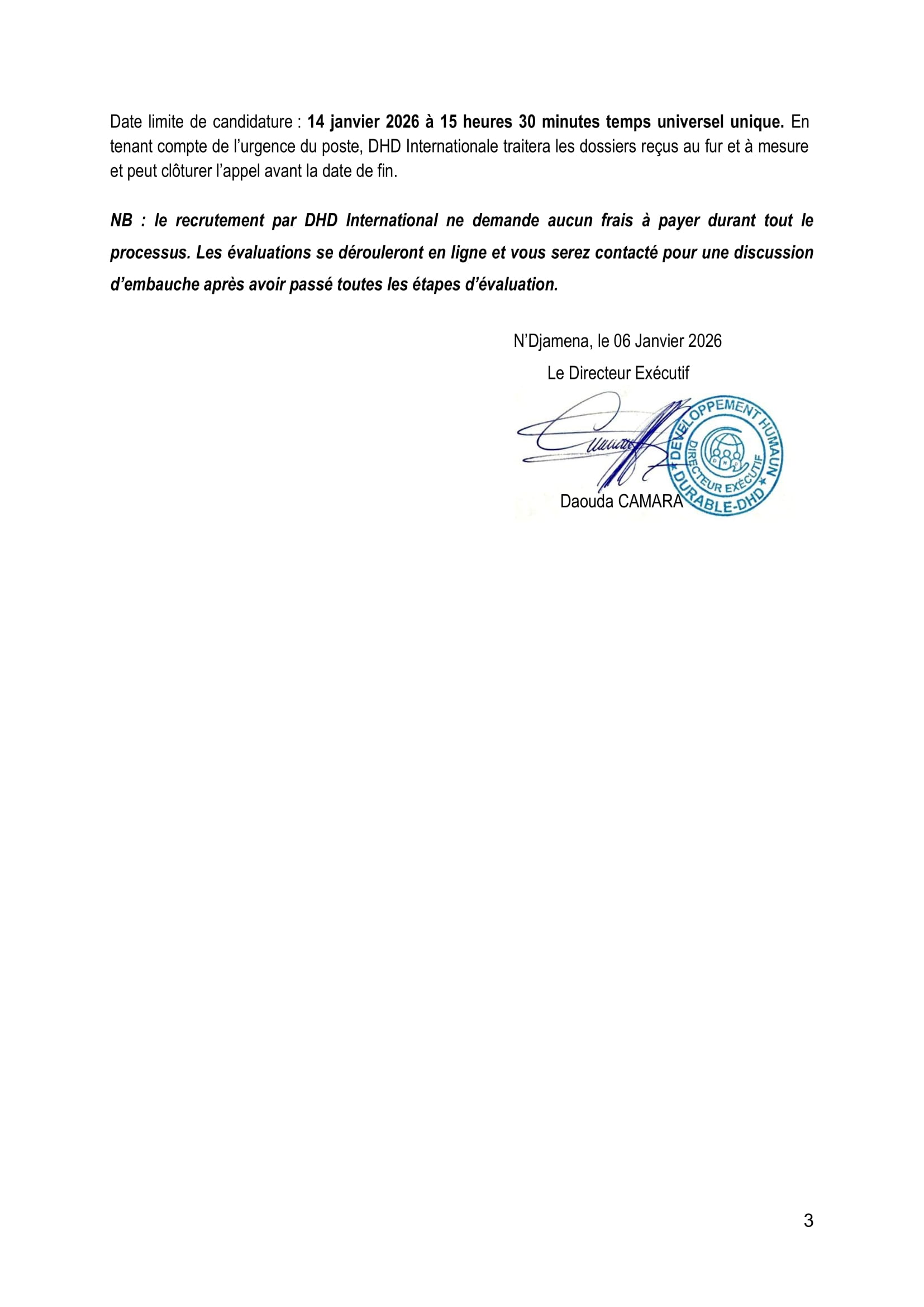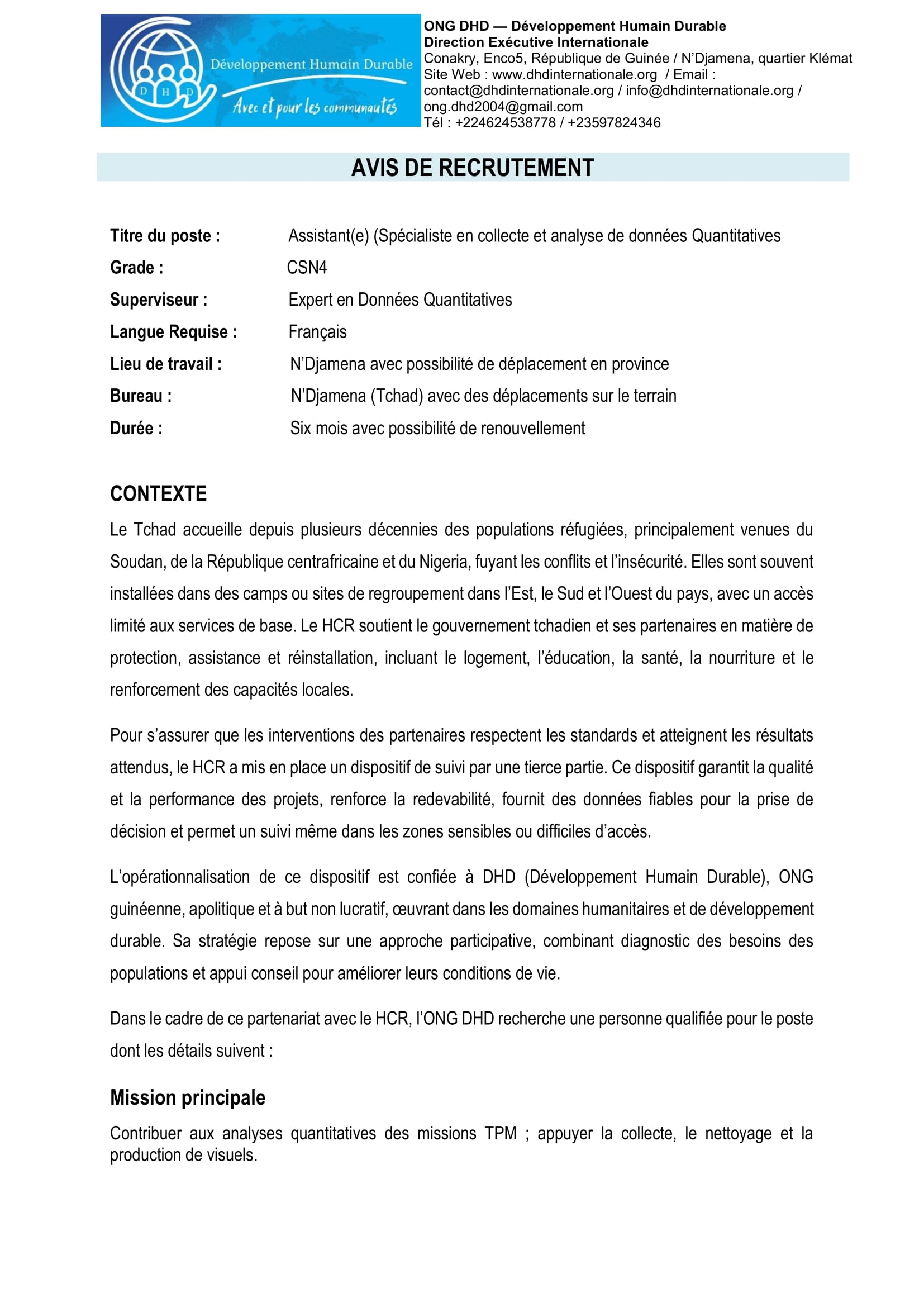 L’ONG Développement Humain Durable (DHD) recrute un assistant Spécialiste en collecte et analyse de données quantitatives, N’Djamena, Tchad Jan 7, 2026 L’ONG Développement Humain Durable (DHD) recrute un assistant Spécialiste en collecte et analyse de données quantitatives, N’Djamena, Tchad Share on FacebookTweetFollow usSaveCRS recrute un chargé de projet restauration des terres (H/F), Bol, TchadLe Réseau Accès aux Médicaments Essentiels (RAME) lance un appel à candidatures pour le recrutement d’un(e) stagiaire en Suivi-évaluation et gestion des données, Ouagadougou, Burkina FasoCEFOREP SARL organise une formation sur le suivi et évaluation des projets, Kobo collect et SPSS, N’Djamena, Tchad Acted recrute un stagiaire en contrôle de gestion, Paris, France