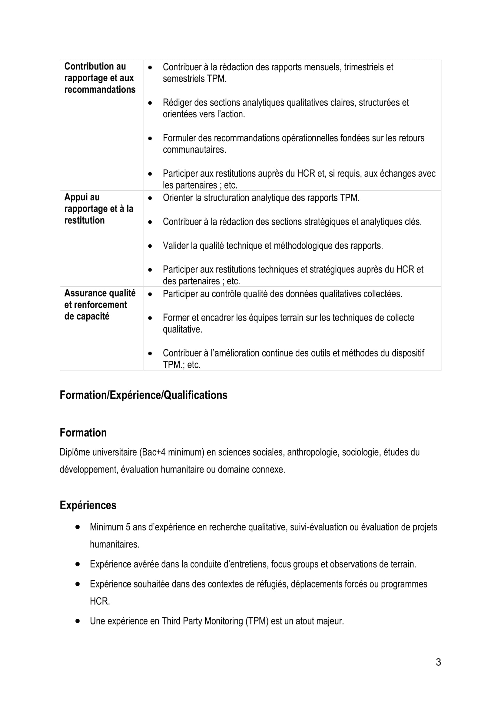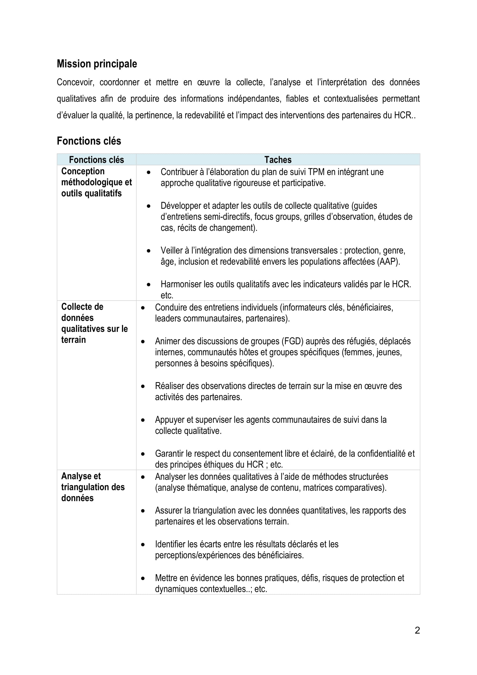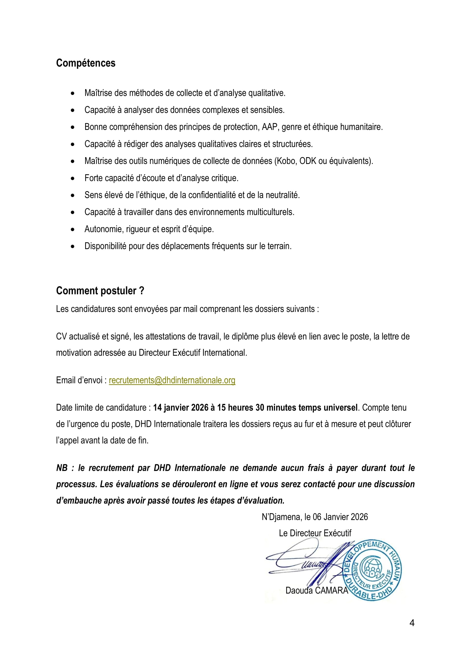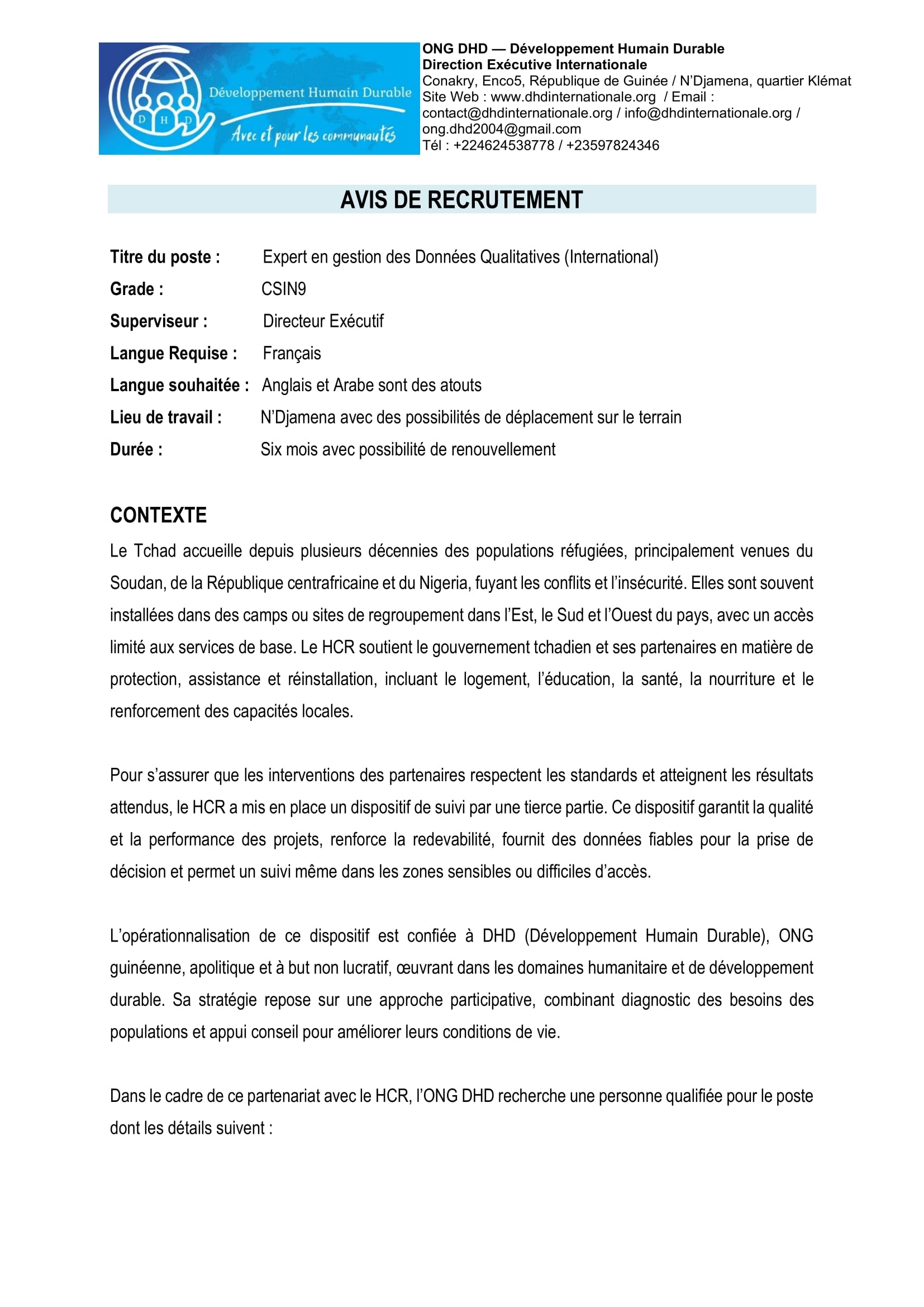 L’ONG Développement Humain Durable (DHD) recrute un Expert en gestion des données qualitatives, N’Djamena, Tchad Jan 7, 2026 L’ONG Développement Humain Durable (DHD) recrute un Expert en gestion des données qualitatives, N’Djamena, Tchad Share on FacebookTweetFollow usSaveCRS recrute un chargé de projet restauration des terres (H/F), Bol, TchadLe Réseau Accès aux Médicaments Essentiels (RAME) lance un appel à candidatures pour le recrutement d’un(e) stagiaire en Suivi-évaluation et gestion des données, Ouagadougou, Burkina FasoCEFOREP SARL organise une formation sur le suivi et évaluation des projets, Kobo collect et SPSS, N’Djamena, Tchad Acted recrute un stagiaire en contrôle de gestion, Paris, France