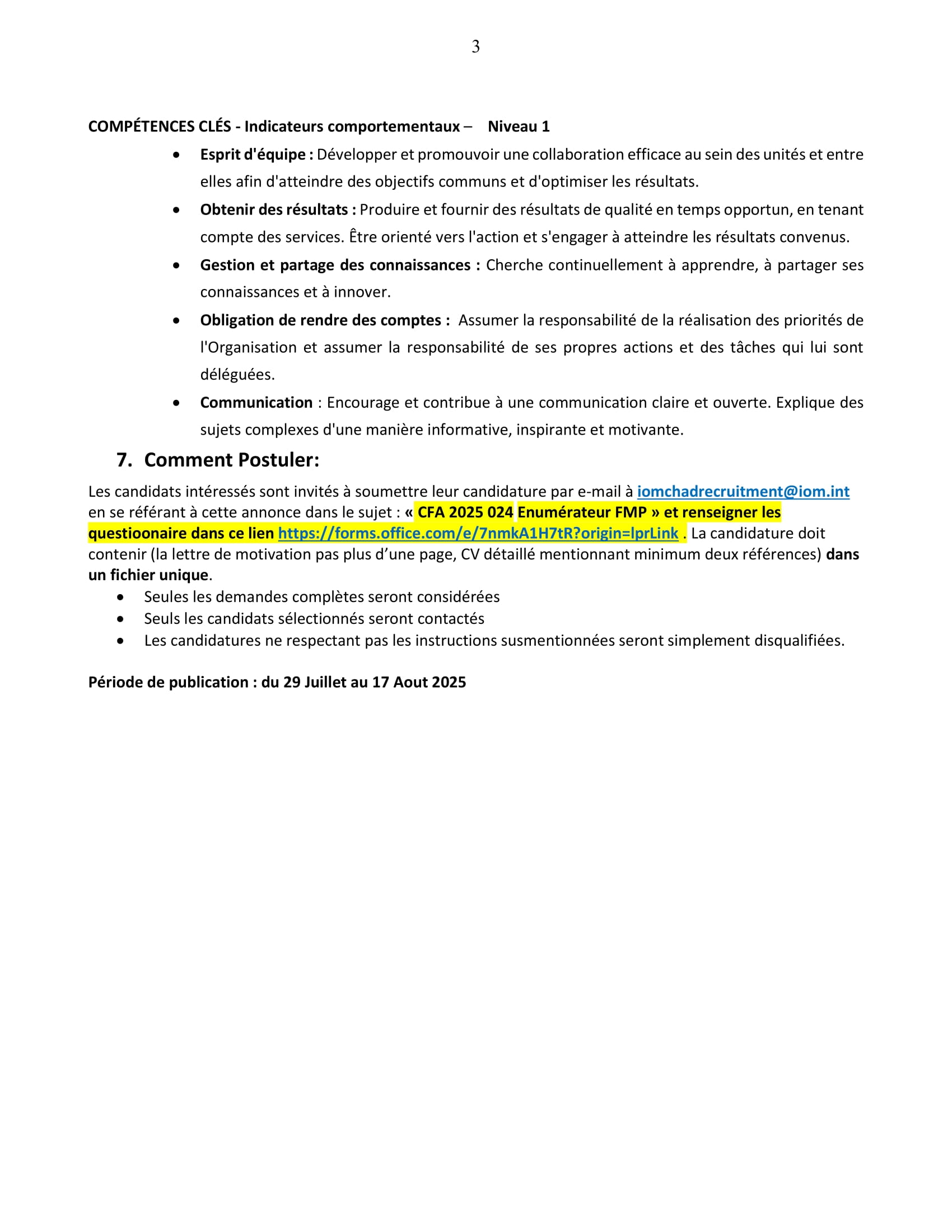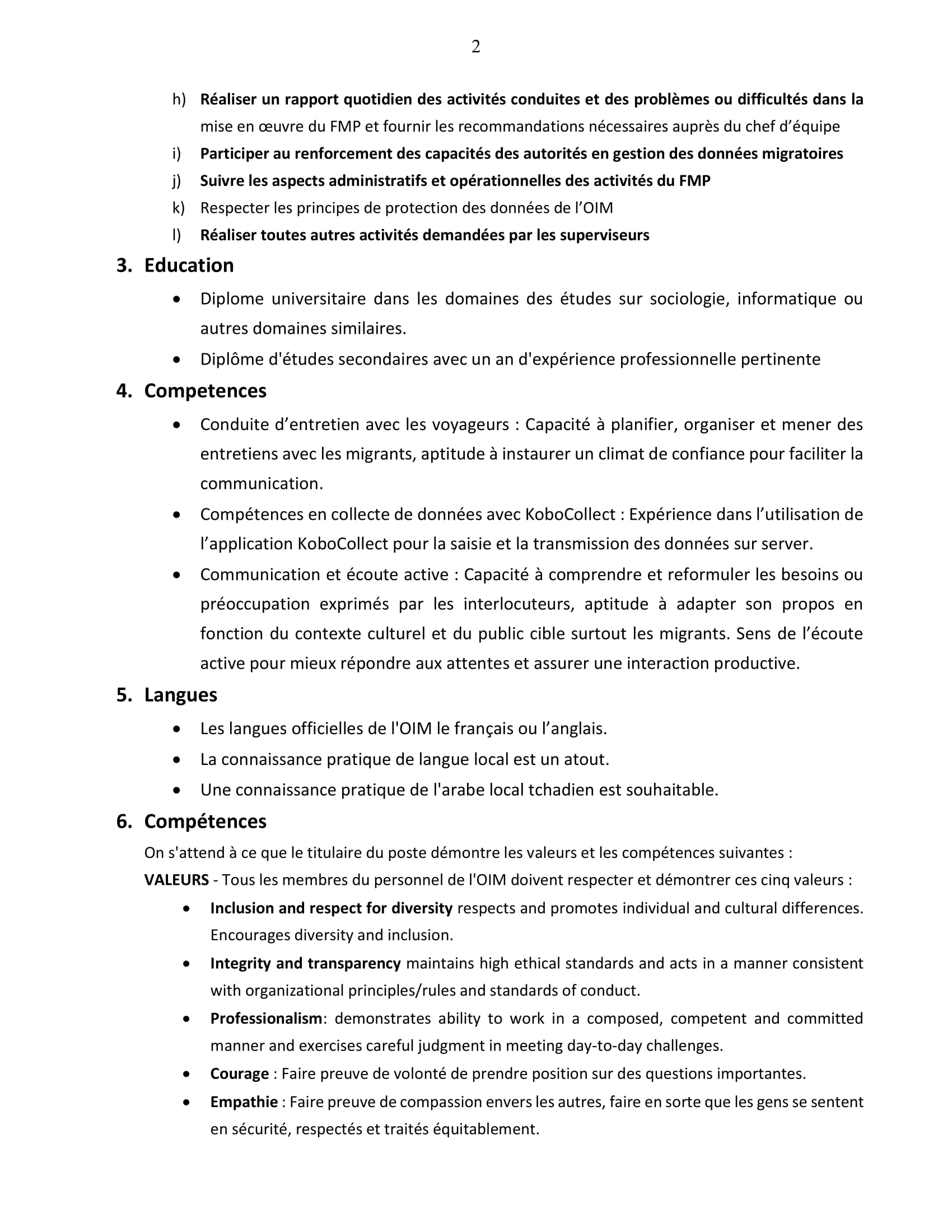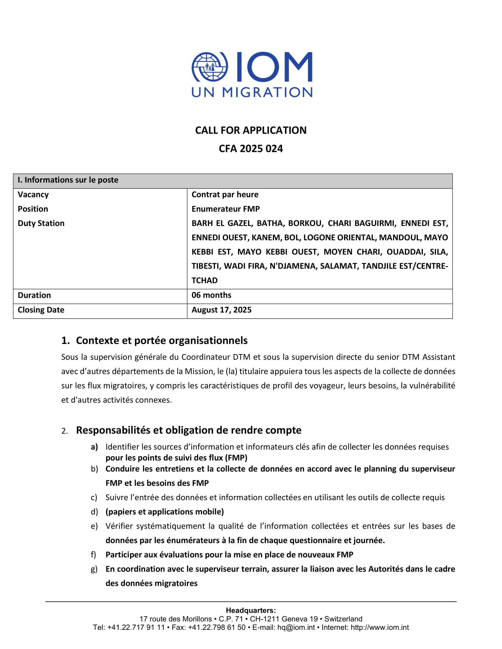 L’Organisation Internationale pour les Migrations recherche un énumérateur FMP (H/F), Tchad Août 4, 2025 L’Organisation Internationale pour les Migrations recherche un énumérateur FMP (H/F), Tchad Share on FacebookTweetFollow usSaveCatholic Relief Services recrute un assistant administratif (H/F), Amzoer, TchadLe Conseil danois pour les réfugiés (DRC) recrute un(e) Stagiaire en consolidation de la paix – Travailleur temporaire, LibyeRecod Solutions IT recrute un stagiaire développeur (H/F), Dakar, SénégalAfrican Parks recrute un(e) Responsable Financier(e), Park National de Zakouma, Tchad