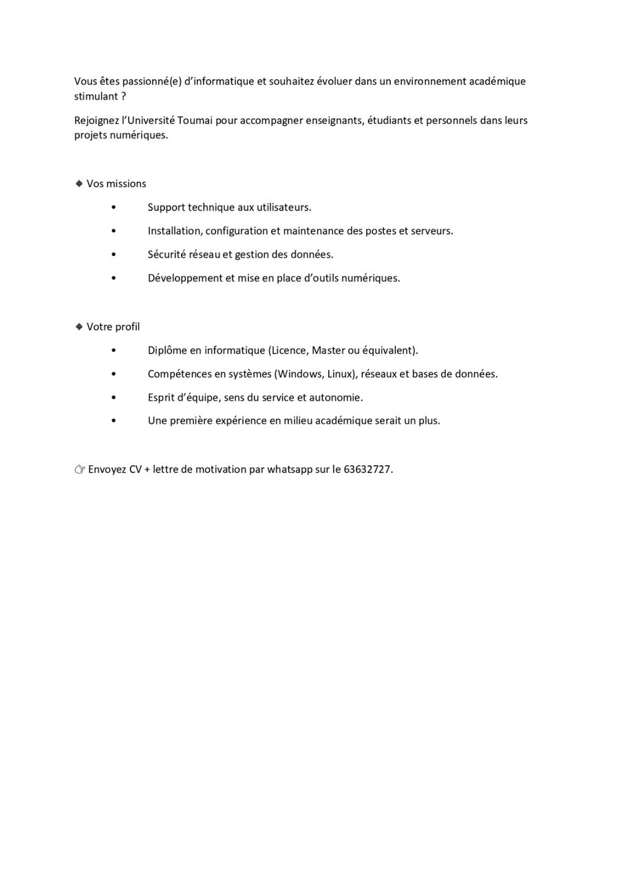 L’Université Toumaï recrute un(e) assistant(e) en Informatique, N’Djamena, Tchad Sep 25, 2025 L’Université Toumaï recrute un(e) assistant(e) en Informatique, N’Djamena, Tchad Share on FacebookTweetFollow usSaveLe Fonds des Nations Unies pour l’enfance (UNICEF) recherche un(e) Stagiaire International en Changement Climatique, Yaoundé, Cameroun Bourses d’études ums de l’université Sebelas Maret, IndonésieAppel à candidatures pour les bourses George F Kennan du Wilson Center, USA Le Programme des Nations Unies pour le développement (PNUD) recrute deux stagiaires en Communication (spécialité photo & vidéo), N’Djamena, Tchad