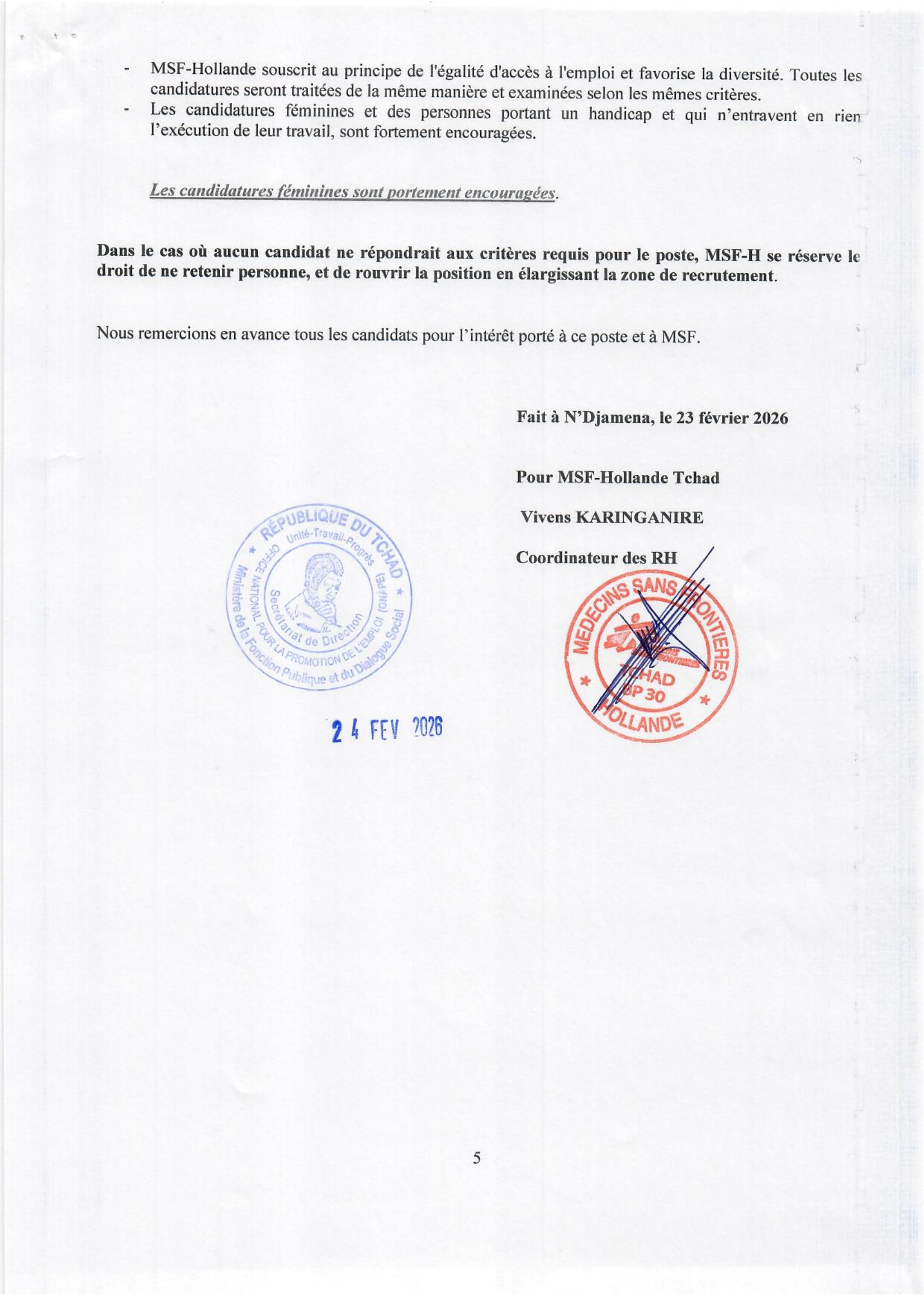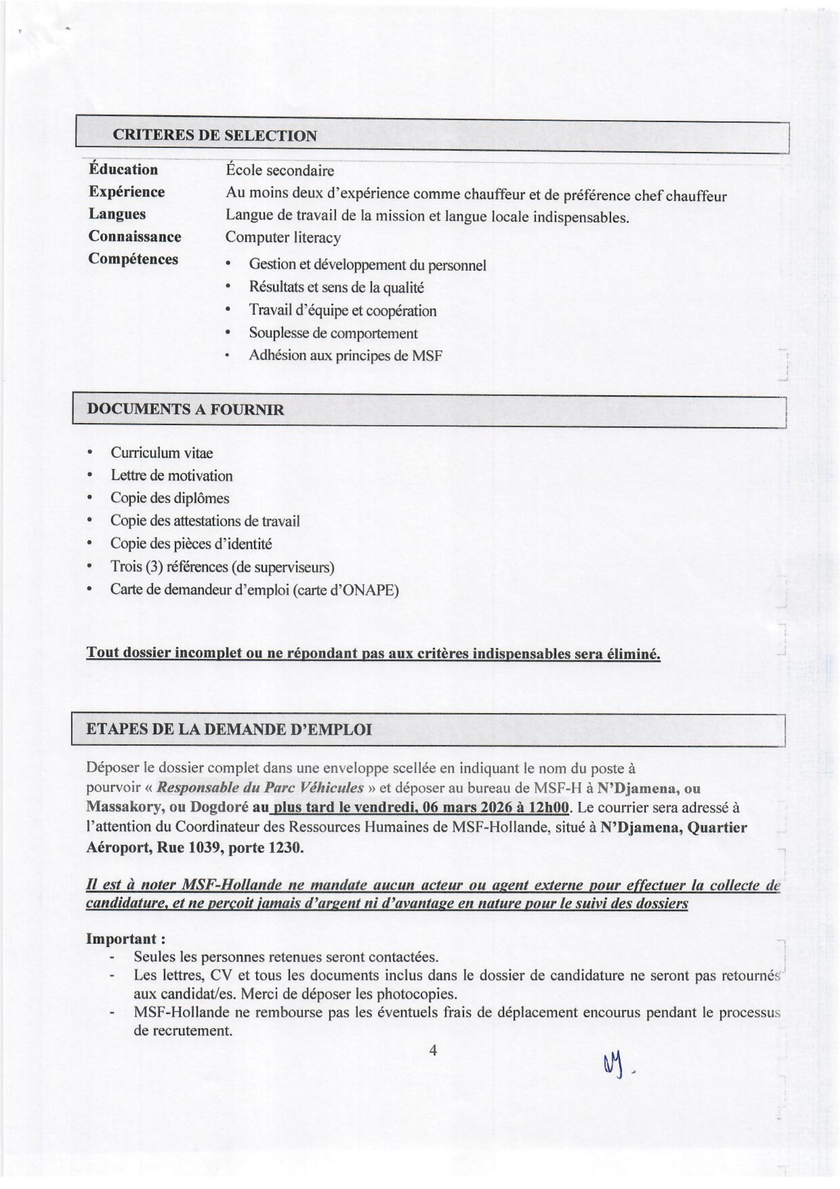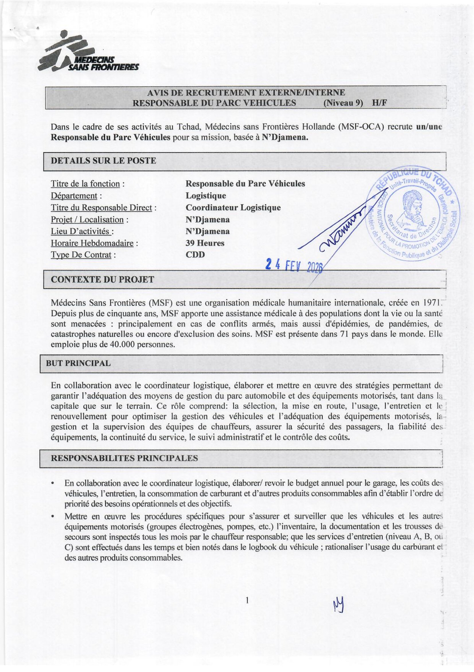 Médecins Sans Frontières (MSF) lance un avis de recrutement interne/externe d’un Responsable du Parc Véhicules (H/F), N’Djamena, Tchad Fév 24, 2026 Médecins Sans Frontières (MSF) lance un avis de recrutement interne/externe d’un Responsable du Parc Véhicules (H/F), N’Djamena, Tchad Share on FacebookTweetFollow usSaveAppel à candidatures pour les bourses d’études de l’université de Tsukuba, JaponL’ONG Développement Humain Durable (DHD) recrute un Responsable Gestion de l’information & Expert SIG, N’Djamena, TchadReporteurs Sans Frontières (RSF) recherche un Stagiaire en publication et suivi de projets Afrique (H/F), Dakar, SénégalAppel à candidatures pour les bourses d’études à l’Université de Qingdao, Chine