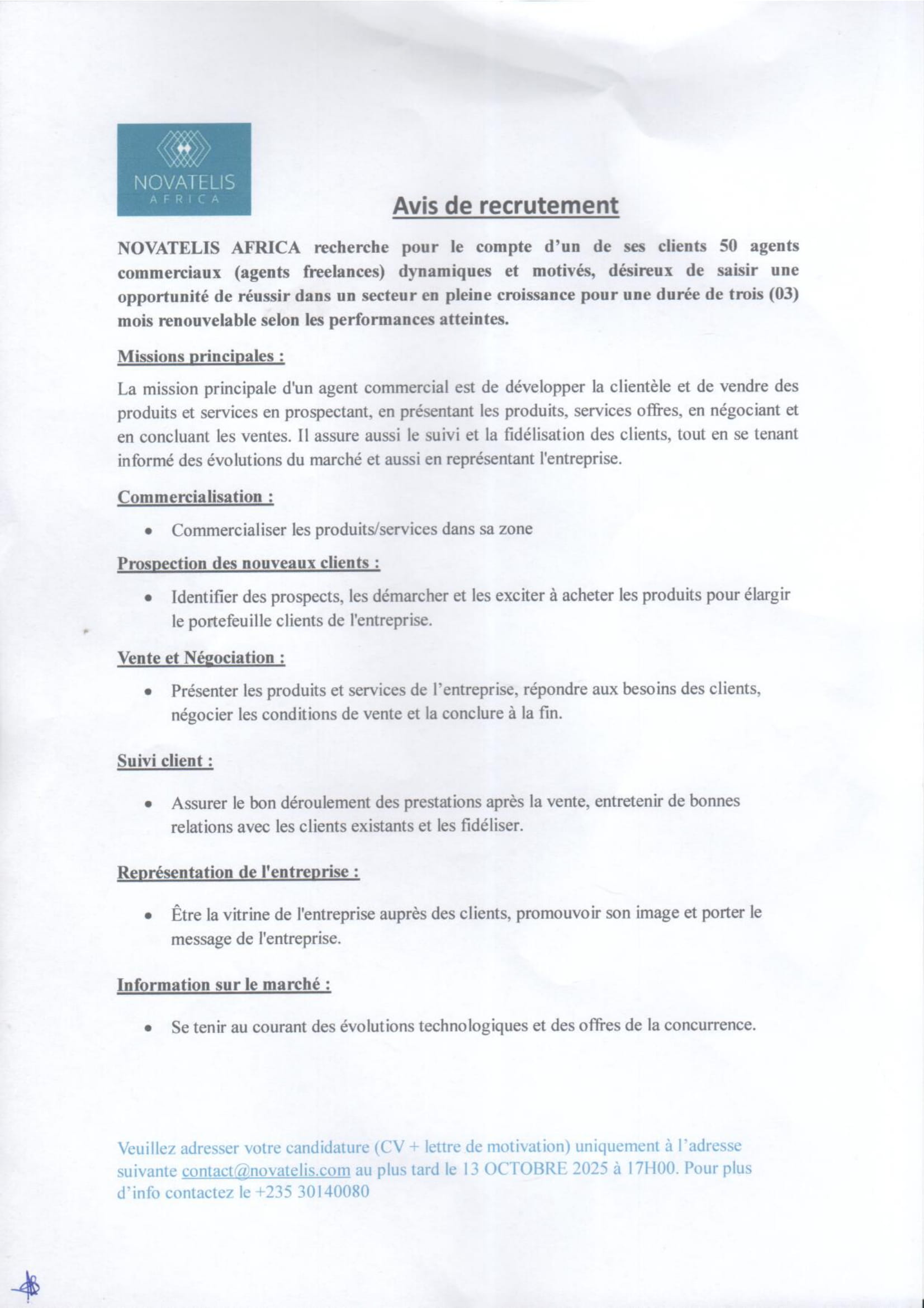 NOVATELIS AFRICA recherche pour le compte d’un de ses clients cinquante (50) agents commerciaux, Tchad Oct 2, 2025 NOVATELIS AFRICA recherche pour le compte d’un de ses clients cinquante (50) agents commerciaux, Tchad Share on FacebookTweetFollow usSaveMSF recrute un superviseur sage-femme, Aboutengue, TchadLa CARITAS SUISSE lance un avis d’appel d’offre restreinte achat des matériels aratoires au profit de 750 producteurs maraichers, Grande Sido, Monts de Lam, Nya-Pendé, de Barh Sara et la Moula, TchadL’association NOE lance un avis d’appel d’offre pour le recrutement d’un infirmier diplômé d’état (H/F), Parc de Noé, TchadLa FAO (Organisation des Nations Unies pour l’Alimentation et l’Agriculture) lance un appel à manifestation d’intérêt pour le Programme de Stages pour l’Afrique (RAF), Afrique