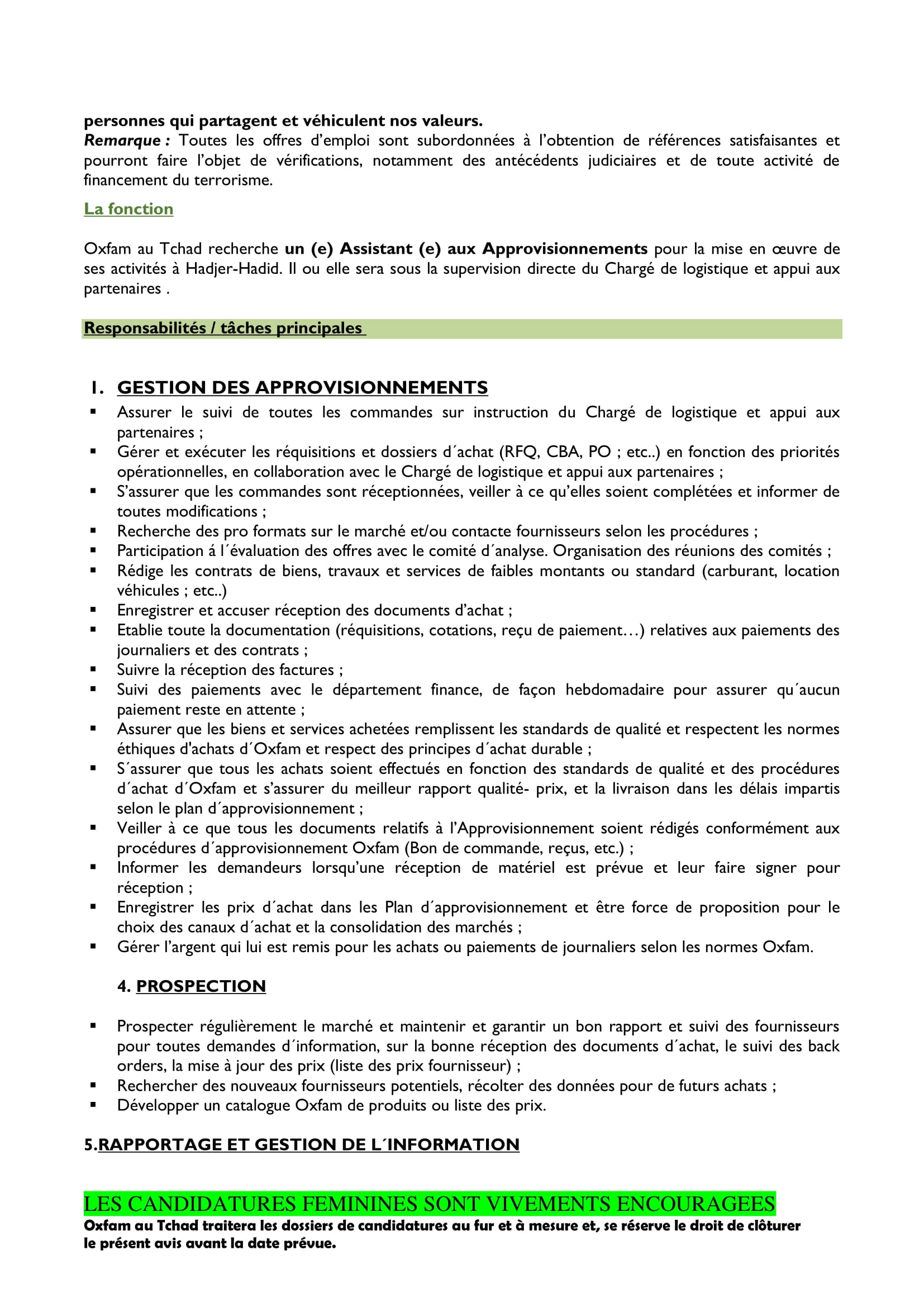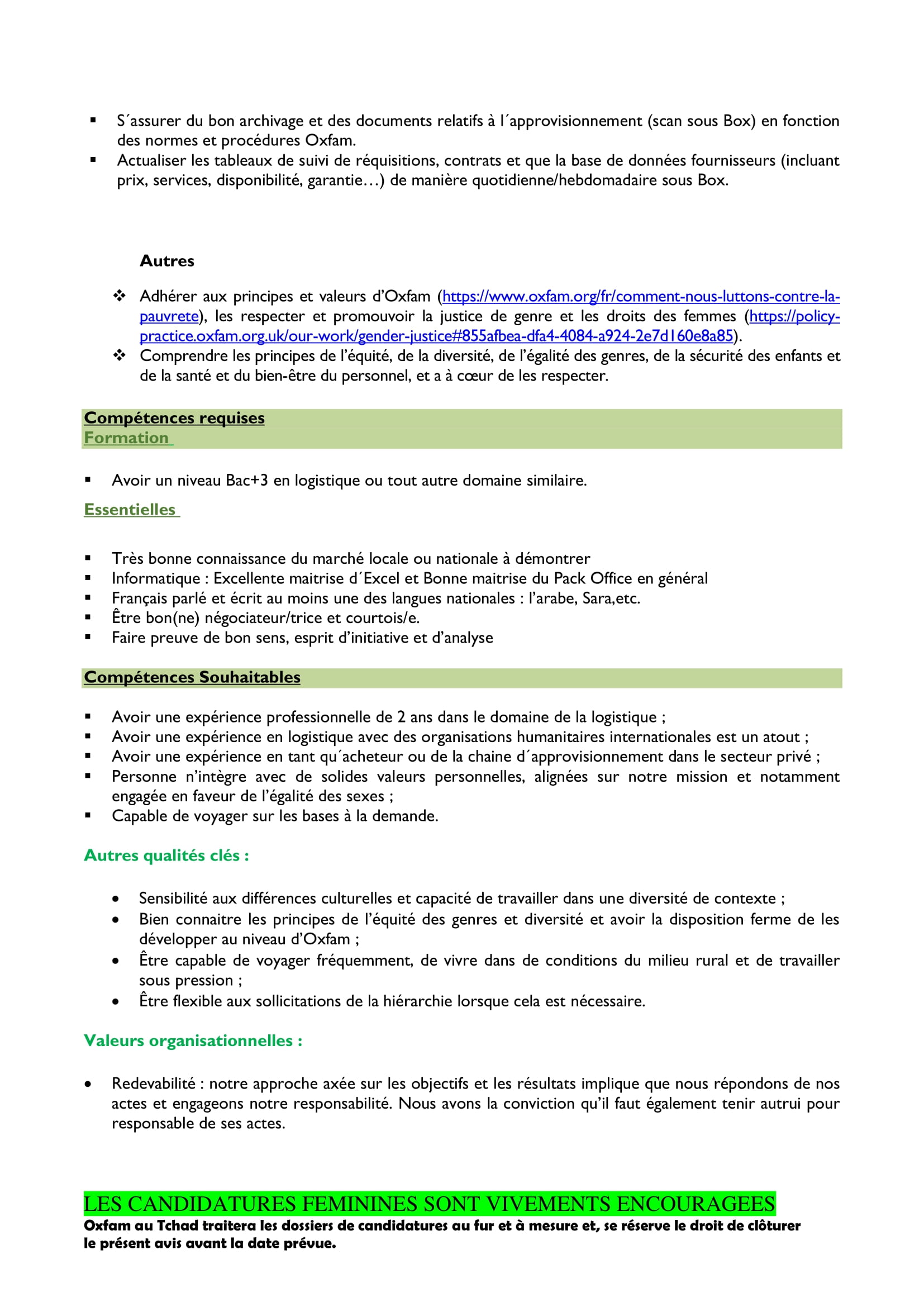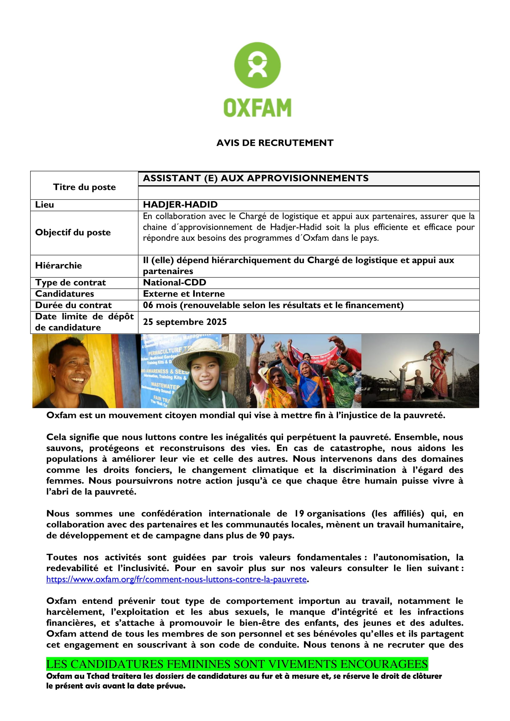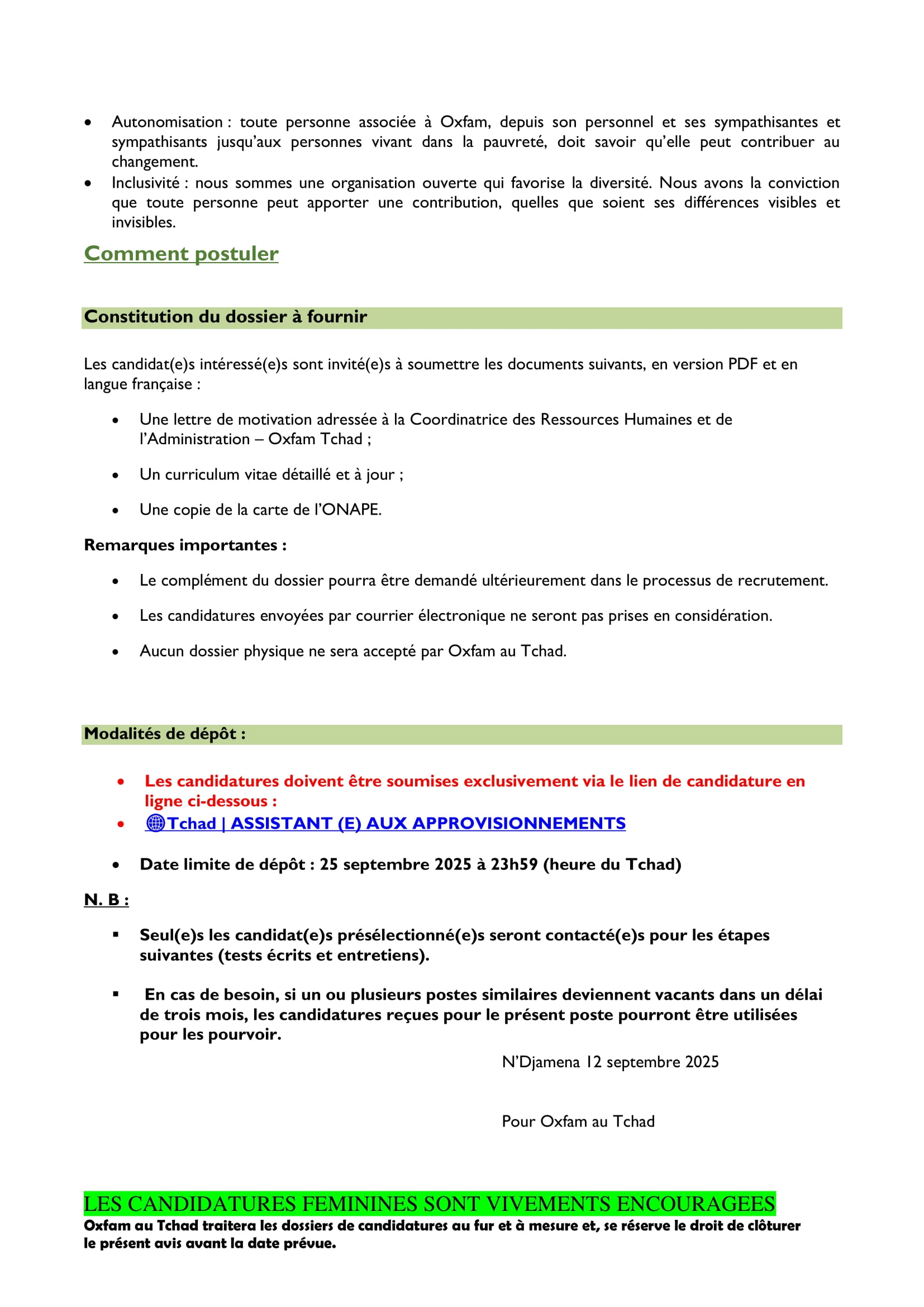 OXFAM recrute un(e) assistant(e) aux approvisionnements, N’Djamena, Tchad Sep 13, 2025 OXFAM recrute un(e) assistant(e) aux approvisionnements, N’Djamena, Tchad Share on FacebookTweetFollow usSaveLe Fonds des Nations Unies pour l’enfance (UNICEF) recherche un(e) Stagiaire International en Changement Climatique, Yaoundé, Cameroun Bourses d’études ums de l’université Sebelas Maret, IndonésieAppel à candidatures pour les bourses George F Kennan du Wilson Center, USA Le Programme des Nations Unies pour le développement (PNUD) recrute deux stagiaires en Communication (spécialité photo & vidéo), N’Djamena, Tchad
