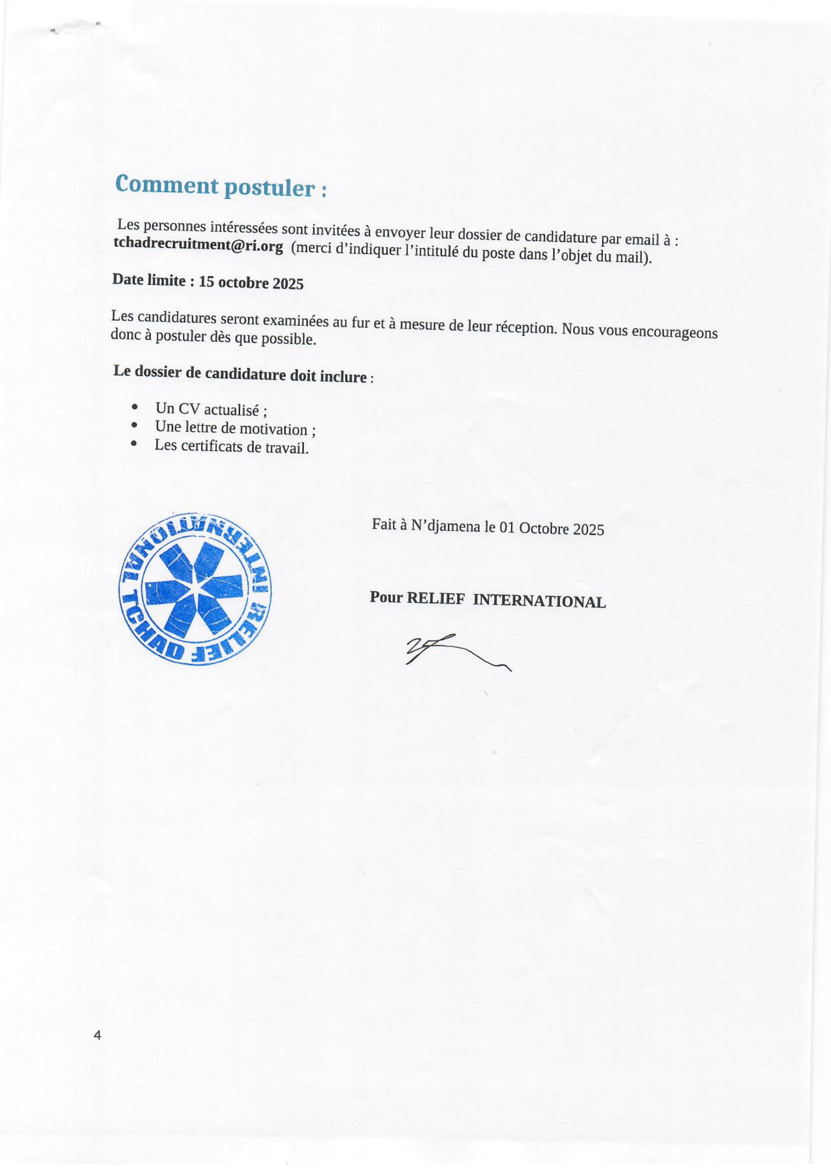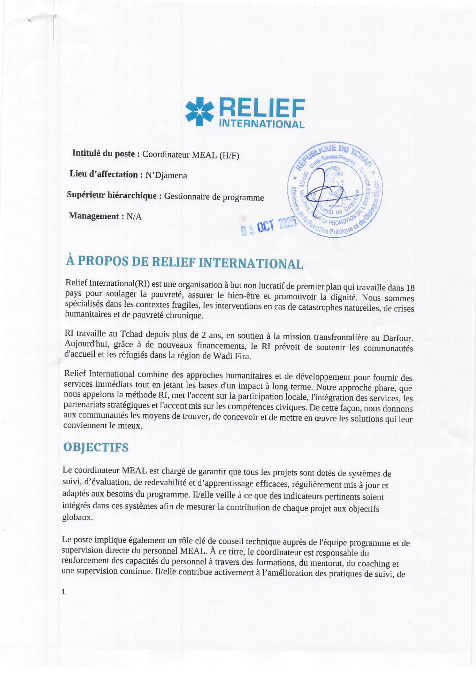 Relief International(RI) recherche un coordinateur MEAL, N’Djamena, Tchad