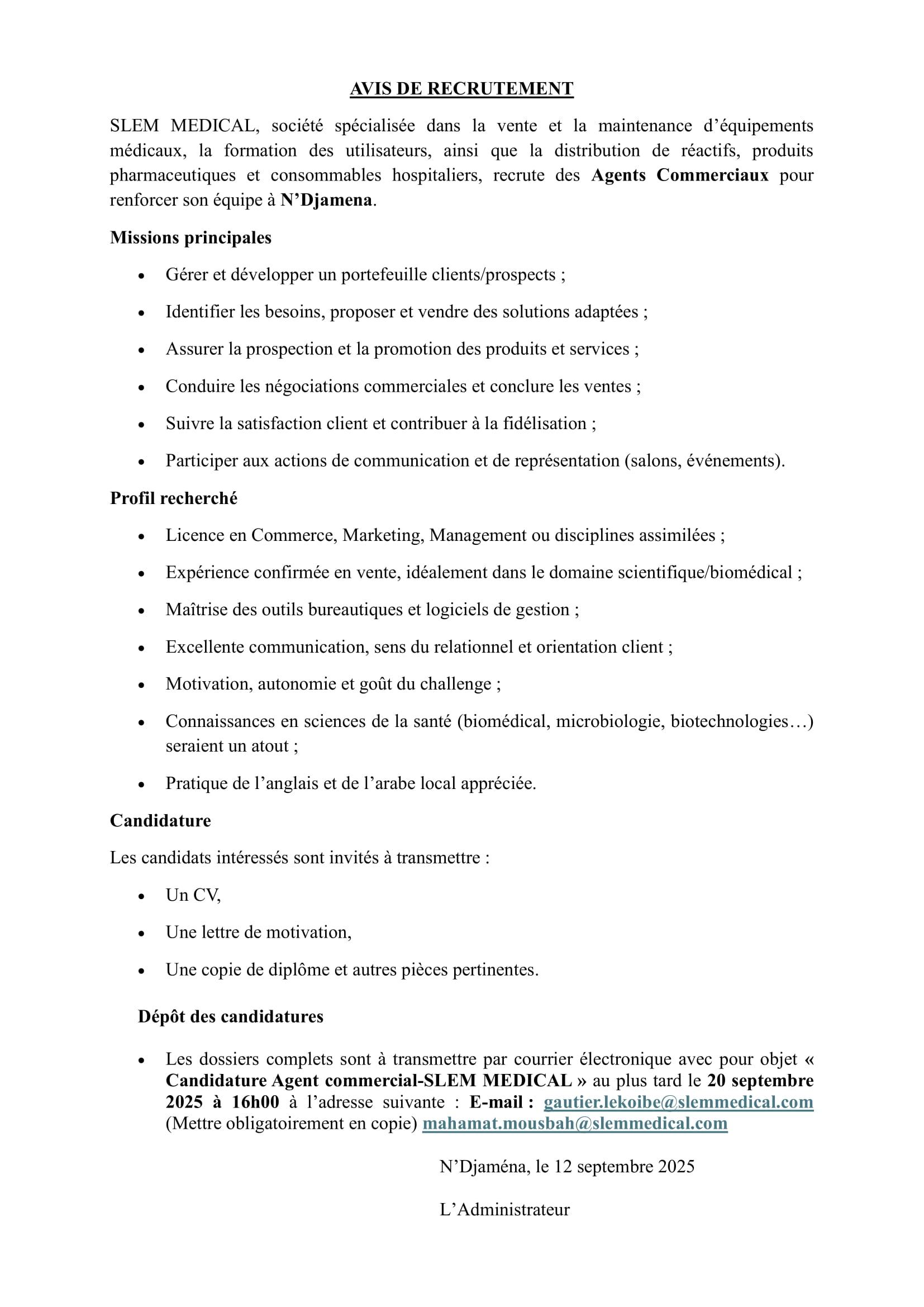 SLEM MEDICAL recrute des agents commerciaux pour renforcer son équipe, N’Djamena, Tchad Sep 15, 2025 SLEM MEDICAL recrute des agents commerciaux pour renforcer son équipe, N’Djamena, Tchad Share on FacebookTweetFollow usSaveCatholic Relief Services recrute un assistant administratif (H/F), Amzoer, TchadLe Conseil danois pour les réfugiés (DRC) recrute un(e) Stagiaire en consolidation de la paix – Travailleur temporaire, LibyeRecod Solutions IT recrute un stagiaire développeur (H/F), Dakar, SénégalAfrican Parks recrute un(e) Responsable Financier(e), Park National de Zakouma, Tchad