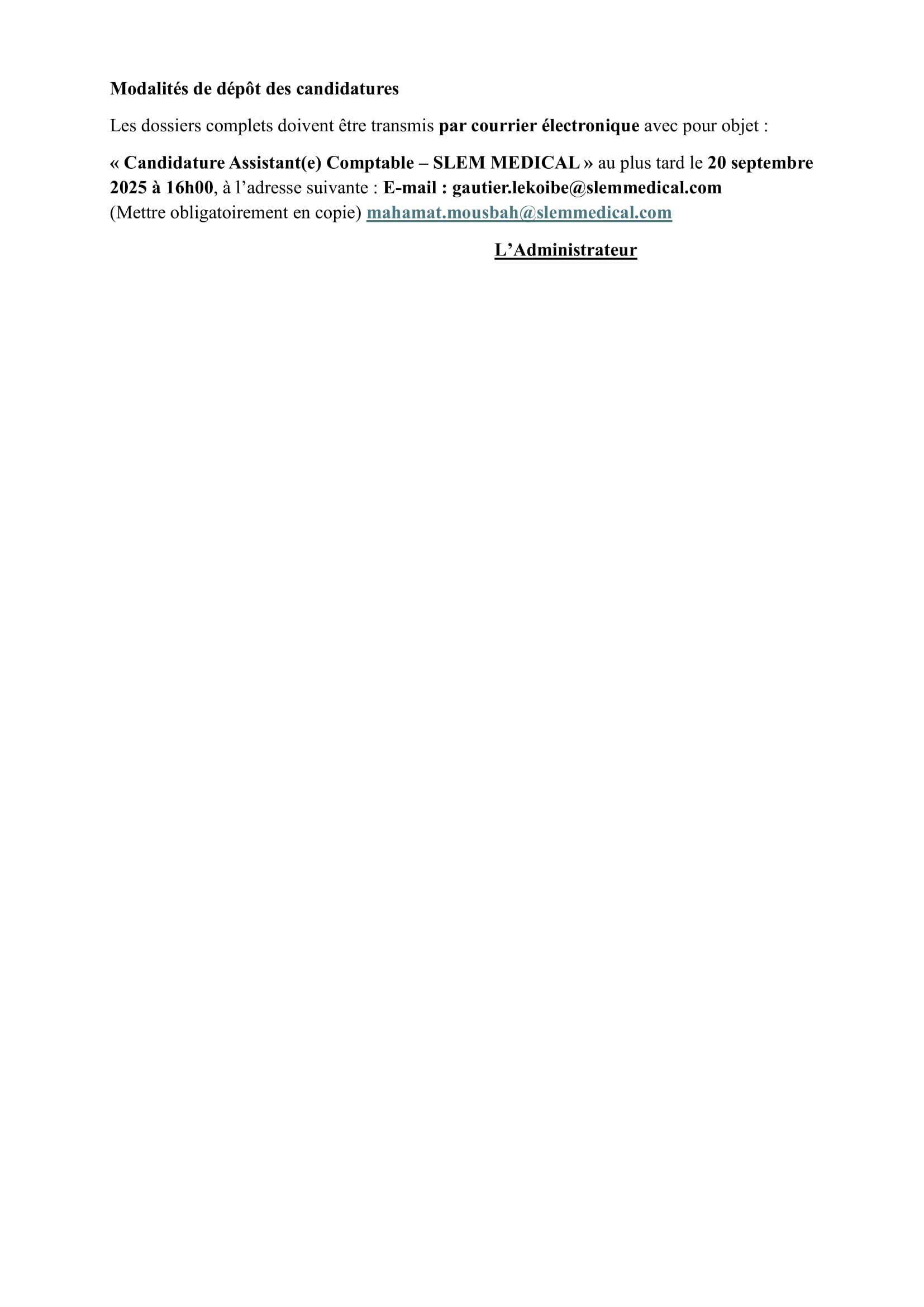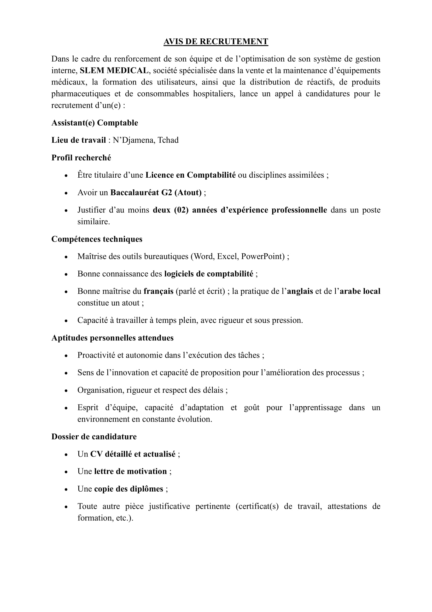SLEM MEDICAL recrute un(e) assistant(e) comptable, N’Djamena, Tchad Sep 15, 2025 SLEM MEDICAL recrute un(e) assistant(e) comptable, N’Djamena, Tchad Share on FacebookTweetFollow usSaveLe Fonds des Nations Unies pour l’enfance (UNICEF) recherche un(e) Stagiaire International en Changement Climatique, Yaoundé, Cameroun Bourses d’études ums de l’université Sebelas Maret, IndonésieAppel à candidatures pour les bourses George F Kennan du Wilson Center, USA Le Programme des Nations Unies pour le développement (PNUD) recrute deux stagiaires en Communication (spécialité photo & vidéo), N’Djamena, Tchad