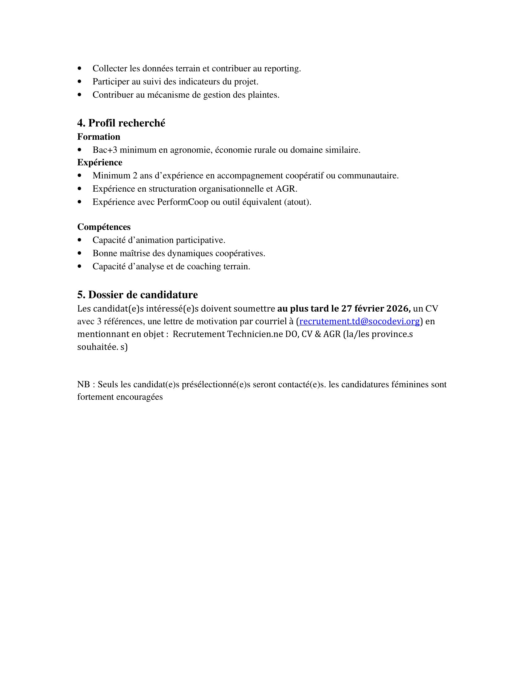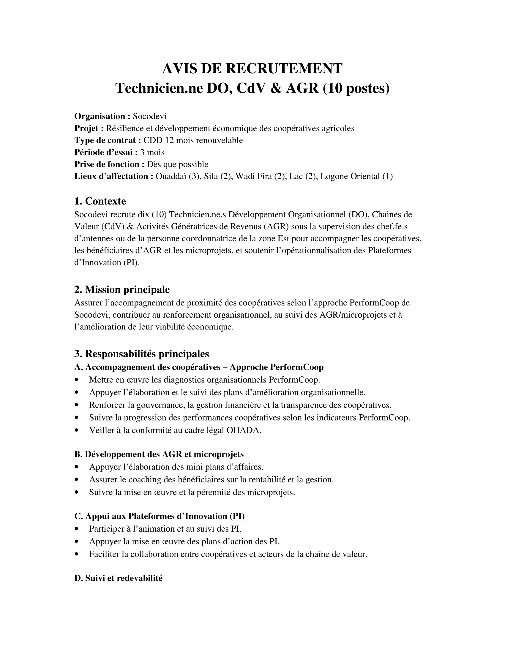 Socodevi recrute dix (10) Technicien(ne)s DO, CdV & AGR, Ouaddaï, Sila, Wadi Fira, Lac, Logone Oriental, Tchad Fév 17, 2026 Socodevi recrute dix (10) Technicien(ne)s DO, CdV & AGR, Ouaddaï, Sila, Wadi Fira, Lac, Logone Oriental, Tchad Share on FacebookTweetFollow usSaveLe Conseil Norvégien pour les Réfugiés recrute un(e) HR & Administration Manager, N’Djamena, TchadDans le cadre du projet RAPAR, la CARITAS Suisse lance un avis d’appel d’offres pour le recrutement d’un prestataire de services financiers pour la distribution du cash aux ménages vulnérables du département du Batha-Est et Assinet, TchadCatholic Relief Services recrute pour le poste de Deputy Chief of Party-Programming/Chef de Bureau, Farchana, TchadAppel à candidatures pour les bourses Erasmus Mundus EMLE, Europe