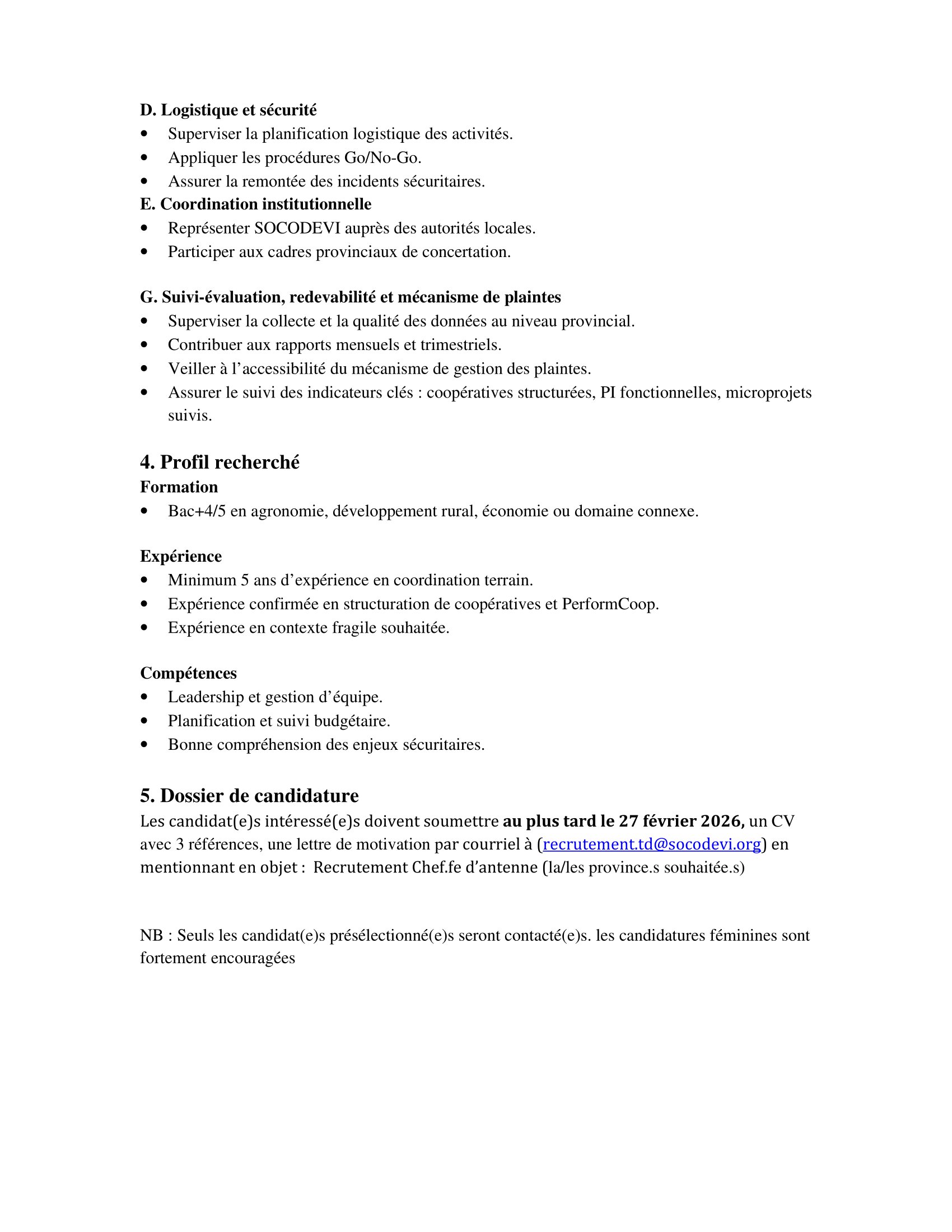 Socodevi recrute quatre (04) Chefs d’antenne et Responsables DO et développement de CdV (H/F), Sila, Wadi Fira, Lac, Logone Oriental, Tchad Fév 17, 2026 Socodevi recrute quatre (04) Chefs d’antenne et Responsables DO et développement de CdV (H/F), Sila, Wadi Fira, Lac, Logone Oriental, Tchad Share on FacebookTweetFollow usSaveLe Conseil Norvégien pour les Réfugiés recrute un(e) HR & Administration Manager, N’Djamena, TchadDans le cadre du projet RAPAR, la CARITAS Suisse lance un avis d’appel d’offres pour le recrutement d’un prestataire de services financiers pour la distribution du cash aux ménages vulnérables du département du Batha-Est et Assinet, TchadCatholic Relief Services recrute pour le poste de Deputy Chief of Party-Programming/Chef de Bureau, Farchana, TchadAppel à candidatures pour les bourses Erasmus Mundus EMLE, Europe