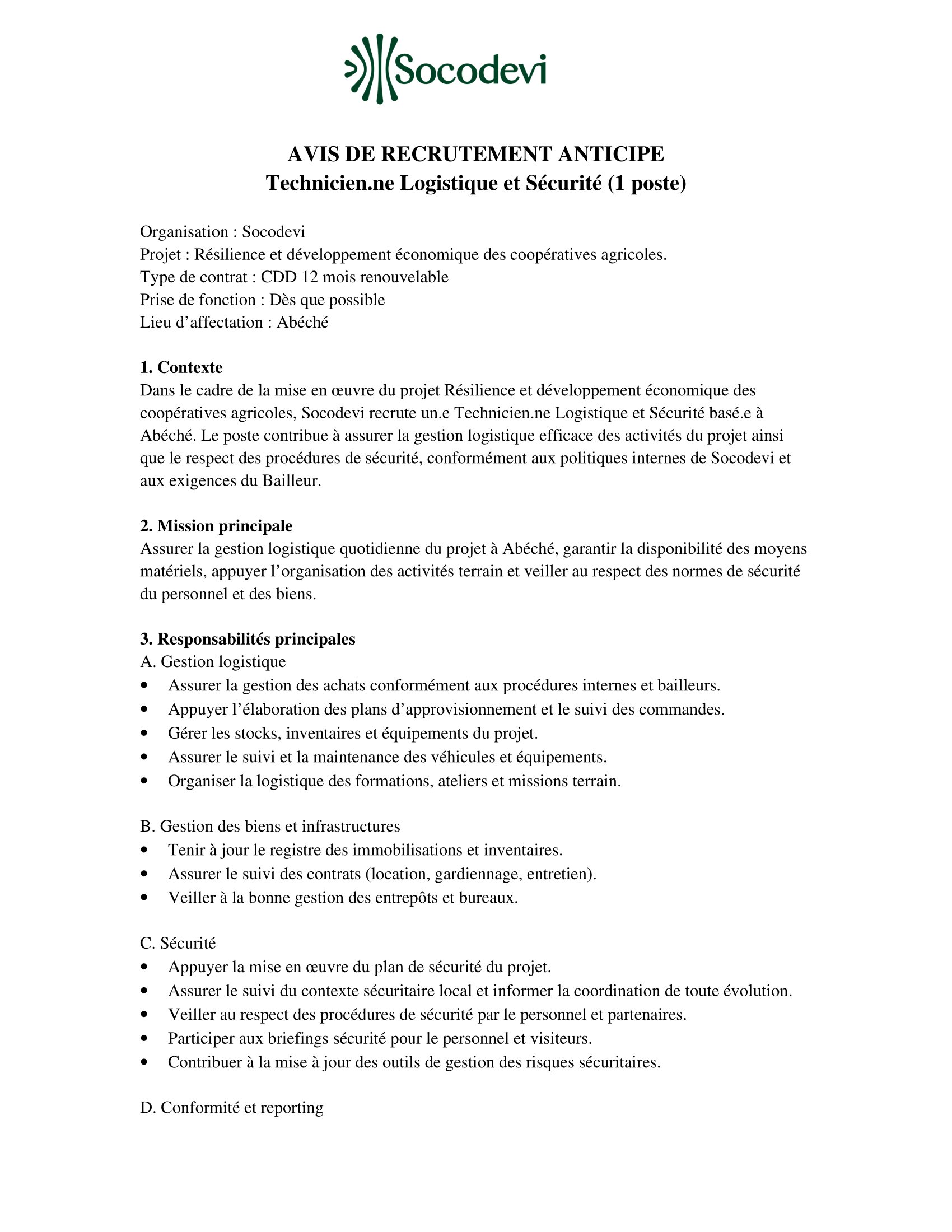 Socodevi recrute un(e) Technicien(ne) Logistique et Sécurité, Abéché, Tchad