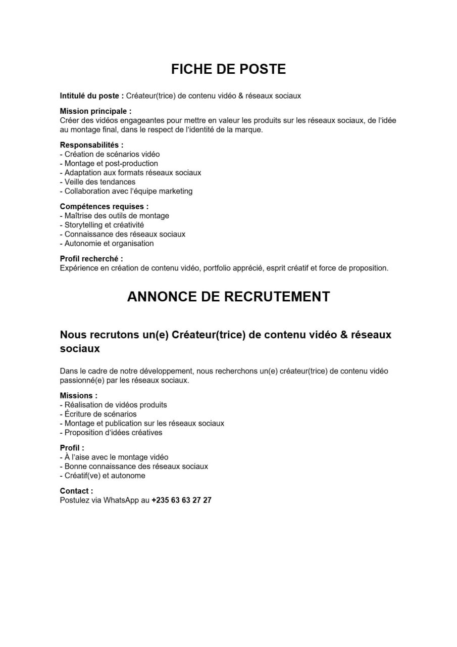 Une entreprise de la place recrute un créateur de contenu vidéo & réseaux sociaux (H/F), N’Djamena, Tchad Jan 5, 2026 Une entreprise de la place recrute un créateur de contenu vidéo & réseaux sociaux (H/F), N’Djamena, Tchad Share on FacebookTweetFollow usSaveGIZ recrute un conseiller(e) en gouvernance locale, Moundou, TchadCICR recrute deux comptables (H/F) basé(e)s à Adré/Bagasola, TchadUNICEF recrute un(e) Chargé(e) de programme Nutrition, Bol, TchadSolidaridad West Africa lance un avis de recrutement externe de Gestionnaire de centre de service rural Moundou ou Kelo, Tchad