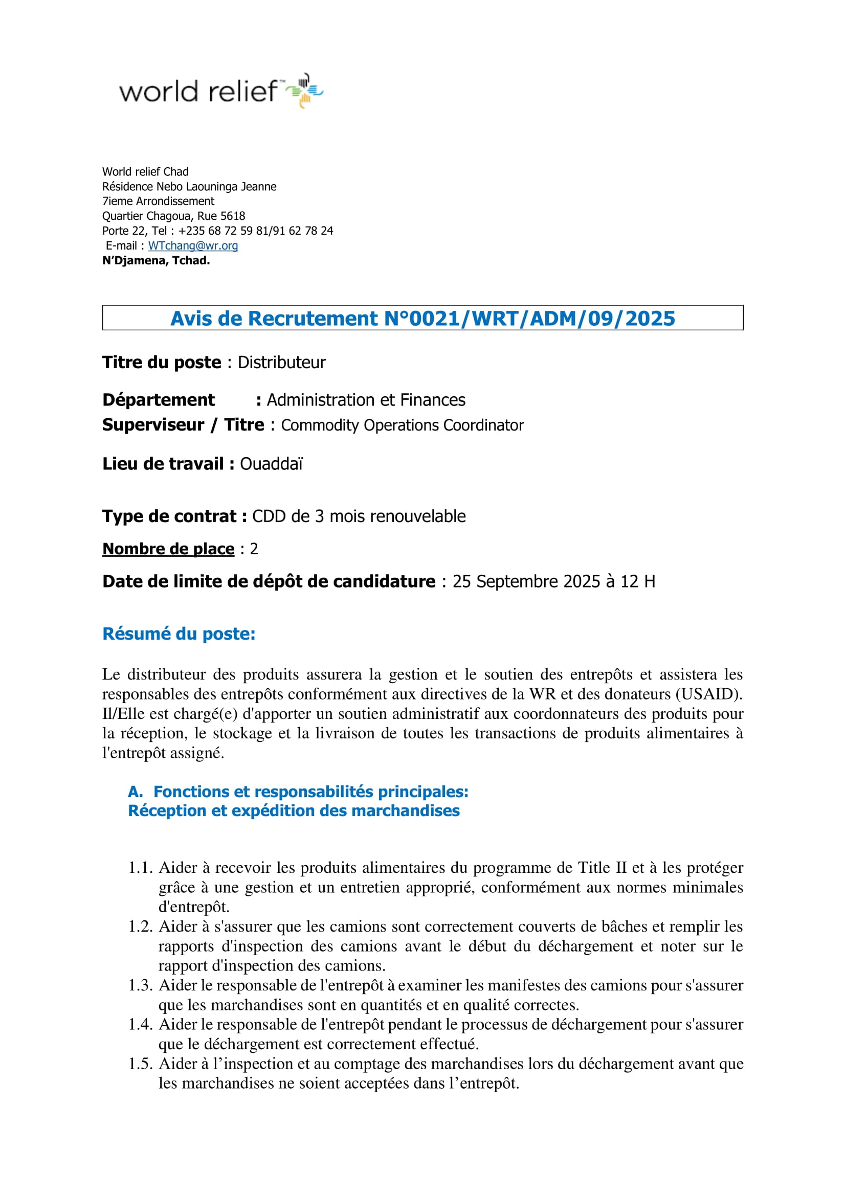 World Relief is recruiting a Commodity Operations Coordinator, Ouaddaï, Tchad Sep 10, 2025 World Relief is recruiting a Commodity Operations Coordinator, Ouaddaï, Tchad Share on FacebookTweetFollow usSaveGIZ recrute un expert en crise, conflits et catastrophes (H/F), N’Djamena, TchadMédecins Sans Frontières (MSF) recrute un stagiaire en communication digitale, Dakar, SénégalLe Centre de services régional des Nations Unies à Entebbe (RSCE) recrute un Stagiaire – Technologie de l’information, Entebbe, OugandaBourses d’études pour les leaders mondiaux émergents de l’American University.