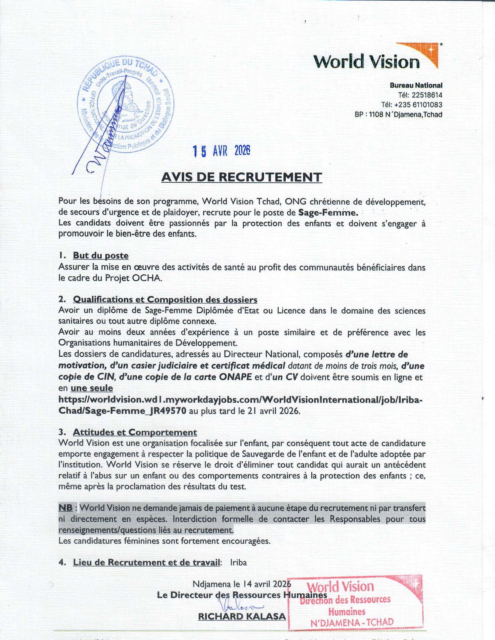 World Vision recrute le pour poste de Sage-Femme, Iriba, Tchad
