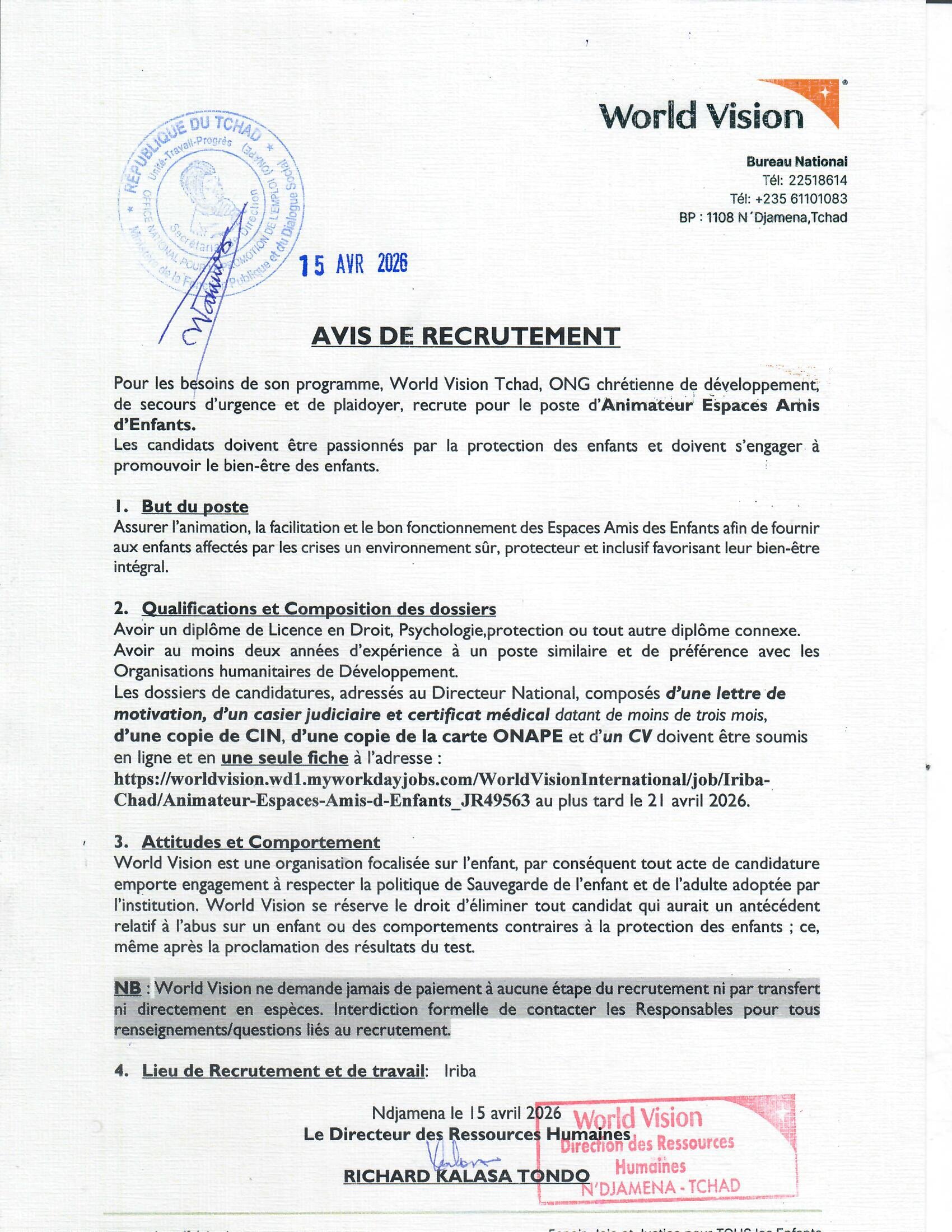 World Vision recrute pour le poste d’Animateur Espaces Amis d’Enfants, Iriba, Tchad Avr 15, 2026 World Vision recrute pour le poste d’Animateur Espaces Amis d’Enfants, Iriba, Tchad Postuler ici Share on FacebookTweetFollow usSaveAppel à candidatures pour les Bourses James Buchanan 2025 de l’Université George Mason, États-UnisINTERNATIONAL RESCUE COMMITTEE, INC lance un avis d’appel d’offres de service de location de vehicules pour la mise en place de contrat-cadre, Lac, Guera, N’Djamena, TchadAfrican Parks recrute deux (02) Chauffeurs, N’Djamena, Tchadque le Cabinet CEFOREP SARL, en partenariat avec le CIFOPMAPE, organise une session de formation sur la maîtrise du logiciel de gestion comptable et financière TOM² Pro, N’Djamena, Tchad