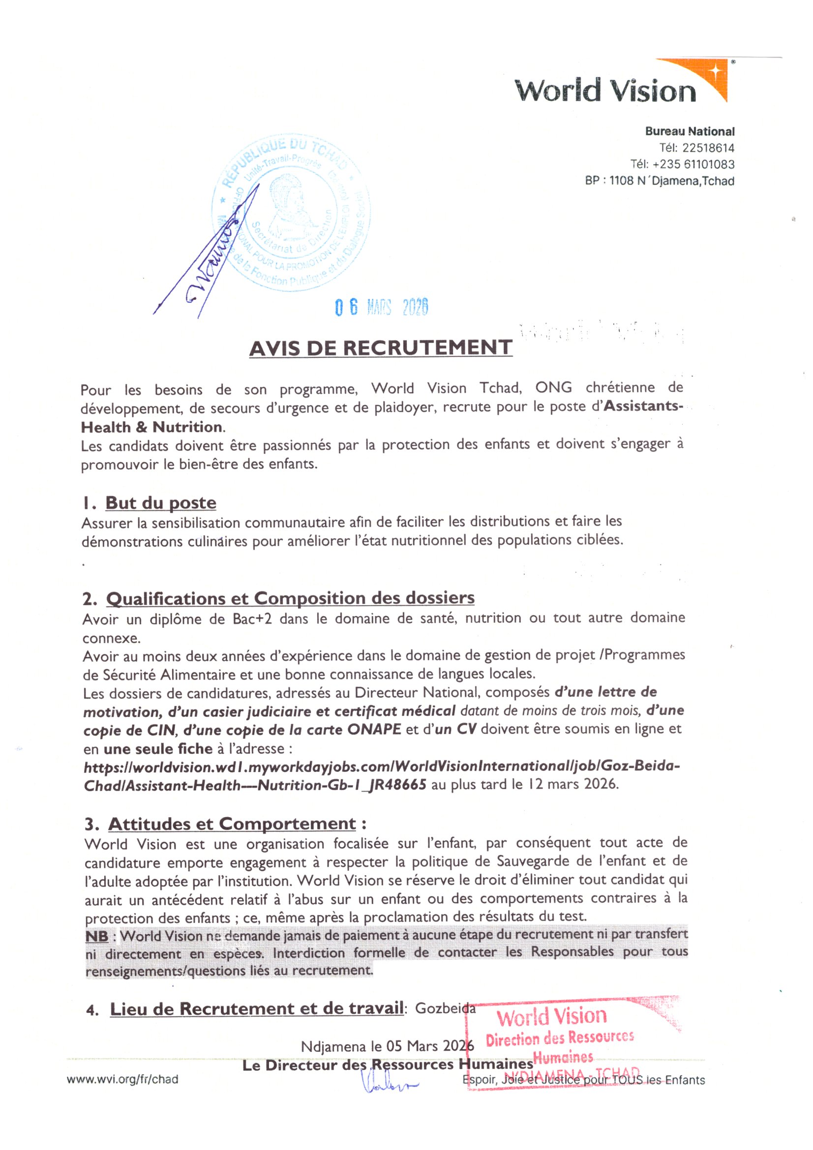 World Vision recrute pour le poste d’Assistants Health & Nutrition, Gozbeida, Tchad Mar 6, 2026 World Vision recrute pour le poste d’Assistants Health & Nutrition, Gozbeida, Tchad Postuler ici Share on FacebookTweetFollow usSaveINKOMOKO lance un appel à candidatures pour la réalisation d’une évaluation dans le sud du Tchad en vue de l’extension du programme du 1er Novembre au 31 novembreL’ONG Humanité & Inclusion lance un avis d’appel d’offres pour la Connexion Internet HI-Tchad utilisant la technologie VSAT, TchadL’ONG Douleurs Sans Frontières recrute un stagiaire Chargé de Communication / Créateur de contenus (H/F), Paris, FranceL’ONG Centre de Support en Santé Internationale (CSSI) recrute un(e) Administrateur(trice) Financier(e), Bangui, RCA
