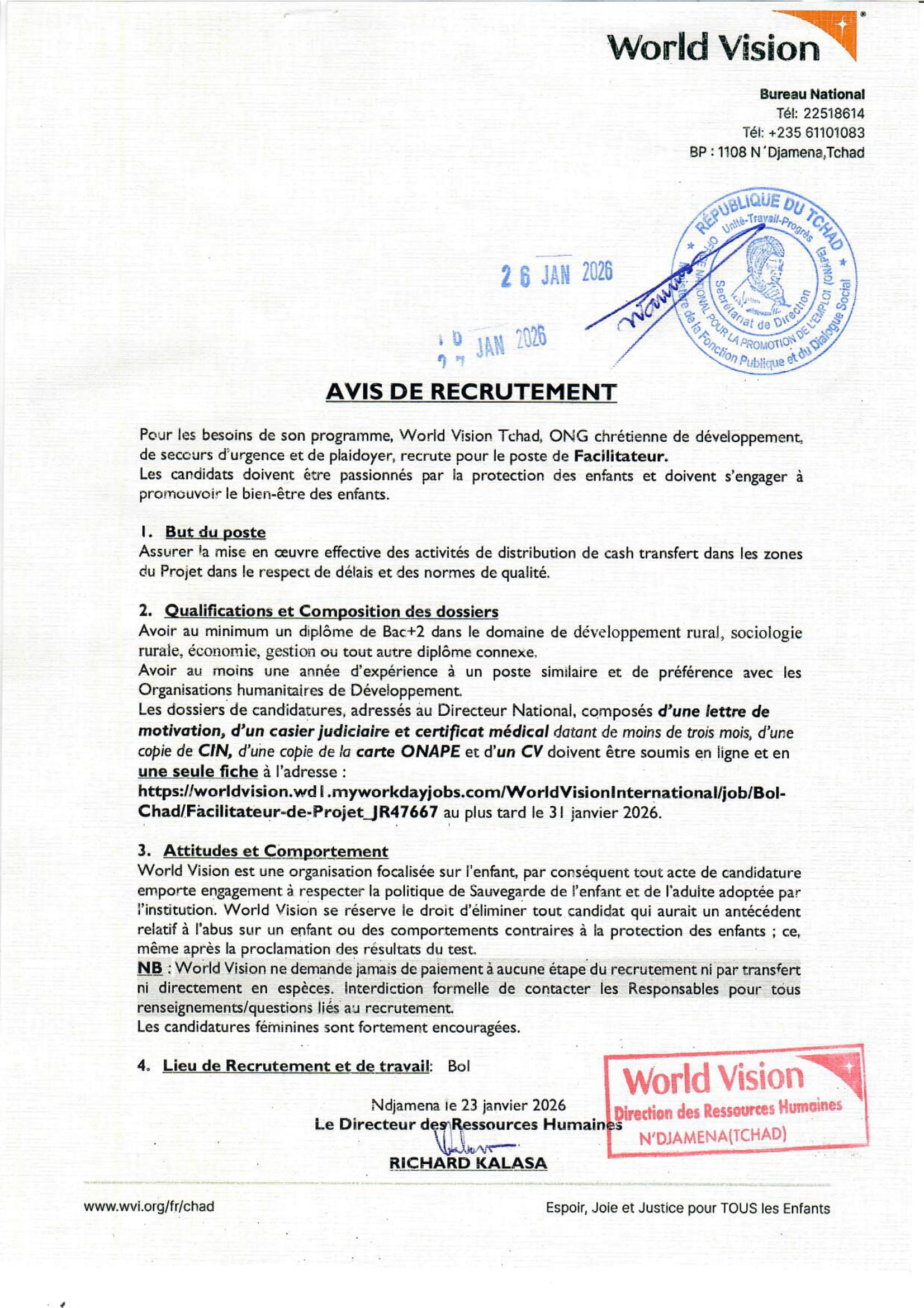 World Vision recrute pour le poste de Facilitateur, Bol, Tchad Jan 27, 2026 World Vision recrute pour le poste de Facilitateur, Bol, Tchad Postuler ici Share on FacebookTweetFollow usSaveL’UNICEF France recherche un stagiaire philanthropie (F/H), Paris, FranceDignité International (DI) recrute pour le poste de Chargé de programme parrainage (H/F), N’Djamena, TchadOxfam lance un avis de recrutement local pour le poste d’animateur WASH, Est, TchadAppel à candidature pour les Bourses de doctorat en intelligence géo-artificielle à l’Université de Twente, Pays-Bas.