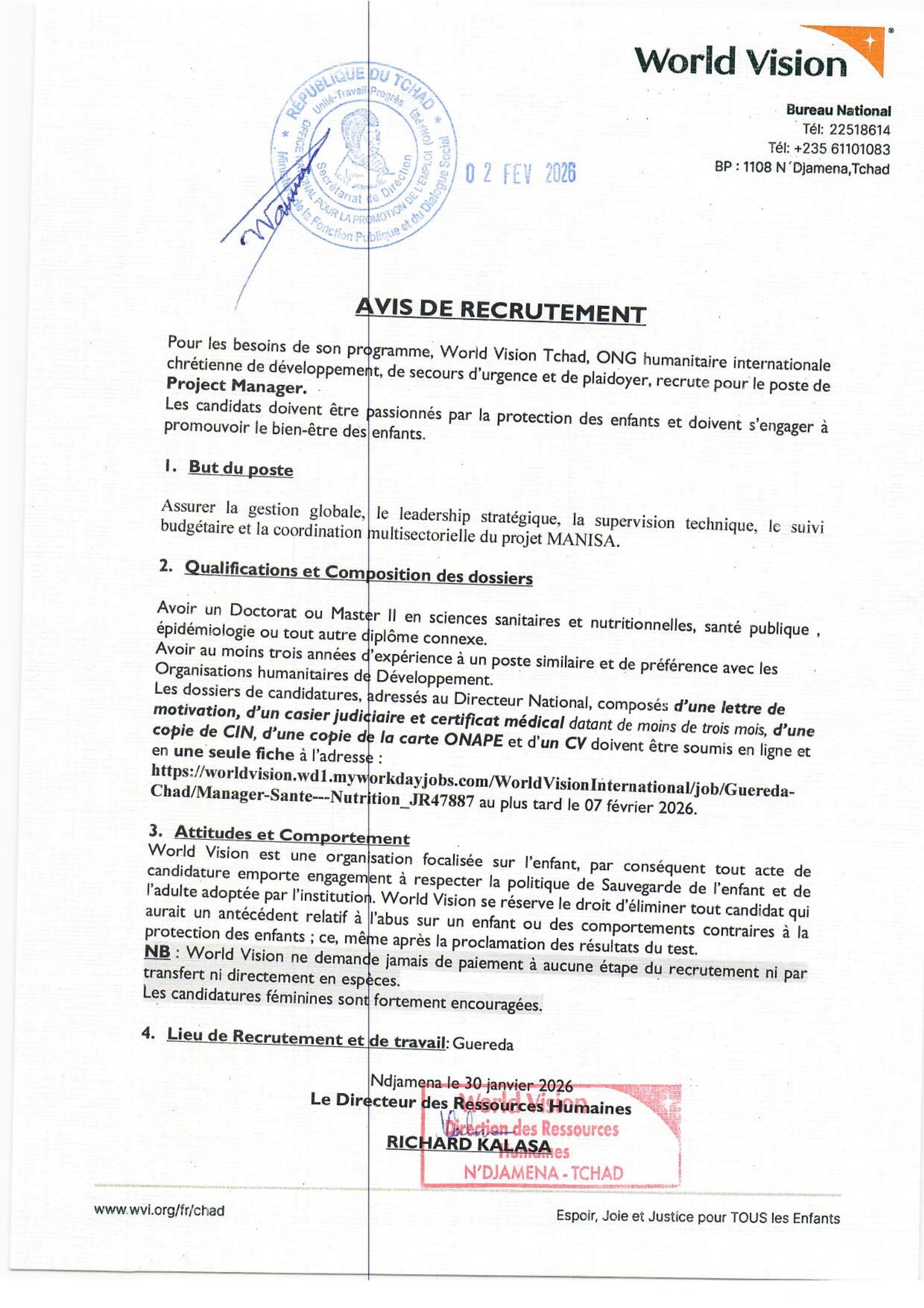 World Vision recrute pour le poste de Manager Santé & Nutrition, Guereda, Tchad Fév 2, 2026 World Vision recrute pour le poste de Manager Santé & Nutrition, Guereda, Tchad Postuler ici Share on FacebookTweetFollow usSaveLe Conseil Norvégien pour les Réfugiés recrute un(e) HR & Administration Manager, N’Djamena, TchadDans le cadre du projet RAPAR, la CARITAS Suisse lance un avis d’appel d’offres pour le recrutement d’un prestataire de services financiers pour la distribution du cash aux ménages vulnérables du département du Batha-Est et Assinet, TchadCatholic Relief Services recrute pour le poste de Deputy Chief of Party-Programming/Chef de Bureau, Farchana, TchadAppel à candidatures pour les bourses Erasmus Mundus EMLE, Europe