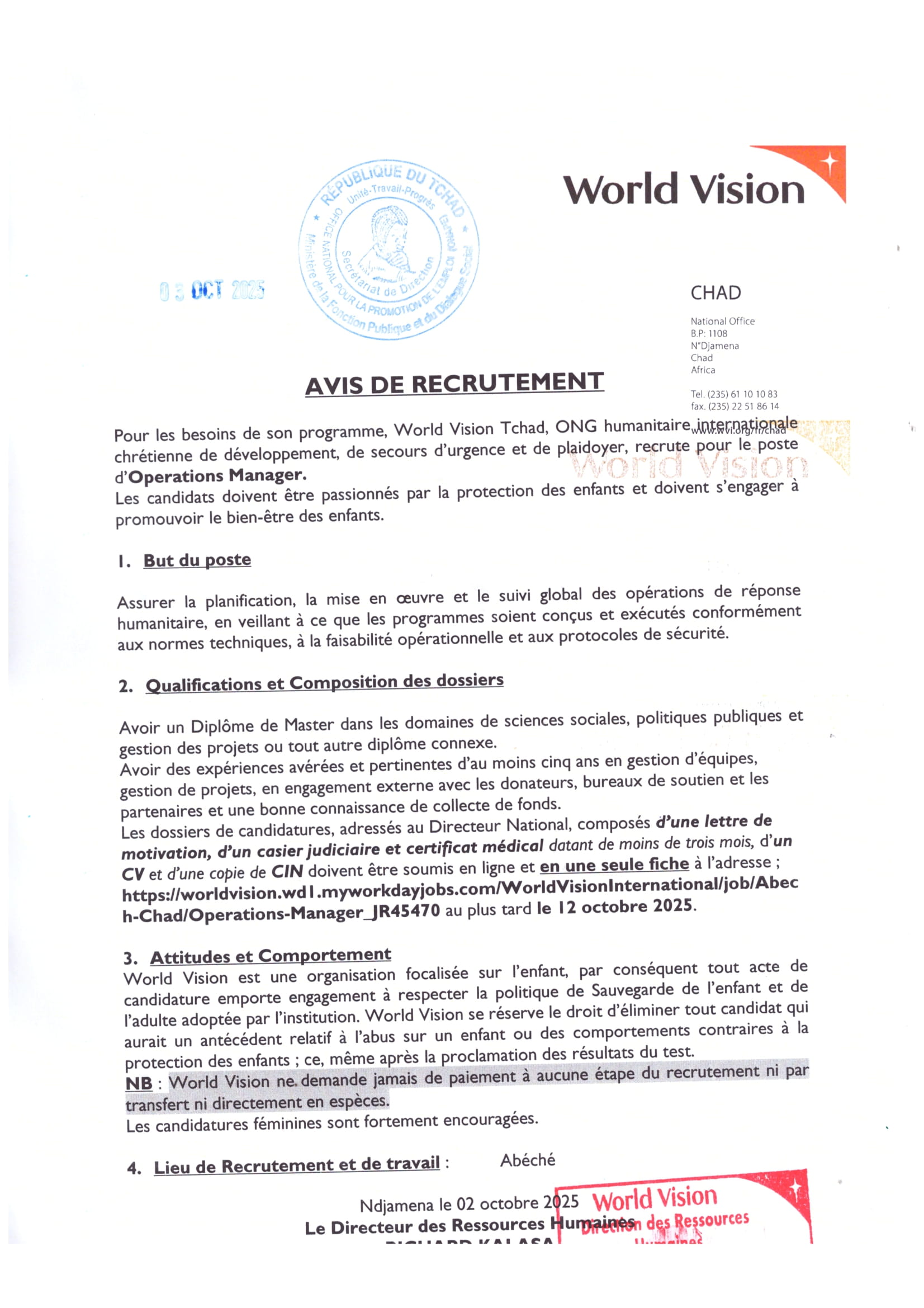 World Vision recrute pour le poste d’operations Manager, Abéché, Tchad Oct 3, 2025 World Vision recrute pour le poste d’operations Manager, Abéché, Tchad Postuler ici Share on FacebookTweetFollow usSaveCatholic Relief Services recrute un assistant administratif (H/F), Amzoer, TchadLe Conseil danois pour les réfugiés (DRC) recrute un(e) Stagiaire en consolidation de la paix – Travailleur temporaire, LibyeRecod Solutions IT recrute un stagiaire développeur (H/F), Dakar, SénégalAfrican Parks recrute un(e) Responsable Financier(e), Park National de Zakouma, Tchad