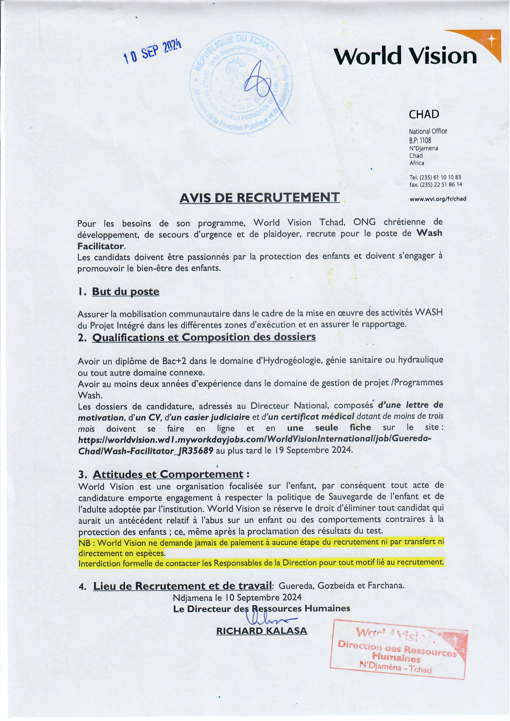 World Vision recrute un(e) Wash Facilitator pour les besoins de son programme, Guereda, Gozbeida, Farchana, Tchad Sep 10, 2024 World Vision recrute un(e) Wash Facilitator pour les besoins de son programme, Guereda, Gozbeida, Farchana, Tchad Share on FacebookTweetFollow usSaveL’Organisation Humanitaire pour le Développement Local (OHDEL) recrute quatre (04) Spécialistes en Entreprenariat et Inclusion Economique, Sila, TchadLe Mécanisme international appelé à exercer les fonctions résiduelles des Tribunaux pénaux (Mécanisme) recherche un(e) Stagiaire juridique (Cat. II-Équipe), La Haye, Pays-BasL’ONG Concordis International Trust recrute un(e) stagiaire en Logistique et Administration, Ngaoundéré, CamerounAppel à candidatures pour le programme de stage de l’Union Africaine (UA) 2026