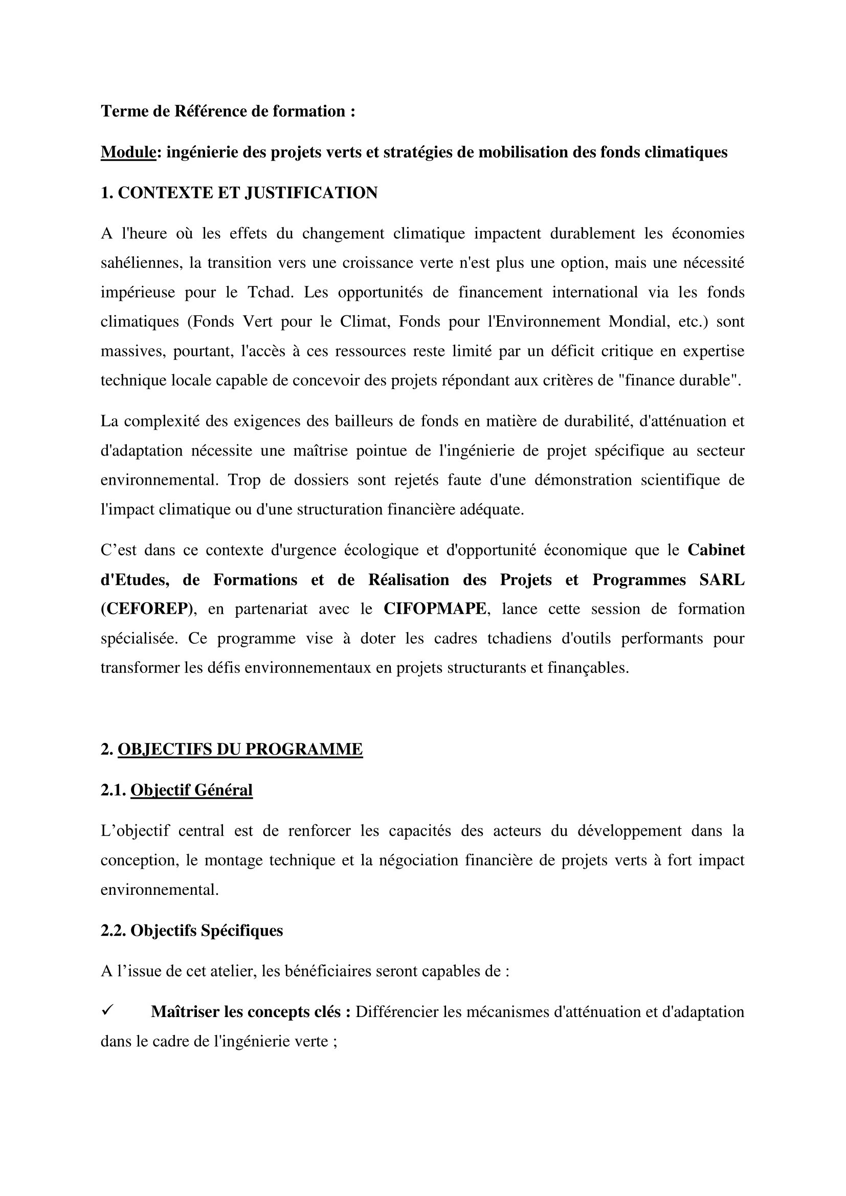 Le Cabinet CEFOREP SARL, en partenariat avec le CIFOPMAPE, organise une formation en Ingénierie des projets verts et Stratégies de mobilisation de fonds climatiques, N’Djamena, Tchad