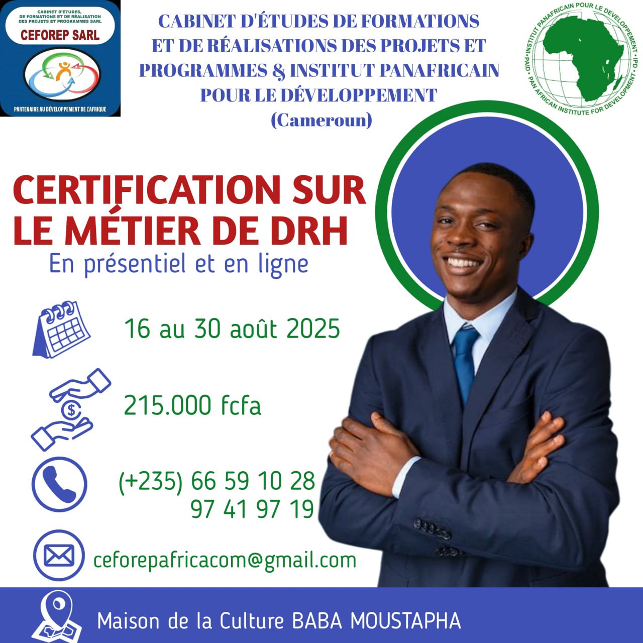 Le Cabinet CEFOREP SARL, en partenariat avec l’Institut Panafricaine pour le Développement (IPD-Cameroun), organise une certification sur le métier du DRH, N’Djamena, Tchad
