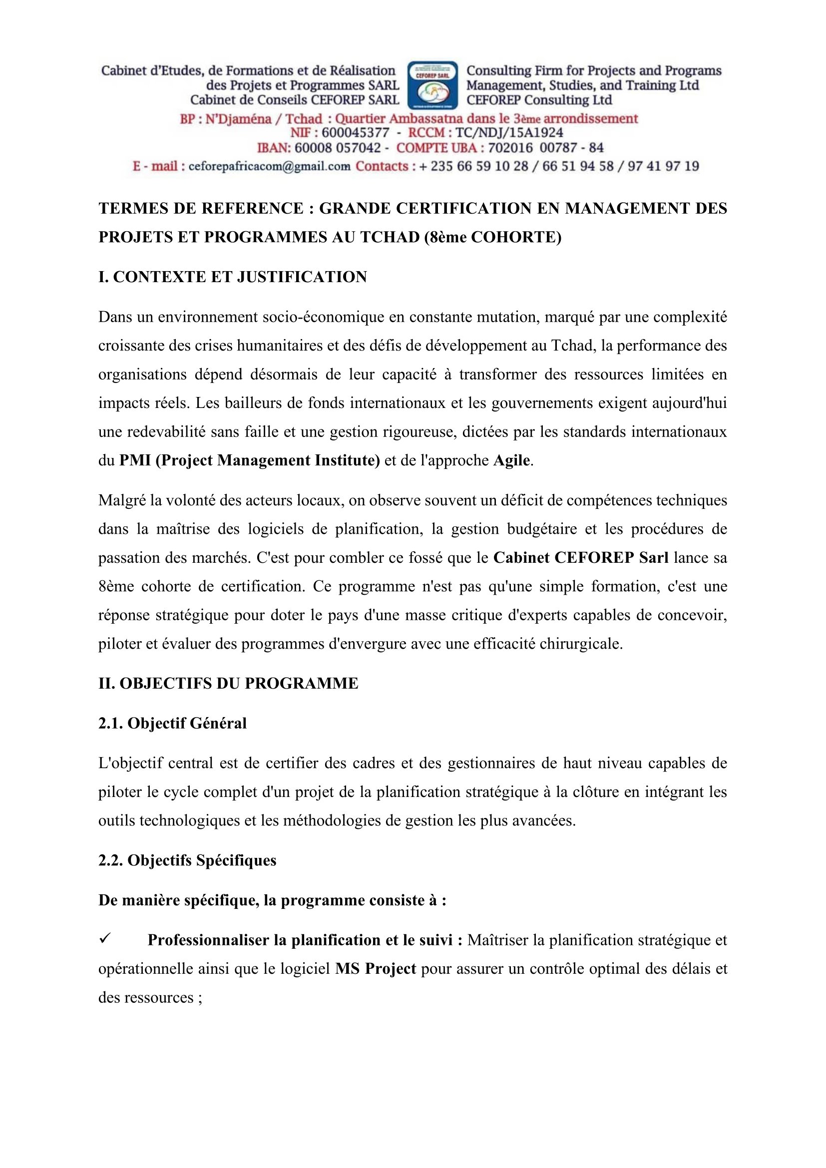 Le Cabinet CEFOREP SARL lance sa 8ème cohorte de certification en Management des Projets et Programmes, N’Djamena, Tchad Mar 4, 2026 Le Cabinet CEFOREP SARL lance sa 8ème cohorte de certification en Management des Projets et Programmes, N’Djamena, Tchad Share on FacebookTweetFollow usSaveL’ONG Geres recrute un stagiaire levé de fonds privés (H/F), Aubagne, FranceUNICEF recherche un stagiaire Supply & Logistics, Burkina Faso Appel à candidatures pour les bourses d’études Internationales, SingapourINKOMOKO lance un avis d’appel d’offre pour la rénovation des espaces de bureau (camp de réfugiés), Farchana, Amleyouna, Tchad