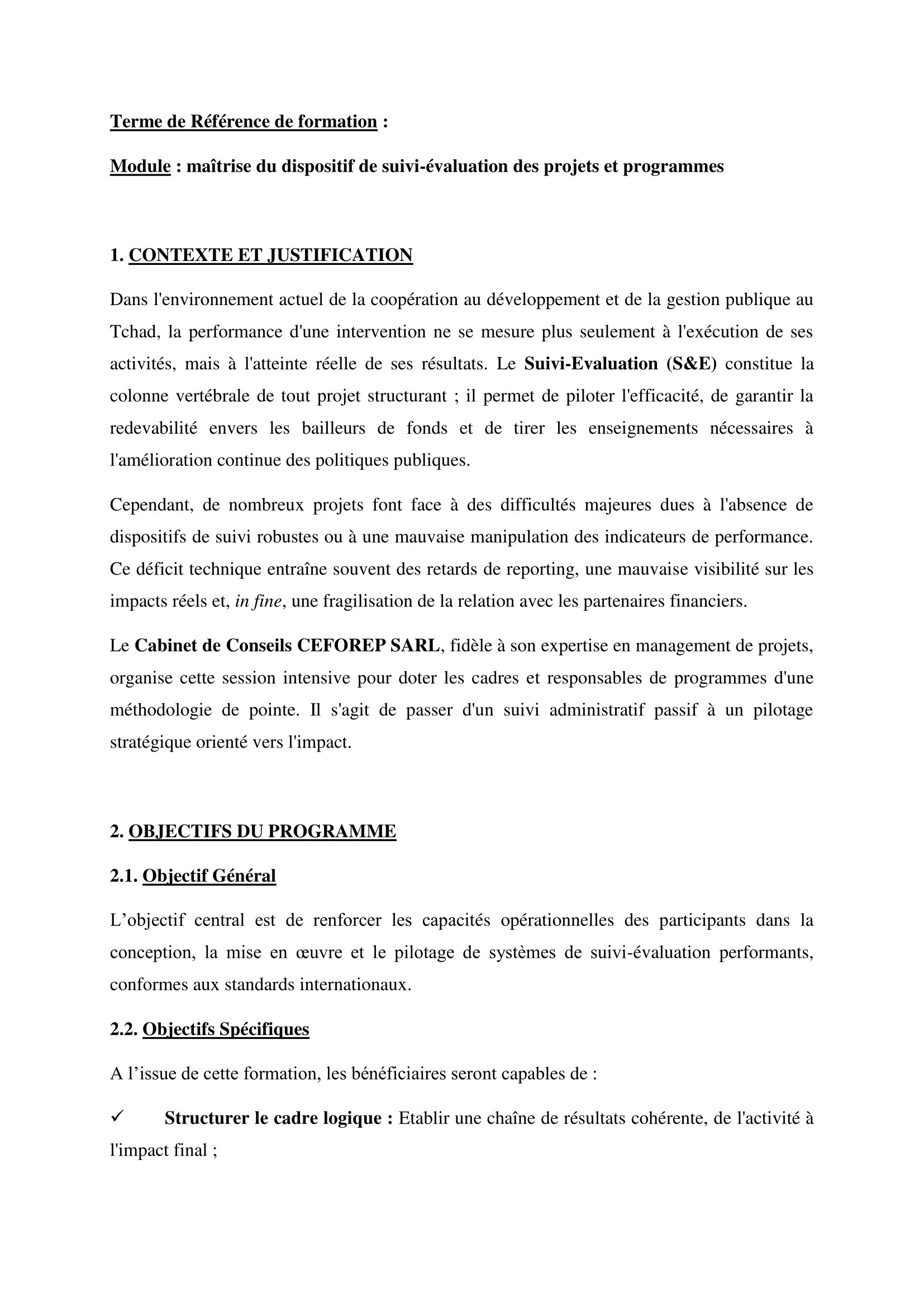 Le Cabinet CEFOREP SARL organise une formation sur la Maîtrise du dispositif de suivi-évaluation des projets et programmes, N’Djamena, Tchad Fév 12, 2026 Le Cabinet CEFOREP SARL organise une formation sur la Maîtrise du dispositif de suivi-évaluation des projets et programmes, N’Djamena, Tchad Share on FacebookTweetFollow usSaveDanChurchAid (DCA) recherche un(e) stagiaire RH, MaliLe NRC recrute un Education Officer (H/F), Adré, TchadCatholic Relief Services (CRS) lance un avis d’appel d’offres pour la fourniture et la livraison de seize climatiseurs, N’Djamena, TchadCEFOREP SARL organise une formation en HQSE & Montage des DAO, Gestion de Projets BTP & MS Project, N’Djamena, Tchad