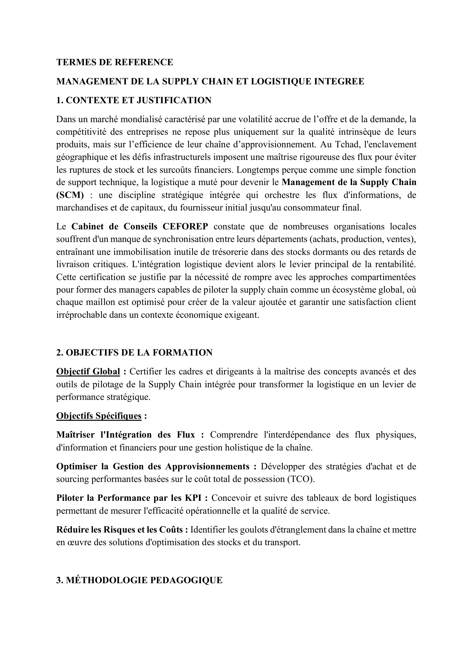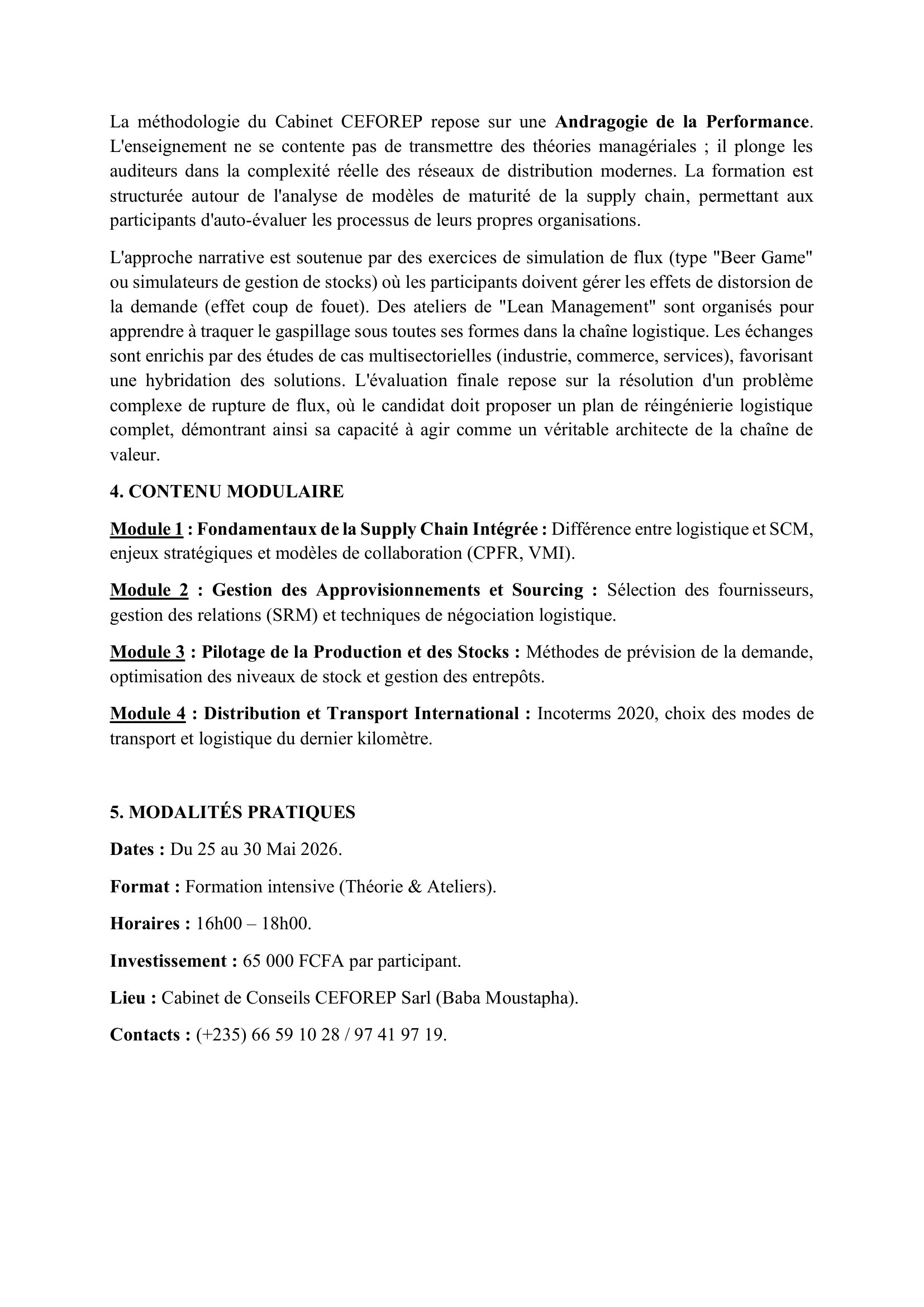 Le cabinet CEFOREP SARL organise une formation sur le Management de la Supply Chain et Logistique Intégrée Avr 24, 2026 Le cabinet CEFOREP SARL organise une formation sur le Management de la Supply Chain et Logistique Intégrée Share on FacebookTweetFollow usSaveLe Conseil Danois pour les Refugiés (DRC) lance un avis d’appel à manifestation d’intérêt pour développer la liste des fournisseurs, Adré, TchadWorld Vision recrute pour le poste d’administration et logistic coordinator, N’Djamena, TchadLe cabinet CEFOREP SARL, en partenariat avec des institutions de renom, vous propose un programme de grandes certifications internationales.Programme de bourses d’études de l’université du Sichuan, Chine