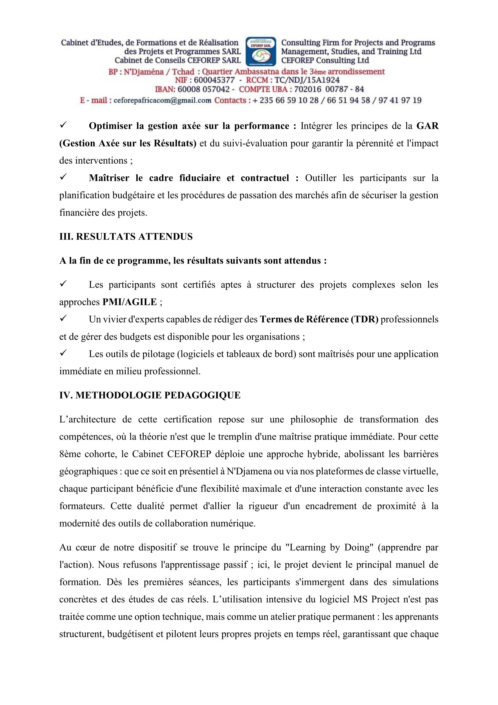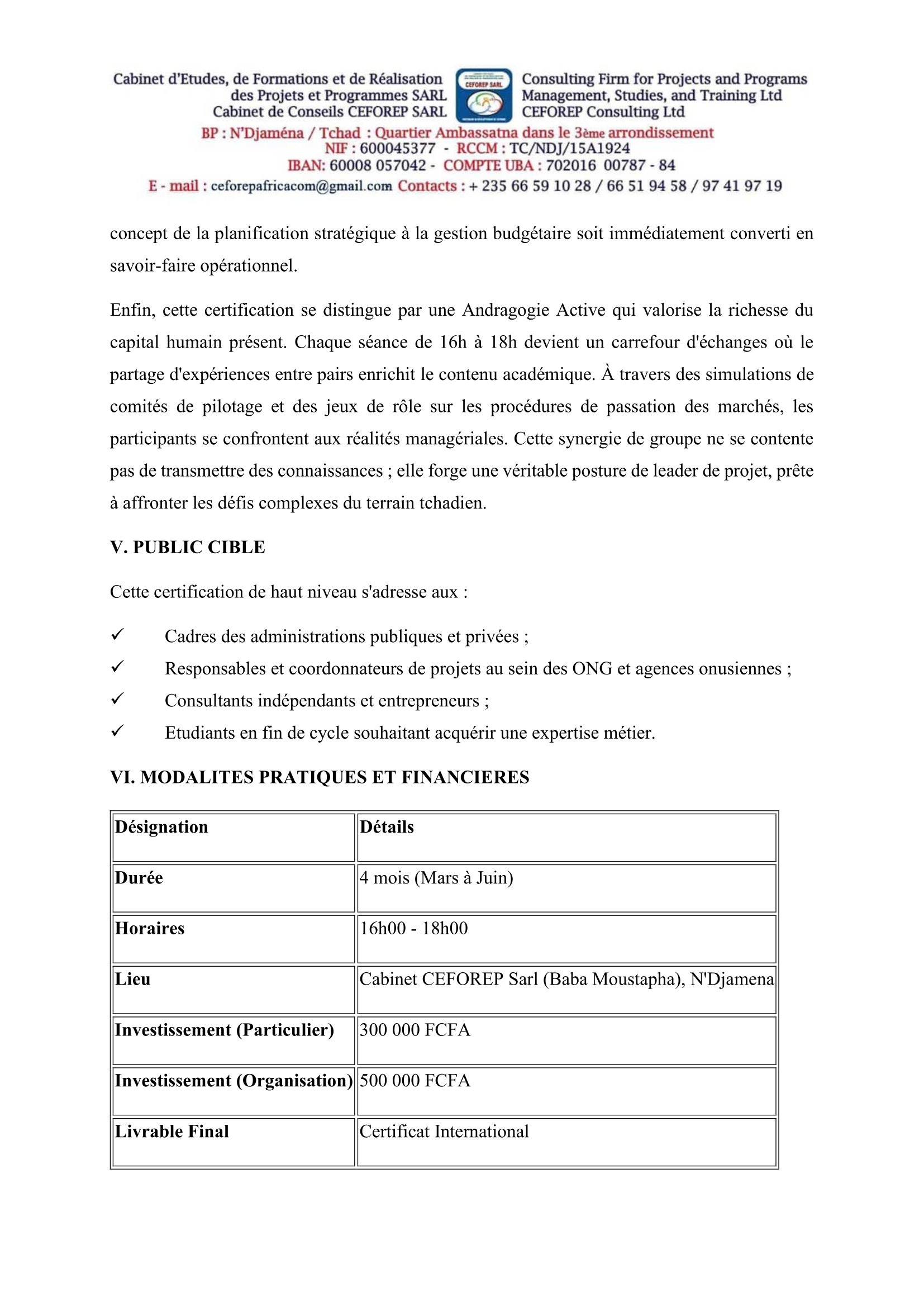 Le Cabinet CEFOREP SARL organise une grande certification en Management des projets et programmes, Tchad Mar 13, 2026 Le Cabinet CEFOREP SARL organise une grande certification en Management des projets et programmes, Tchad Share on FacebookTweetFollow usSaveGIZ recrute un expert en crise, conflits et catastrophes (H/F), N’Djamena, TchadMédecins Sans Frontières (MSF) recrute un stagiaire en communication digitale, Dakar, SénégalLe Centre de services régional des Nations Unies à Entebbe (RSCE) recrute un Stagiaire – Technologie de l’information, Entebbe, OugandaBourses d’études pour les leaders mondiaux émergents de l’American University.