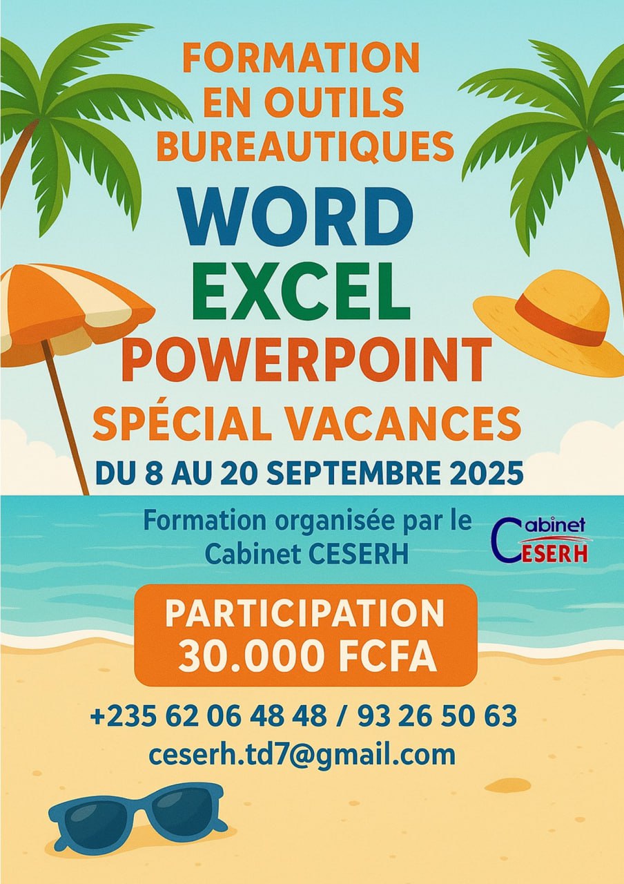 C’est dans ce cadre que le Cabinet CESERH organise une formation pratique et intensive en bureautique, spécialement dédiée à la période des vacances, afin de permettre aux participants de renforcer leurs capacités et d’améliorer leur employabilité.