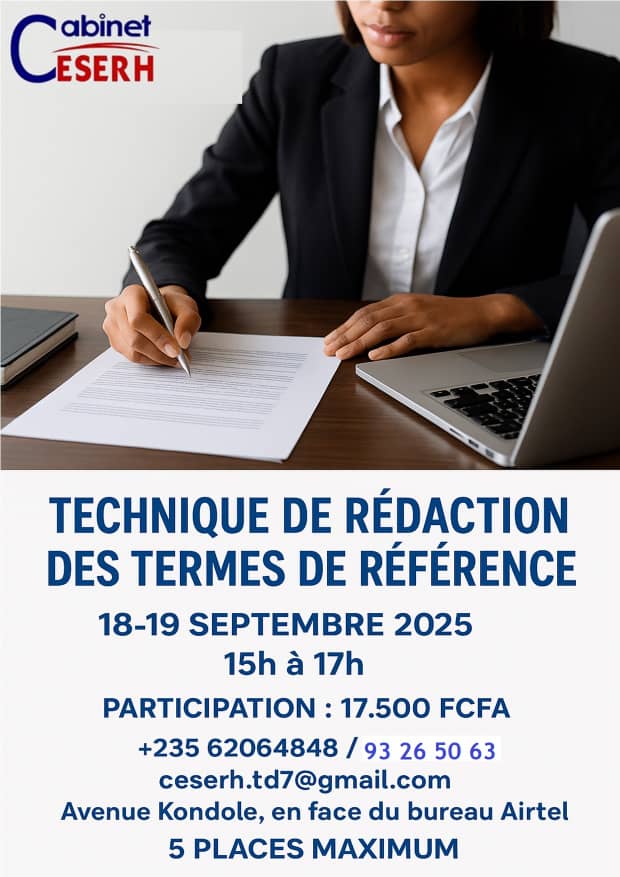 Le Cabinet CESERH, spécialisé dans le renforcement de capacités et l’ingénierie de formation, propose une session intensive de formation sur les techniques de rédaction des TDR professionnels, N’Djamena, Tchad