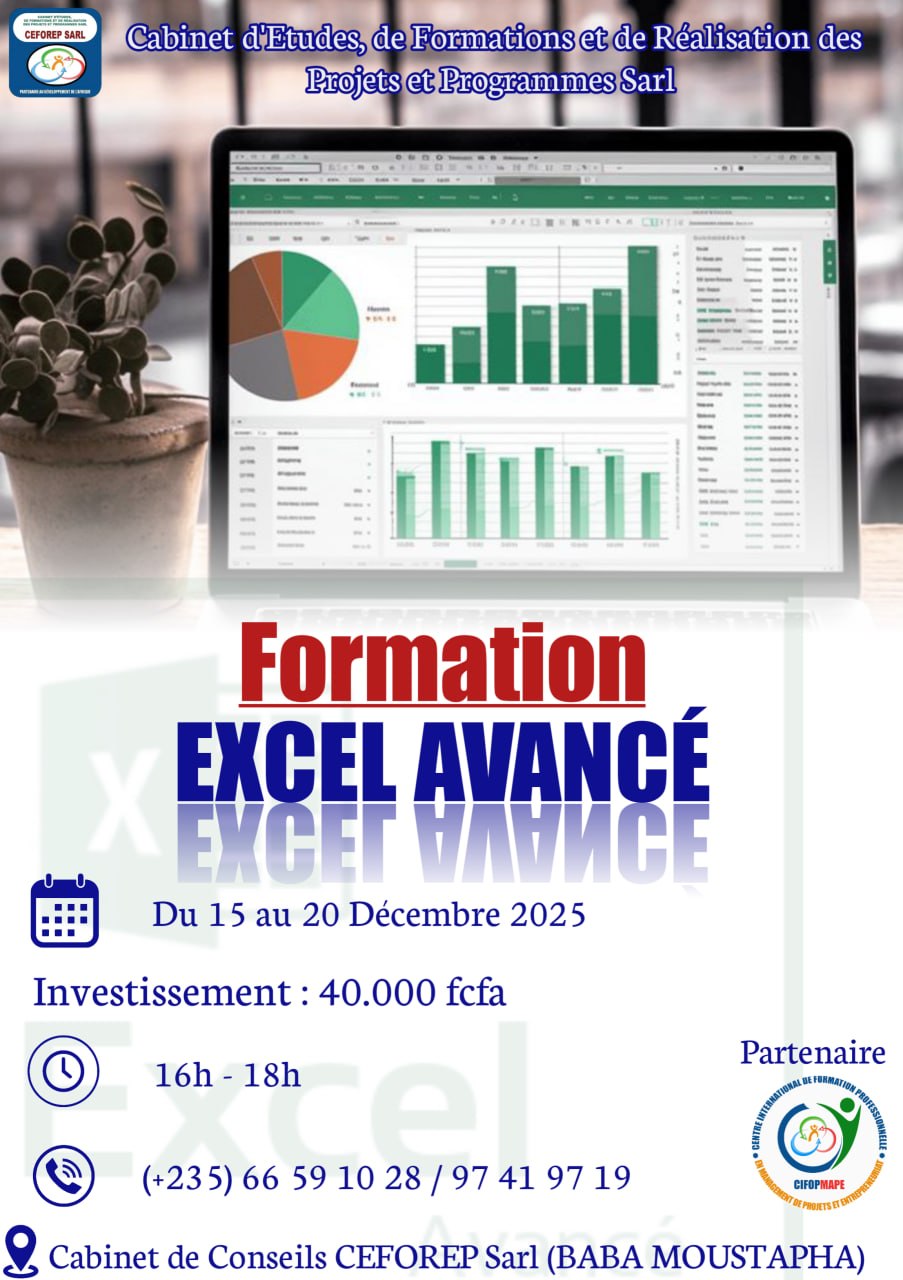 Le Cabinet de Conseils CEFOREP Sarl vous donne les clés pour maîtriser les fonctions complexes, les tableaux de bord dynamiques et l’analyse de données qui font la différence dans votre carrière.