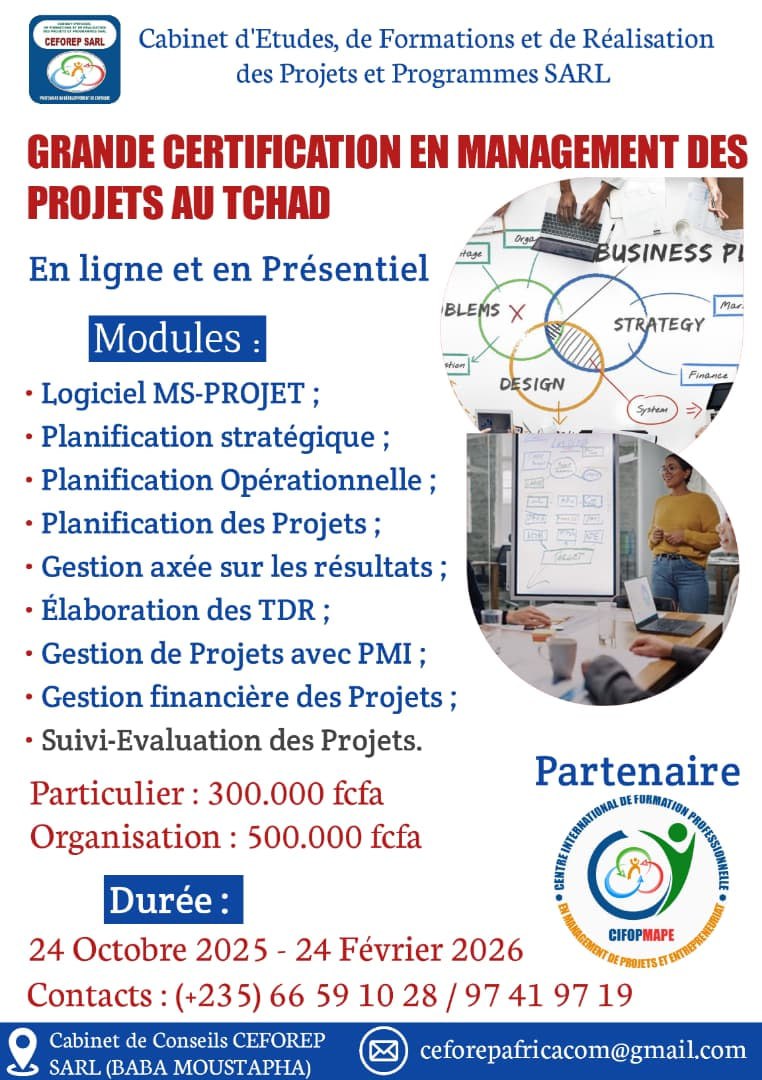 Le Cabinet de Conseils CEFOREP SARL organise une grande certification en management des projets, Tchad