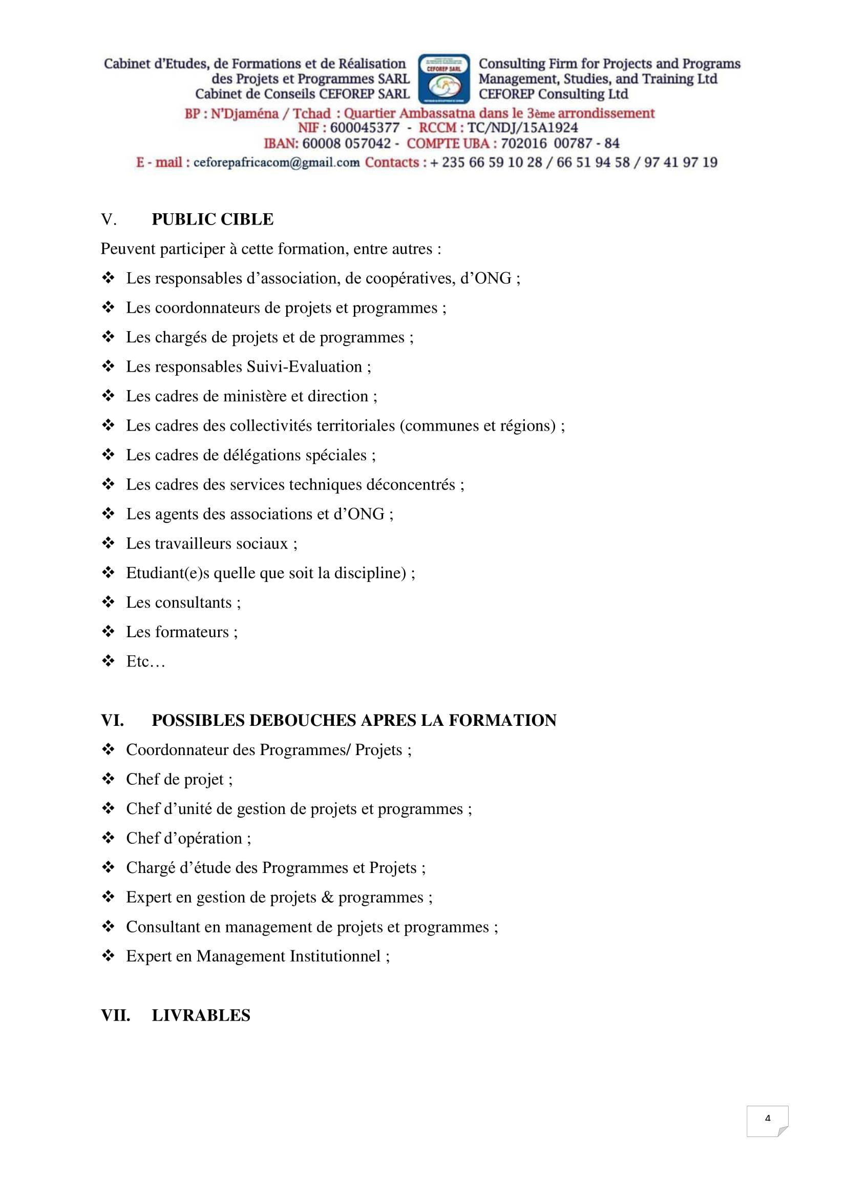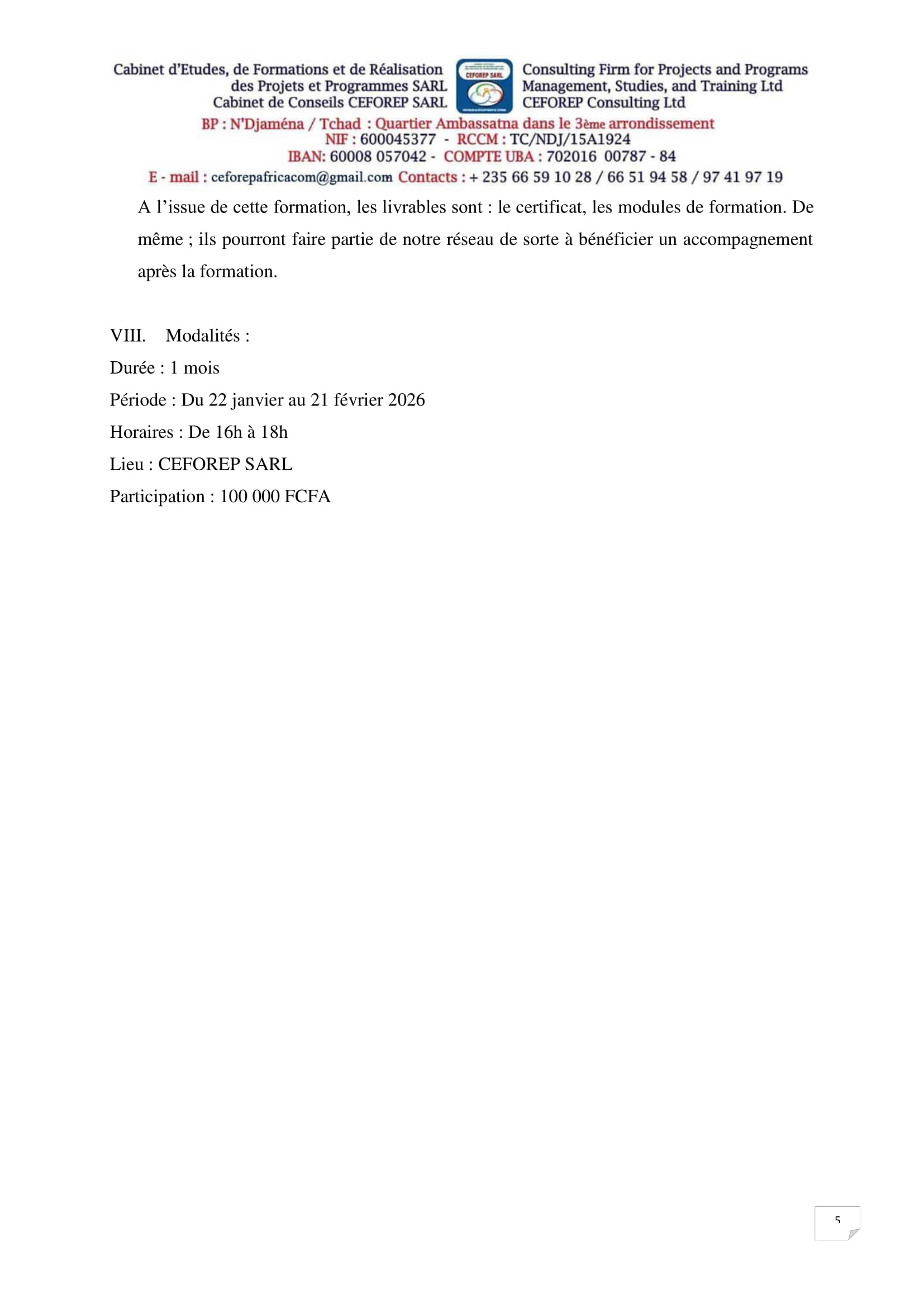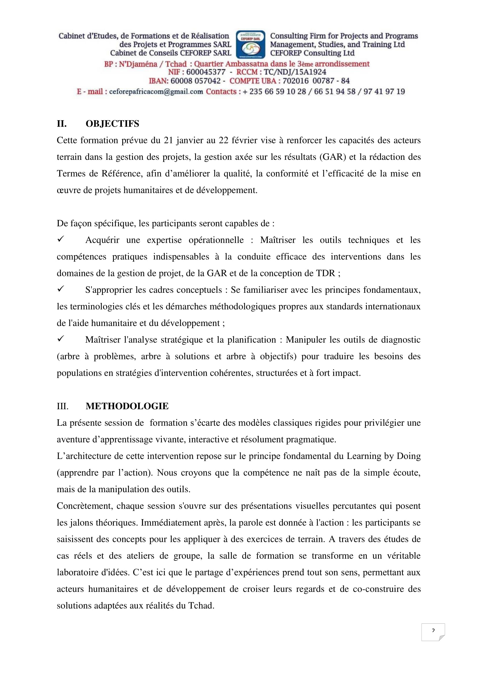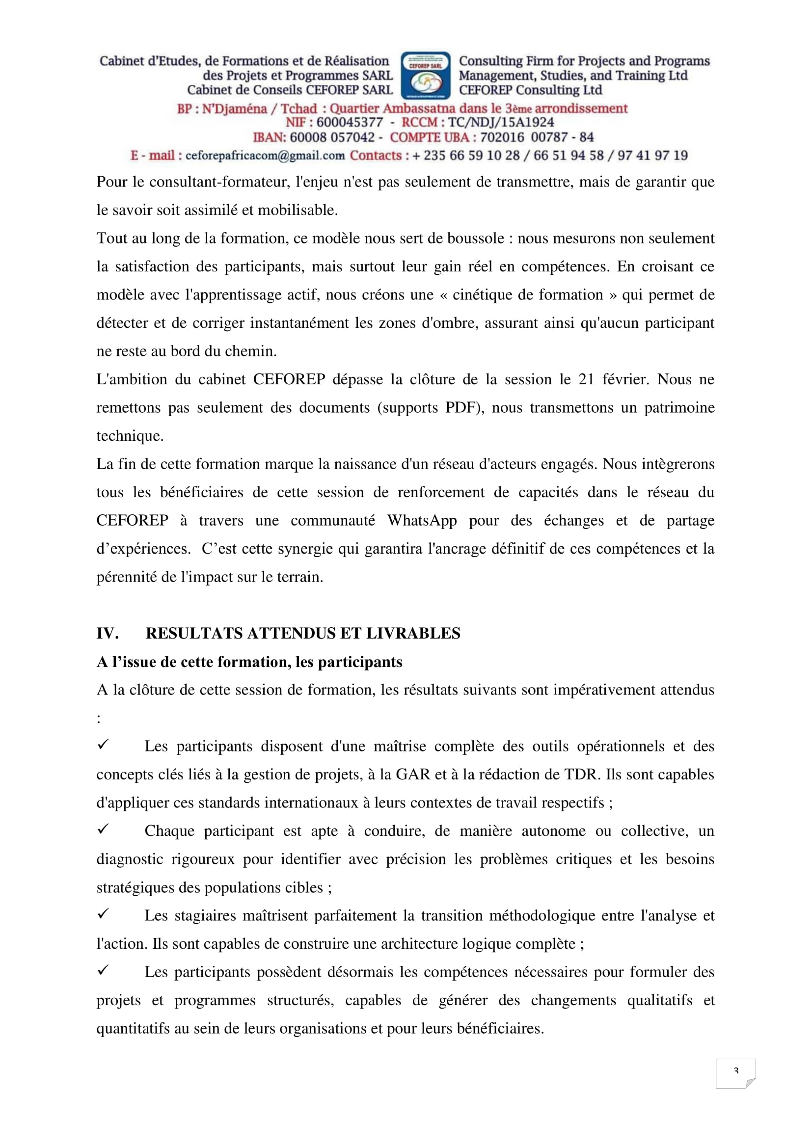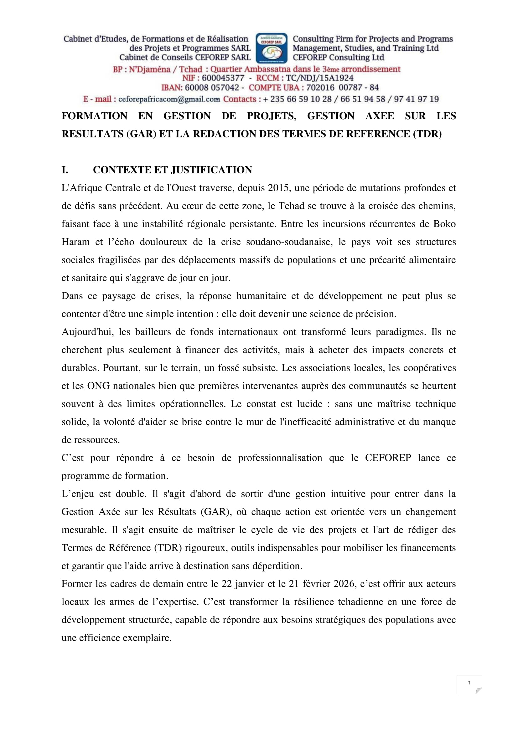 Le Cabinet d’Etudes, de Formation et de Réalisation des Projets et Programmes SARL (CEFOREP SARL) organise une formation en Gestion Axée sur les Résultats (GAR) et la rédaction des Termes de Références (TDR), N’Djamena, Tchad