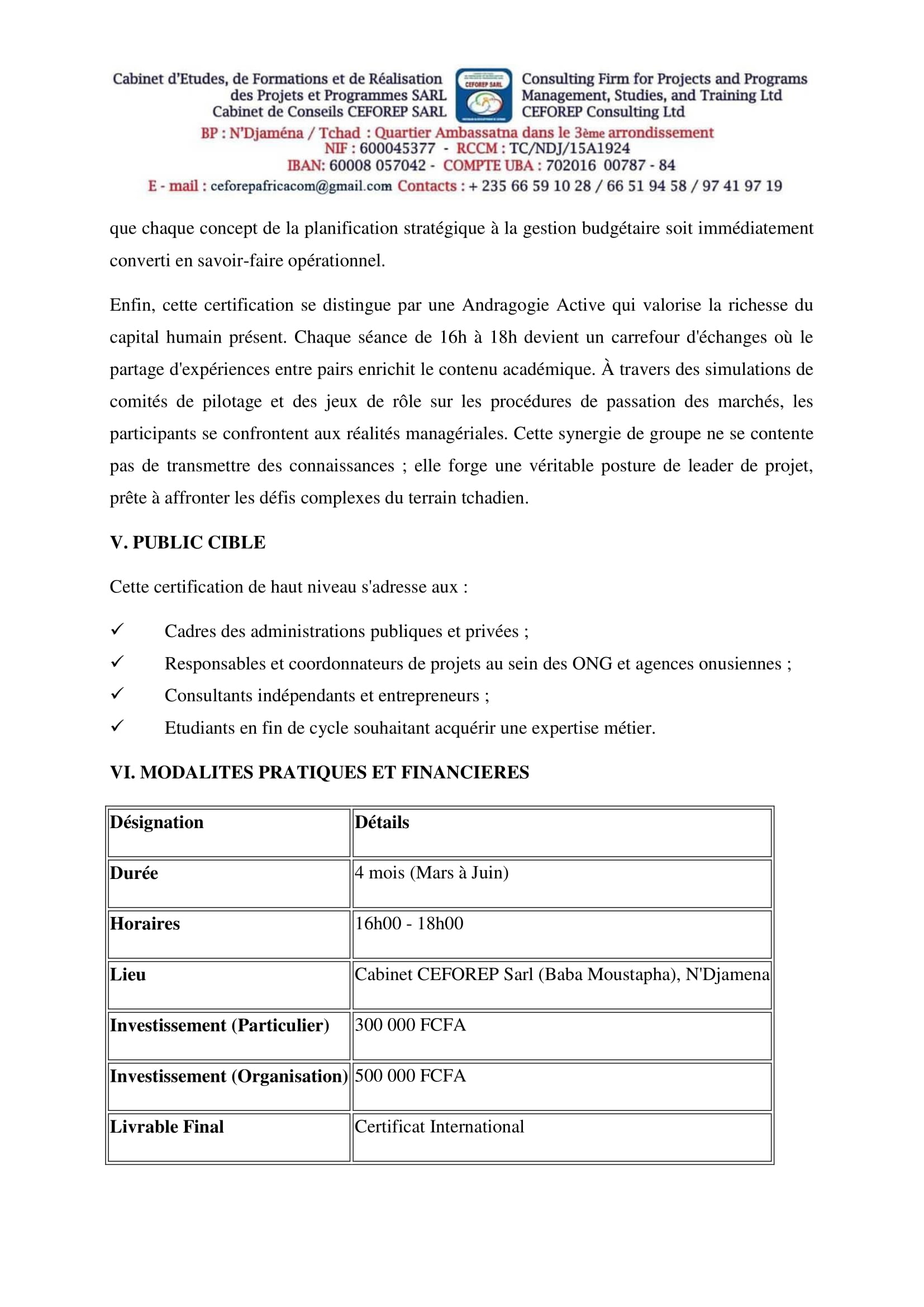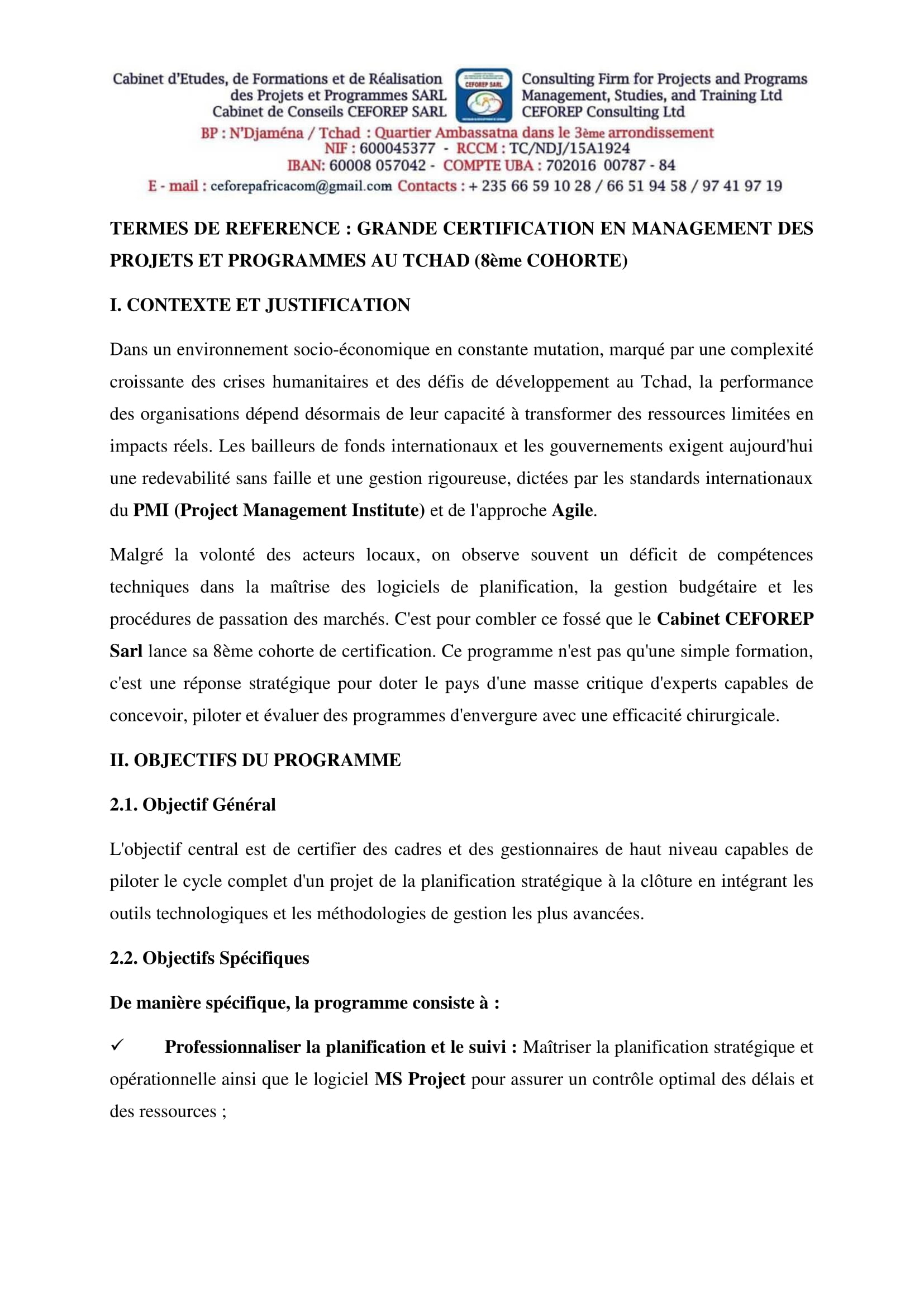 Le Cabinet d’Etudes, de Formation et de Réalisation des Projets et Programmes SARL (CEFOREP SARL) organise une grande certification en Management des Projets, N’Djamena, Tchad