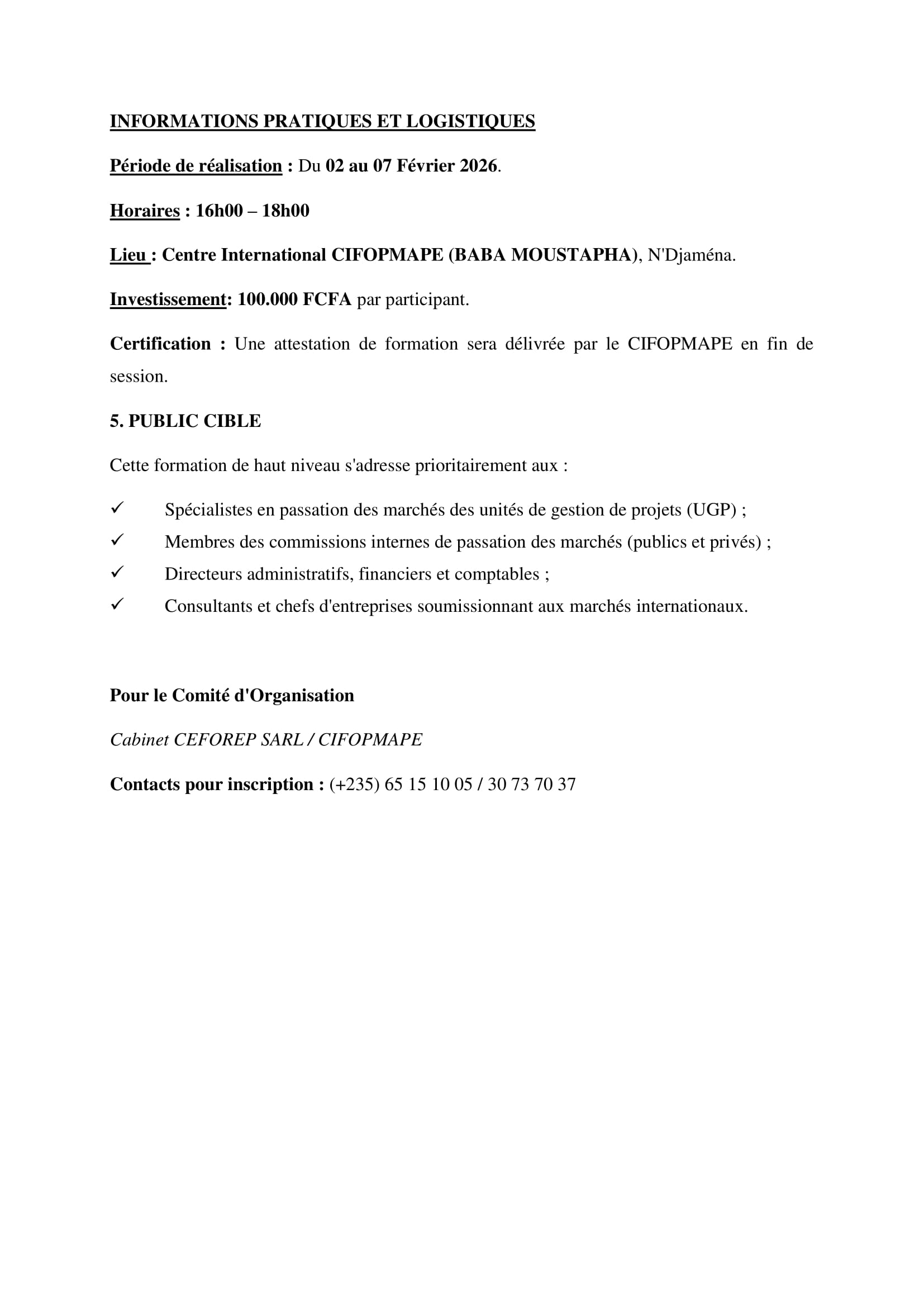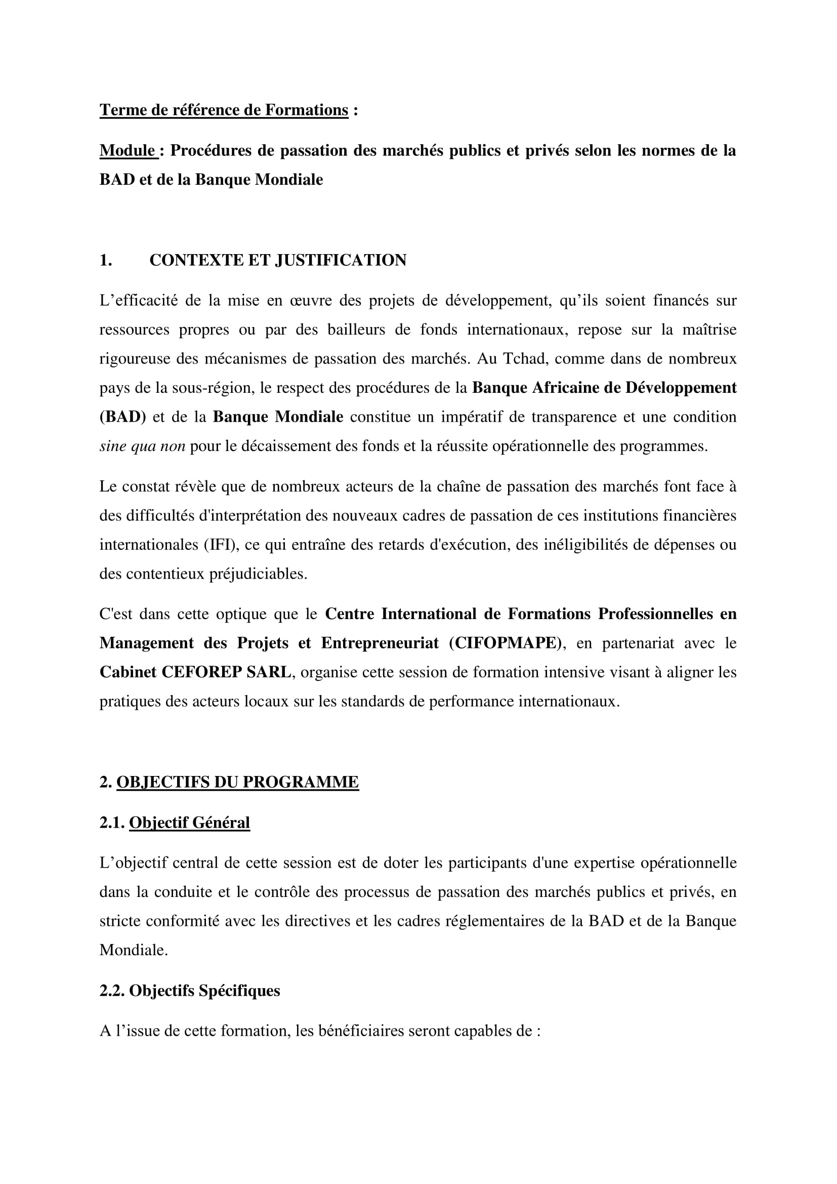 le Cabinet d’Etudes, de Formations et de Réalisation des Projets et Programmes SARL (CEFOREP), en partenariat avec le CIFOPMAPE, lance une session de formation sur les Procédures de Passation de Marchés Publics et Privés selon les normes de la BAD et de la Banque Mondiale, N’Djamena, Tchad