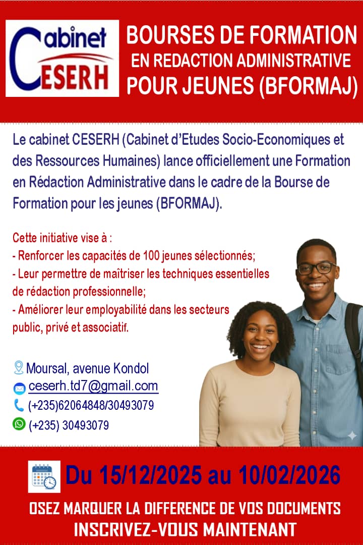 Le Cabinet d’Etudes Socio-Economiques et des Ressources Humaines -CESERH) lance une formation en rédaction administrative dans le cadre de la bourse de formation pour les jeunes (BFORMAJ), N’Djamena, Tchad