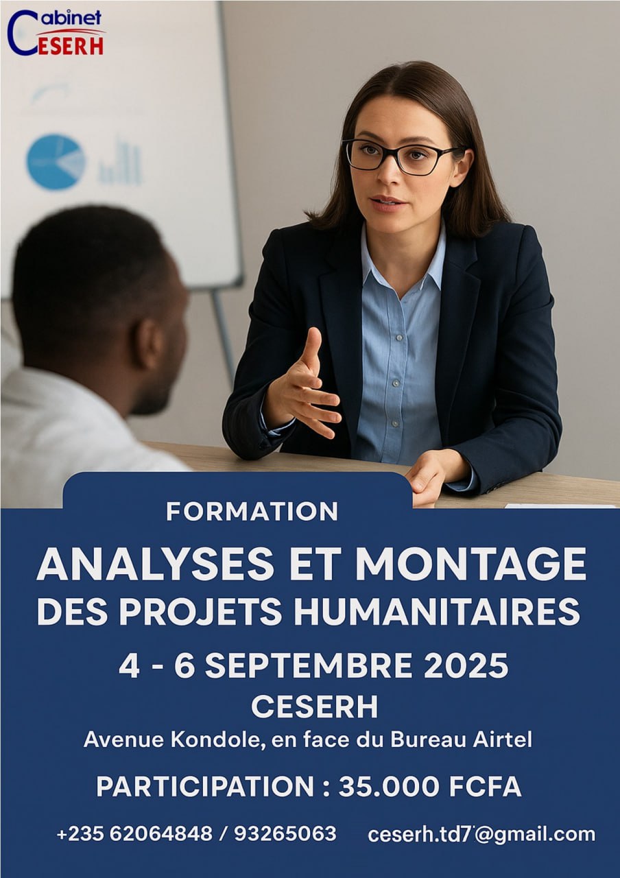 Le Cabinet d’Études Socio-Economiques et des Ressources Humaines (CESERH) organise une formation spécialisée sur l’analyse et le montage des projets humanitaires, N’Djamena, Tchad