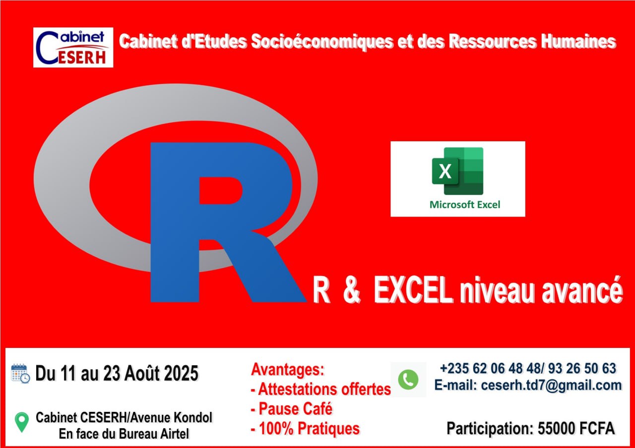 Le Cabinet d’Etudes Socio-économiques et des Ressources Humaines organise une formation sur Excel niveau avancé et langage R, N’Djamena, Tchad