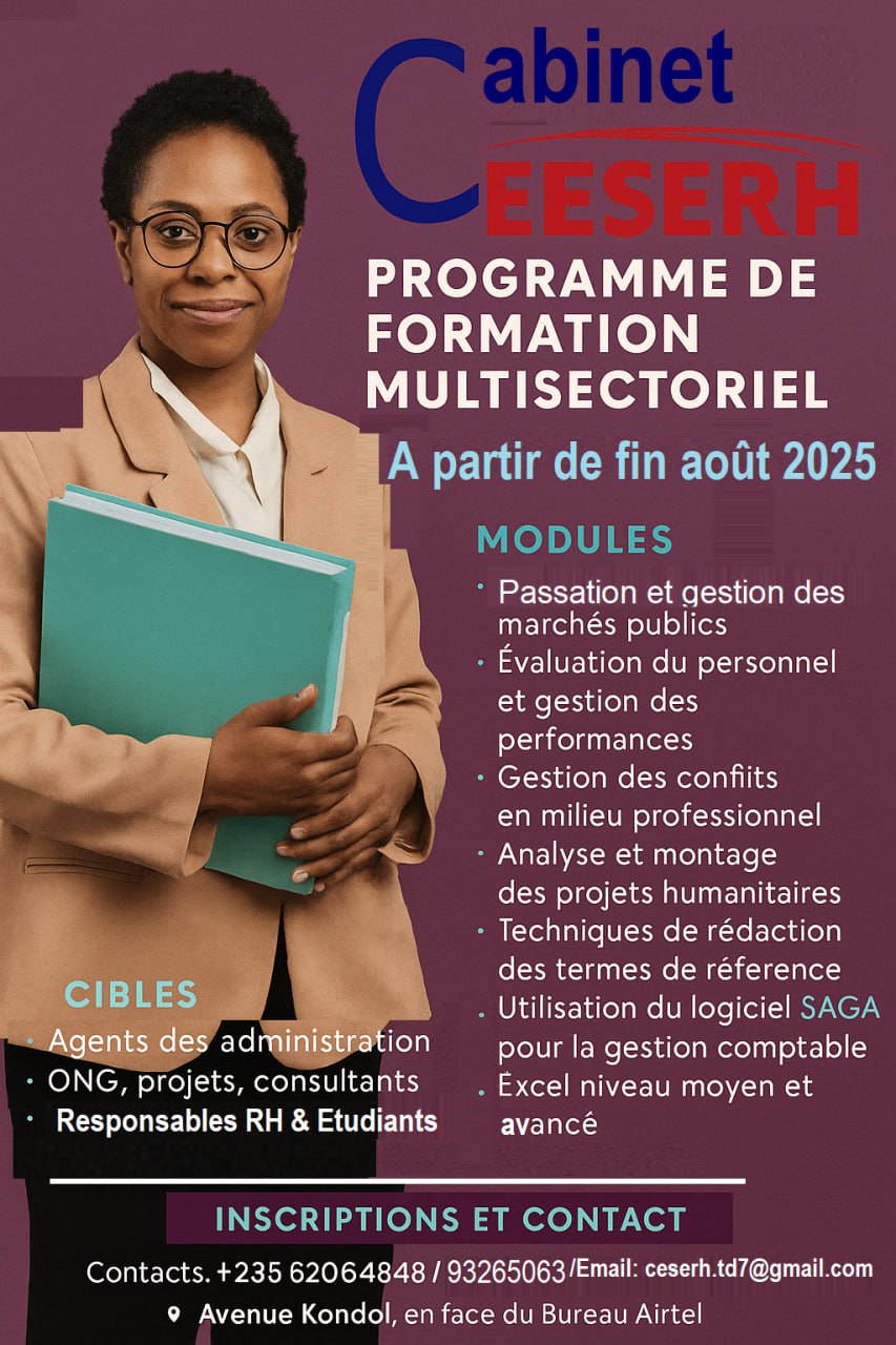 Lieu : N’Djaména, au siège du Cabinet CESERH situé en face du bureau Airtel sur l’Avenue Kondol