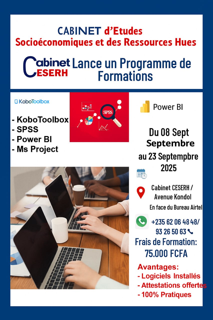 le Cabinet d’Etudes Socioéconomiques et des Ressources Humaines (CESERH) lance un programme de formations sur les logiciels de traitement et d’analyse de données, N’Djamena, Tchad